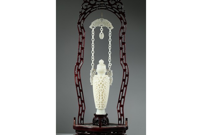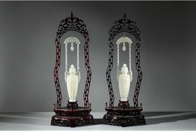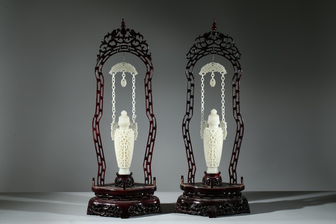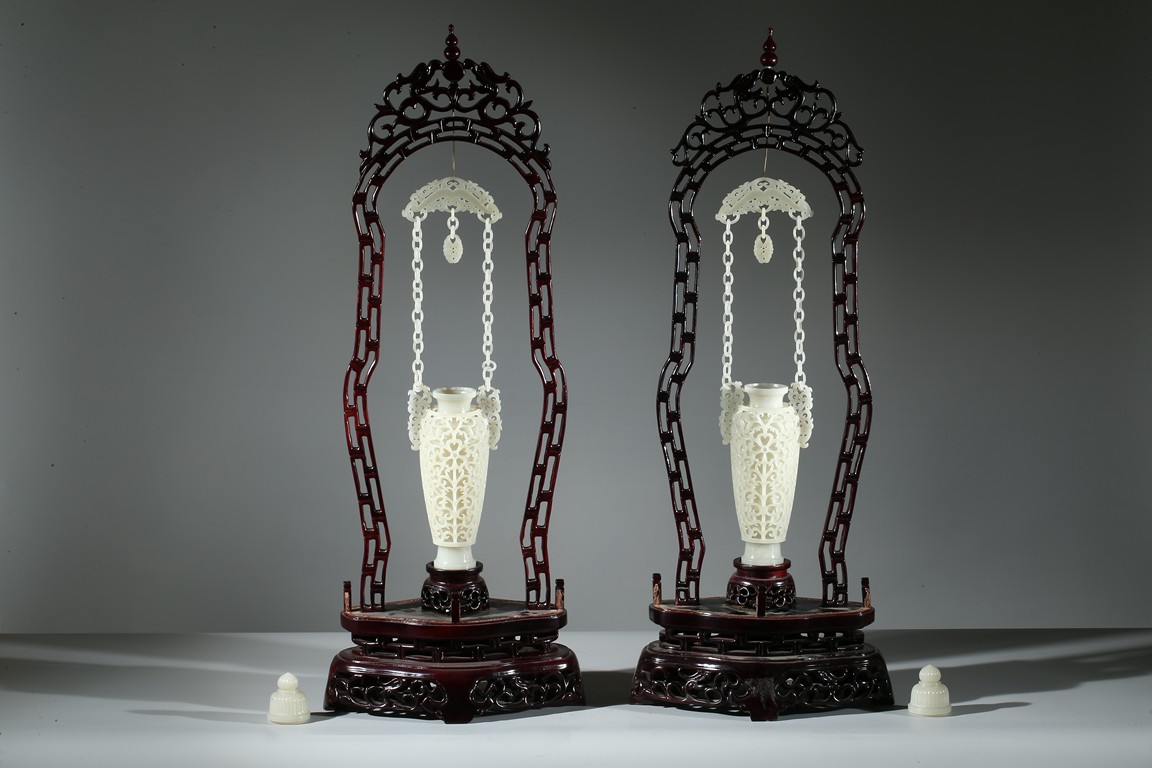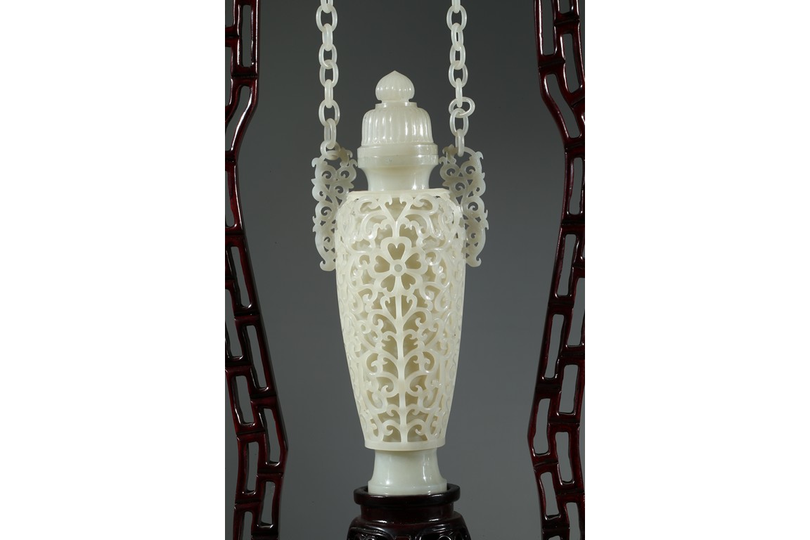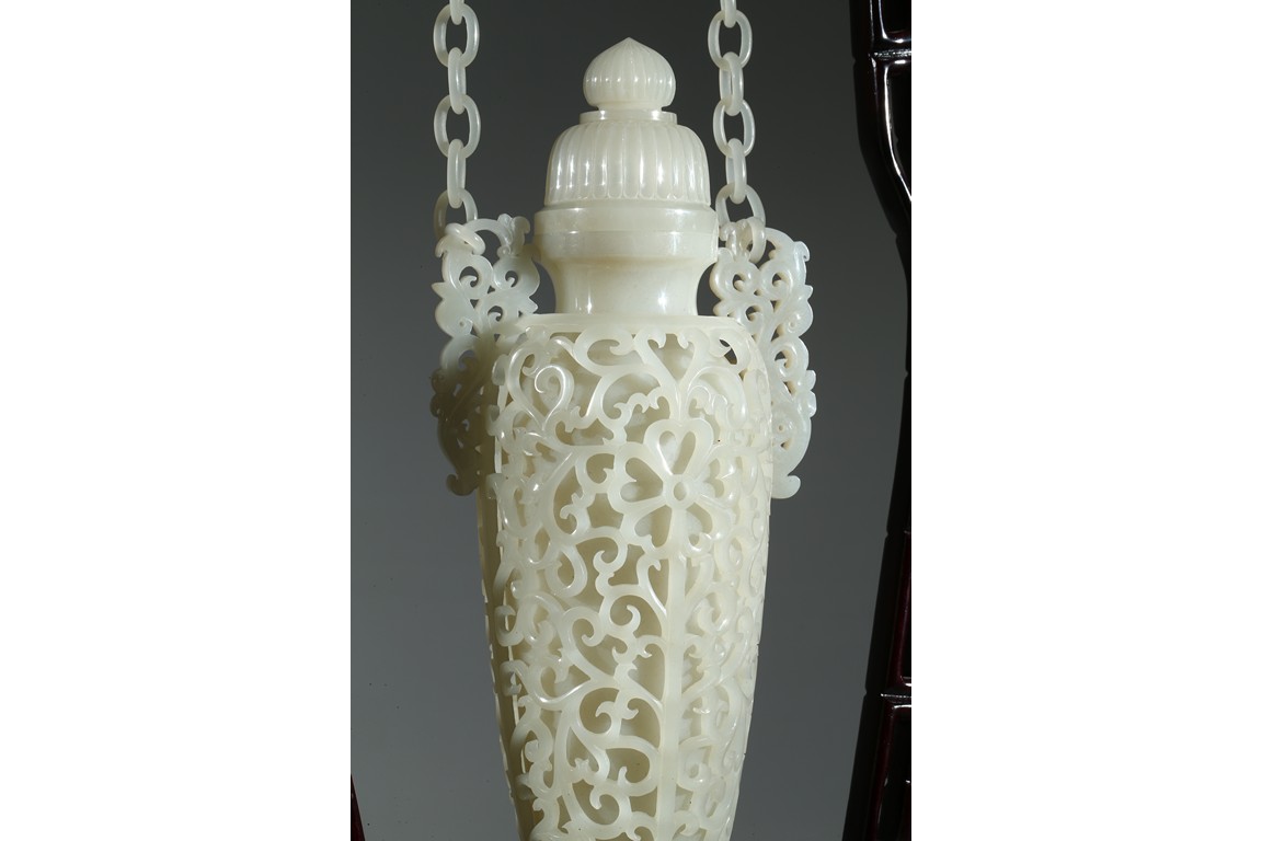 Each finely reticulated to the exterior with dense curling foliate, the shoulder flanked by similar reticulated handles, which attached to two interlinked chains suspended from a panel. Wood stand. Qing Dynasty period.