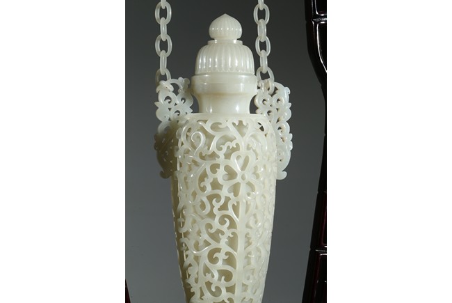 此拍品“清白玉雕鏤空雙耳吊瓶一對,尺寸:高41. 5cm。直徑10cm,所用玉料上等,雕工精細,所雕鏤空層層相連,佈局合理,大氣,保存完好,彌足珍貴。” 來源:舊金山藏家收藏