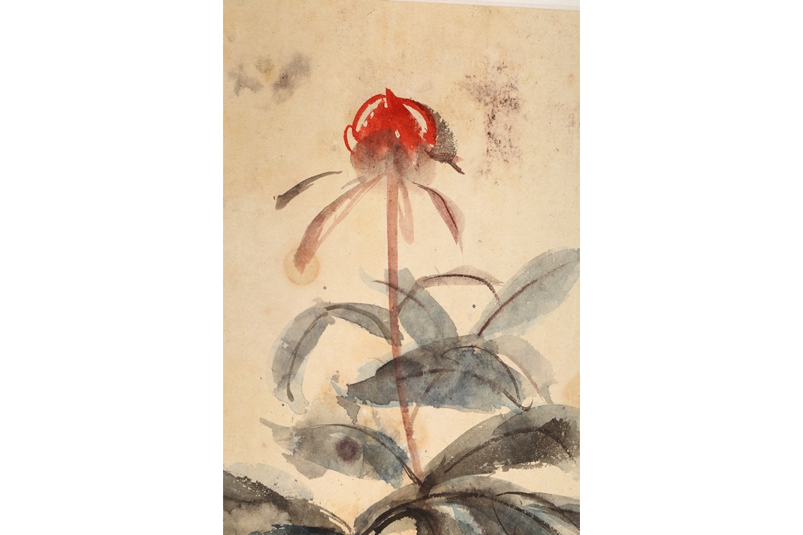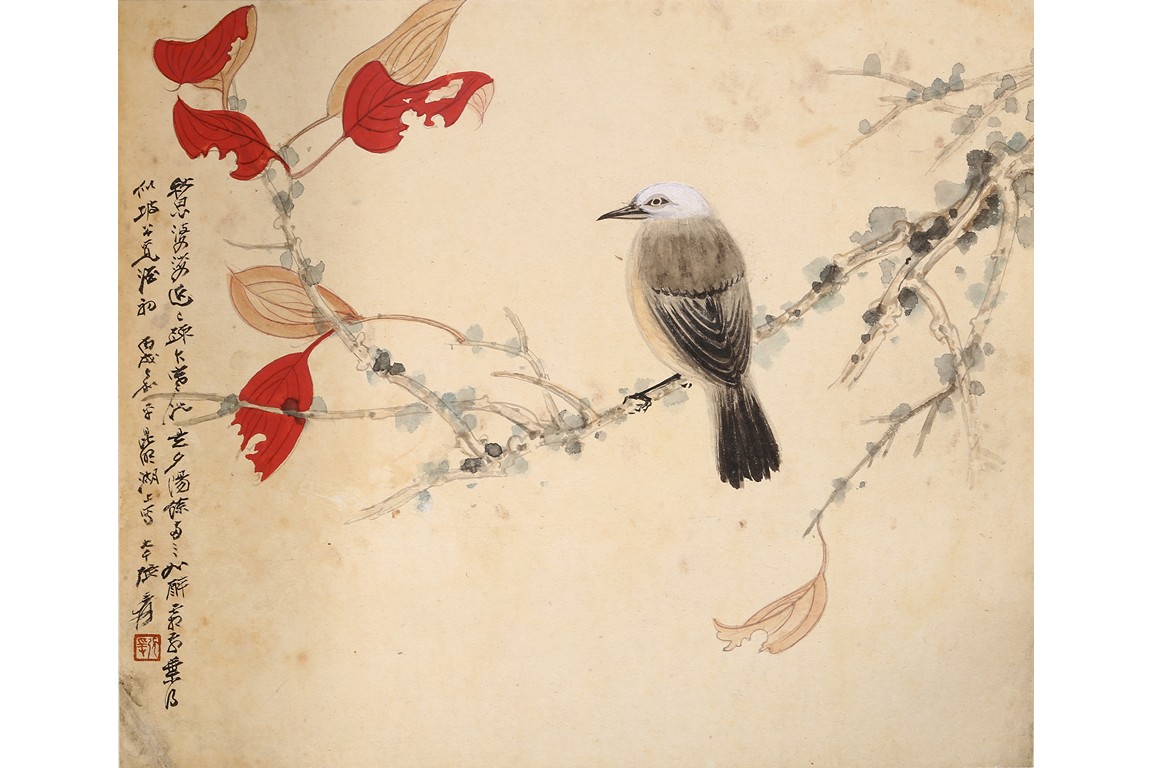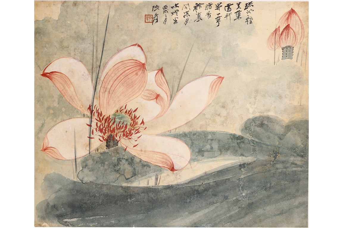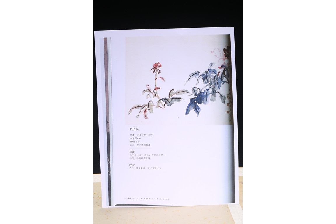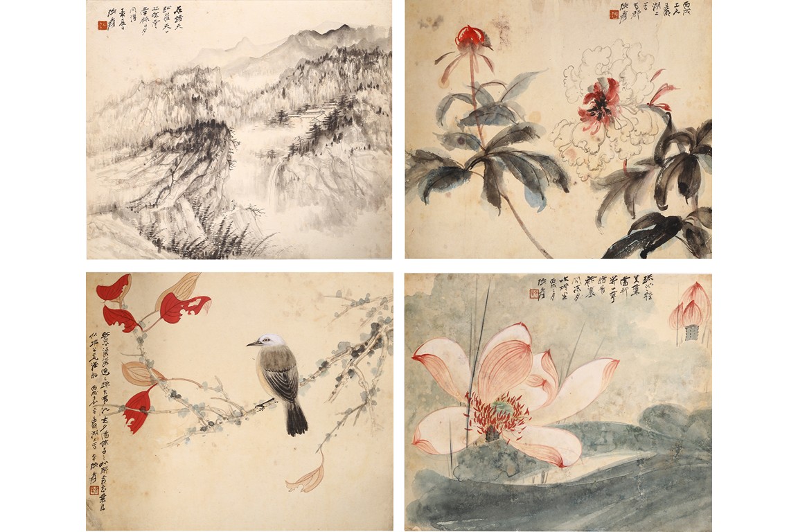 "This is a collection of Zhang Daqian (1899-1983)’ s masterpiece paintings during his prime time." Pink Red Lotus", " Bird Standing on Red Leaves Branch", "Peonies", and " Scenic View of Lofu Mountain", all those four paintings in this album were created between 1946 and 1947, his most creative period. 1.Pink Red Lotus沒骨粉荷 Album, ink and color on paper, 30.5 *35.9 cm Inscribed and signed: Zhang Ai One seal of the artist: Zhang Ai Dated 1946 2.Bird Standing on Red Leaves 紅葉小鳥 Album, ink and color on paper, 30.5 * 35.9 cm Inscribed and signed: Zhang Ai One seal of the artist:Zhang Ai Daqian Dated 1946 3.Peonies 沒骨芍藥 Album, ink and color on paper, 30.5 * 35.9 cm Inscribed and signed: Zhang Ai One seal of the artist: Zhang Daqian Dated 1946 4.Scenic view of Lofu Mountain 重山覽清流 Album, ink and color on paper, 30.5 * 35.9 cm Inscribed and signed: Zhang Ai One seal of the artist: Zhang Daqian Dated 1947"