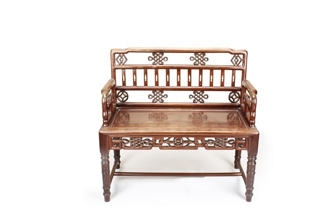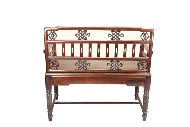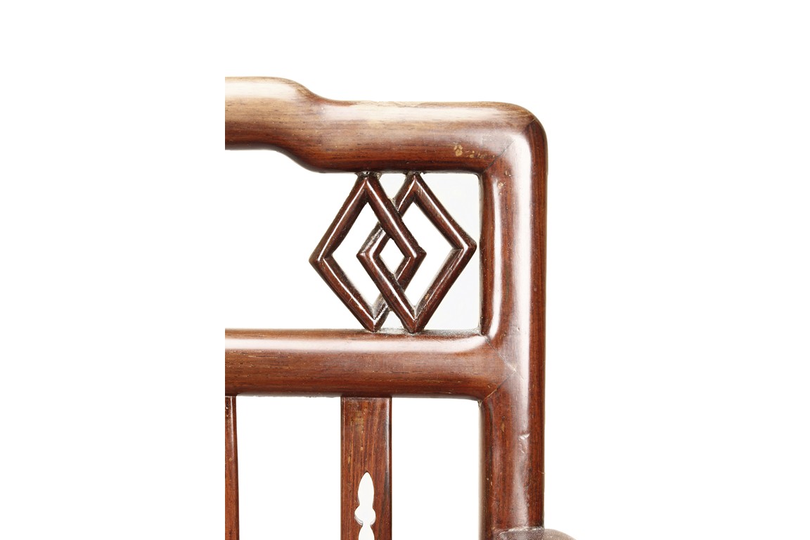 Including a pair of chairs, each with gently curved top rail, the S-curved rectangular splat carved with chilong medallion, flanked by upper extension of rear legs forming the corner posts, the arms supported on complex lattice-like side posts and raised on goose-neck supports at the front, the rectangular seat framed with 'ice-plate' edges, above stepped base stretchers and foodrest; and a stand with square upper surface raised upon four tall round-section legs joined by humpbacked stretchers. Republic period.