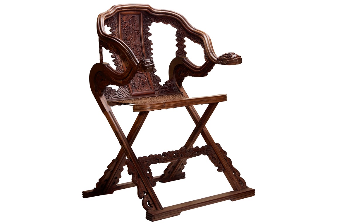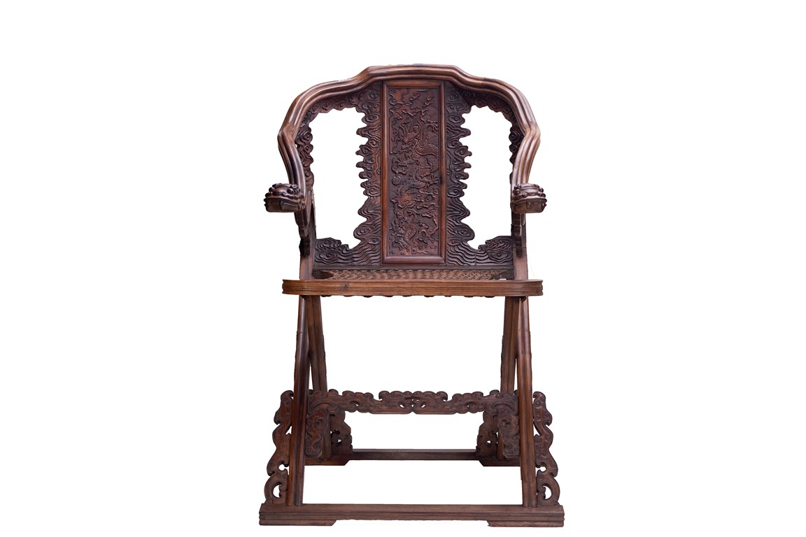 The chair with u-shape crest rail and back spalt finely decorated with five-clawed dragon emerging from crashing waves and ruyi-shape clouds to the sides, arms terminated with mythical beast mask, with threaded seat, the stretcher with archaistic dragon design.