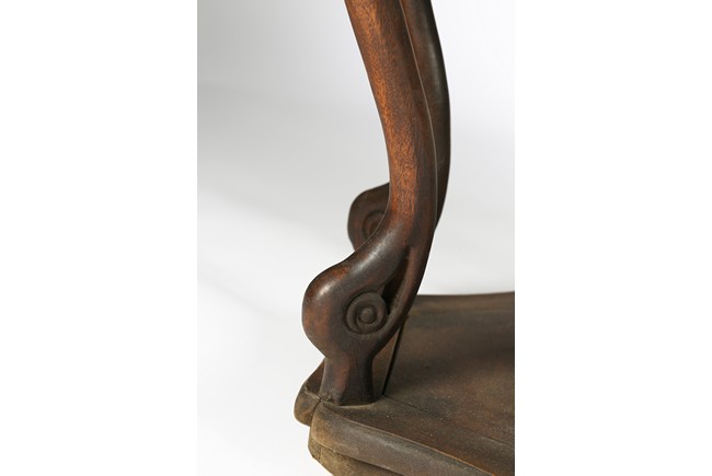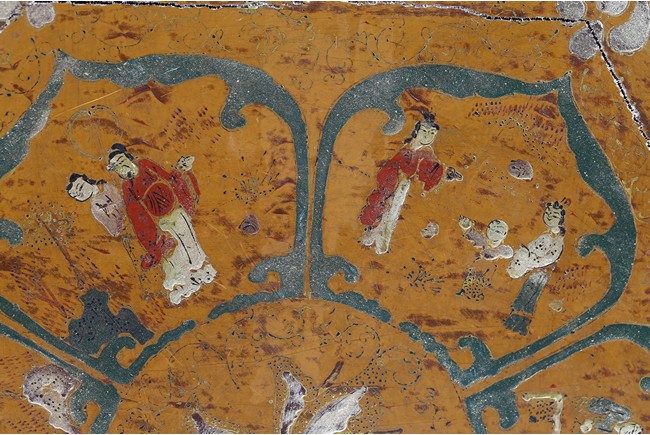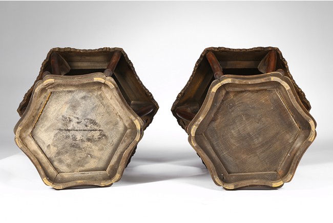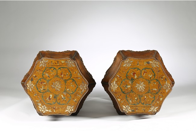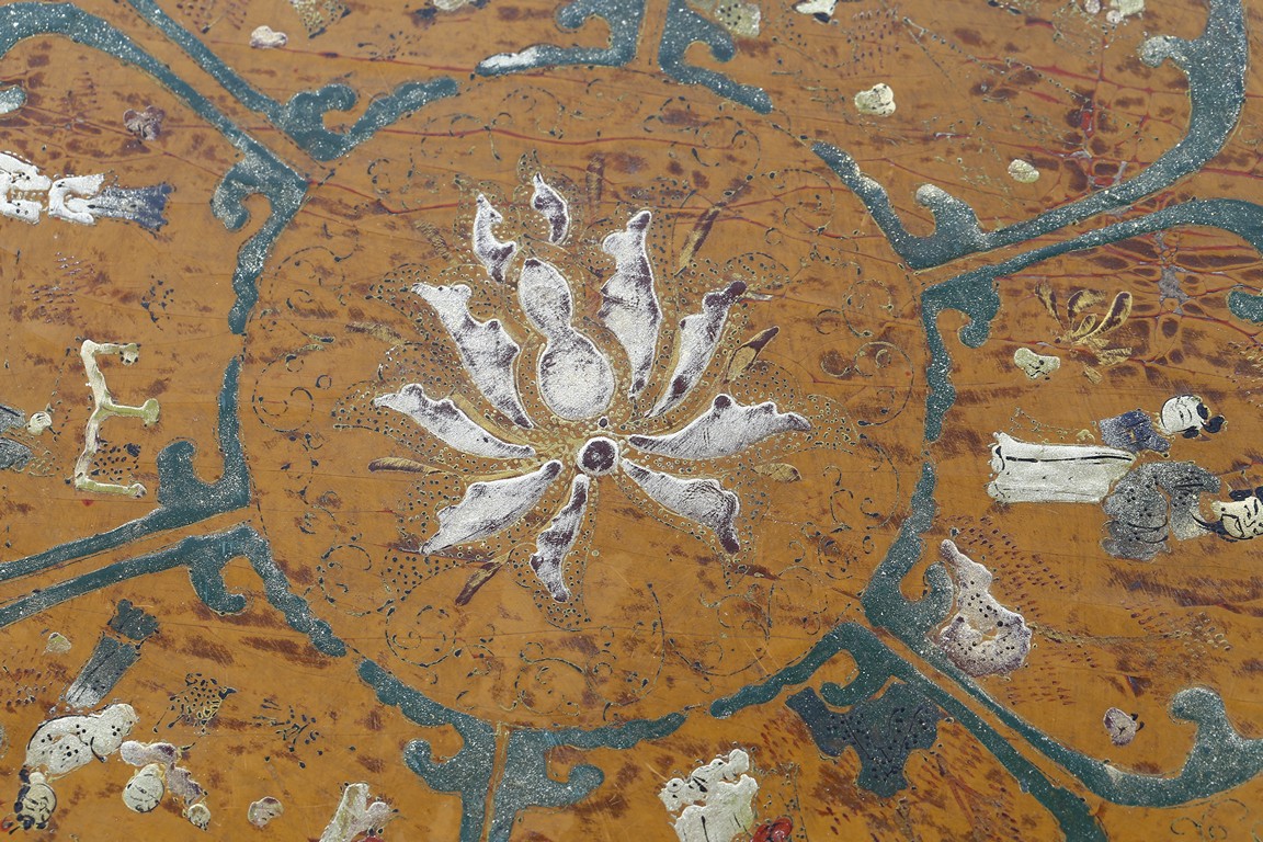 Each end table painted lotus and figures on the top surface, supported by 6 S shape table legs and a platform.
