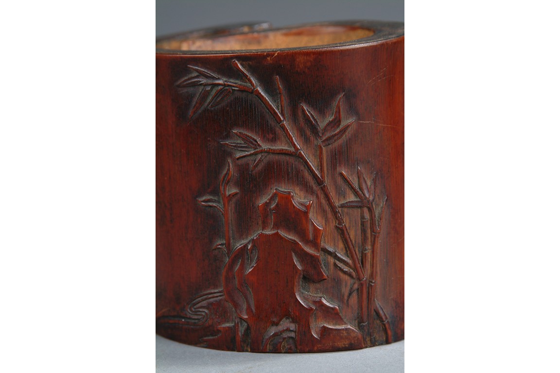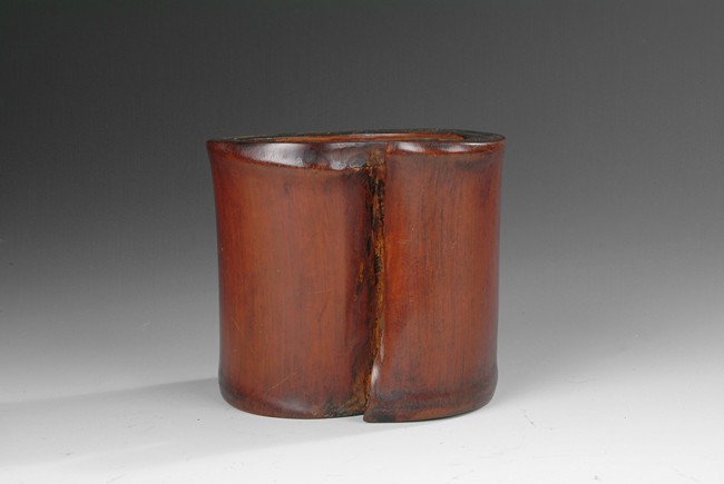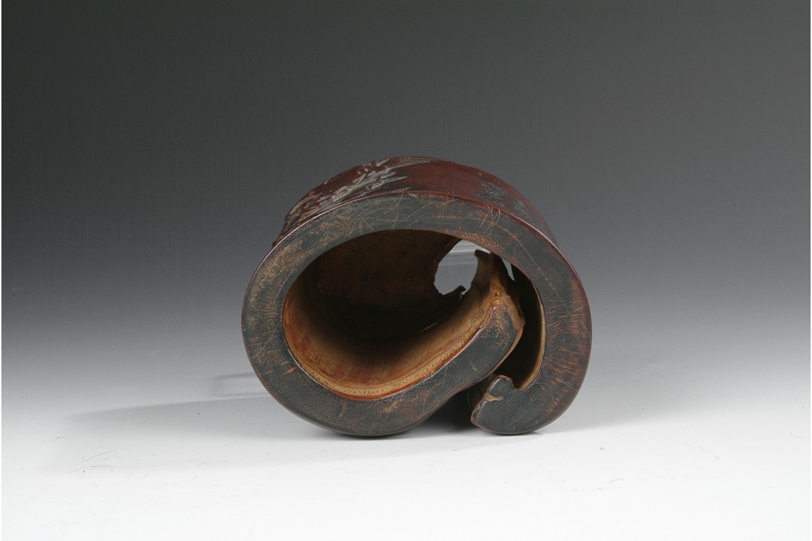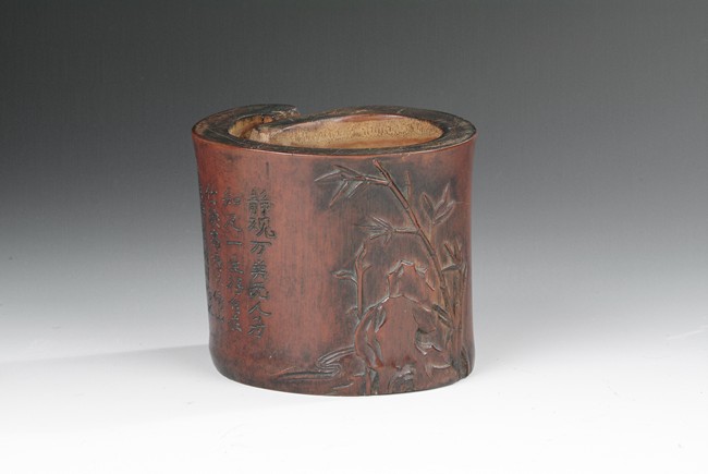 The brush pot was made out of a bamboo section that was not perfectly round, as one section of the stem wall was pushed inwards. The outside was carved with bamboo, viewing stones, and a Chinese poem calligraphy.