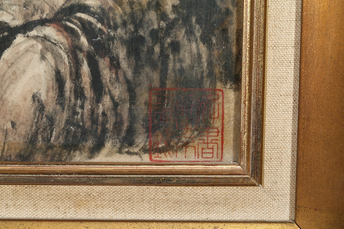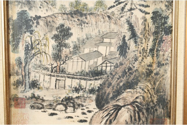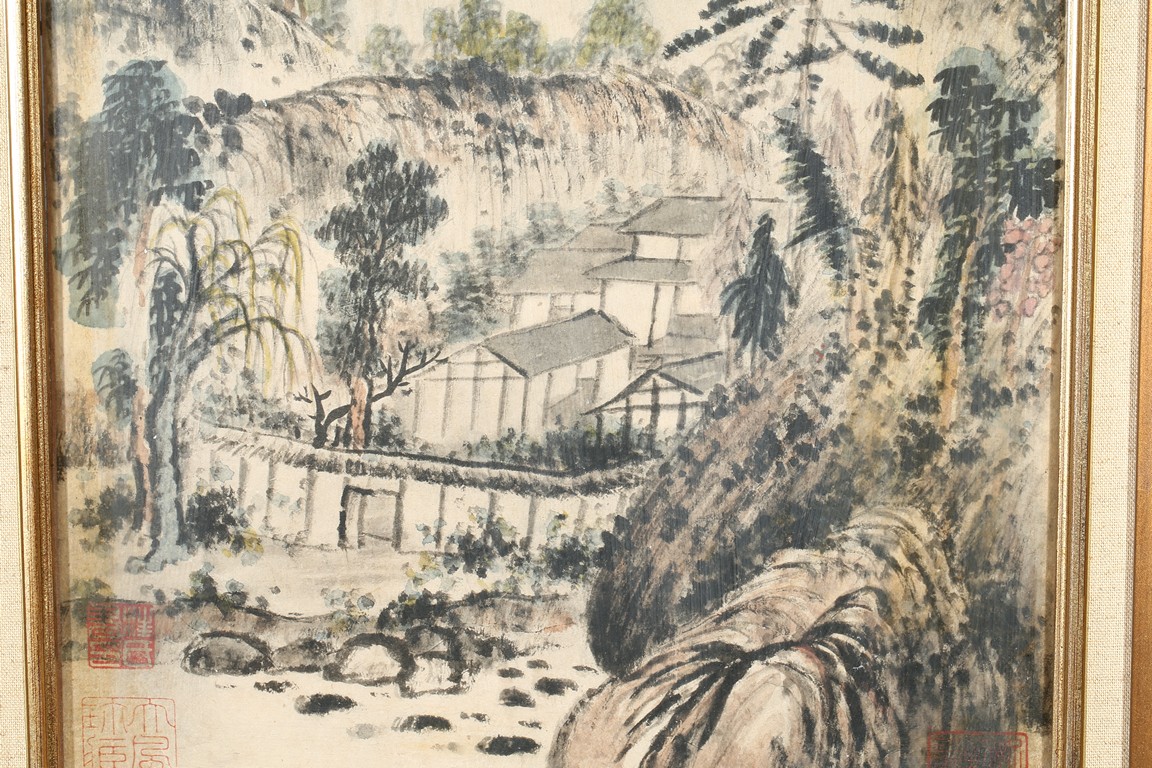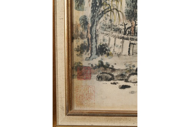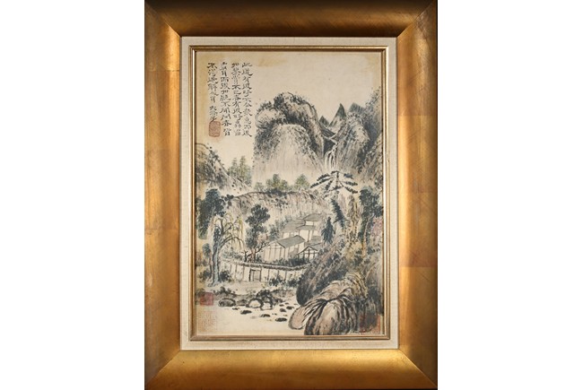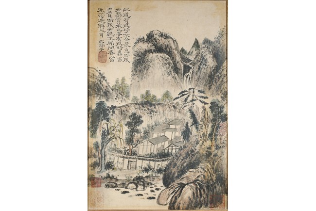 Ink and color on paper. Landscape. Framed. Inscribed and signed, with 4 marks. Shi Tao (1642-1708)