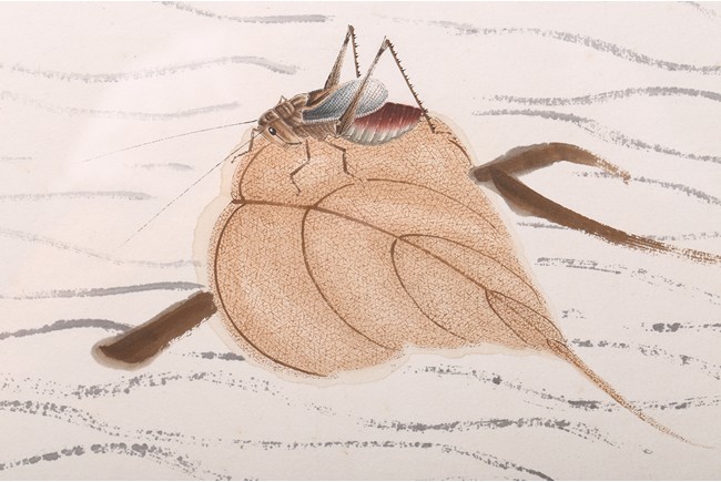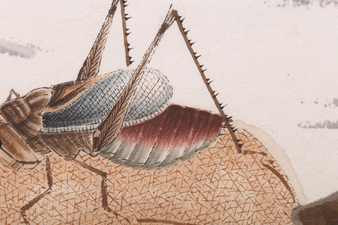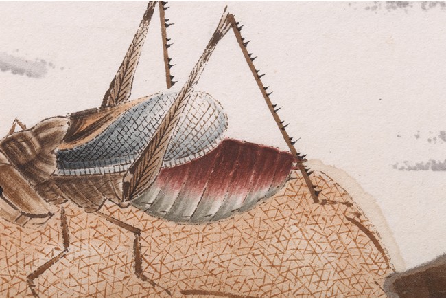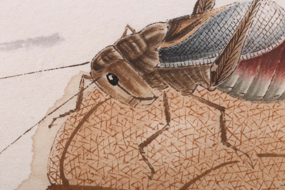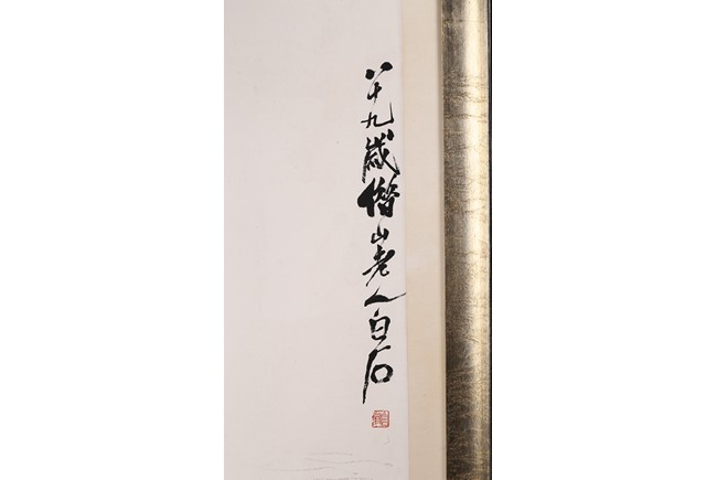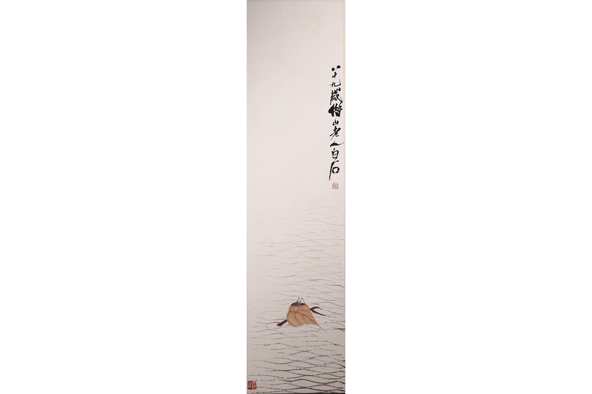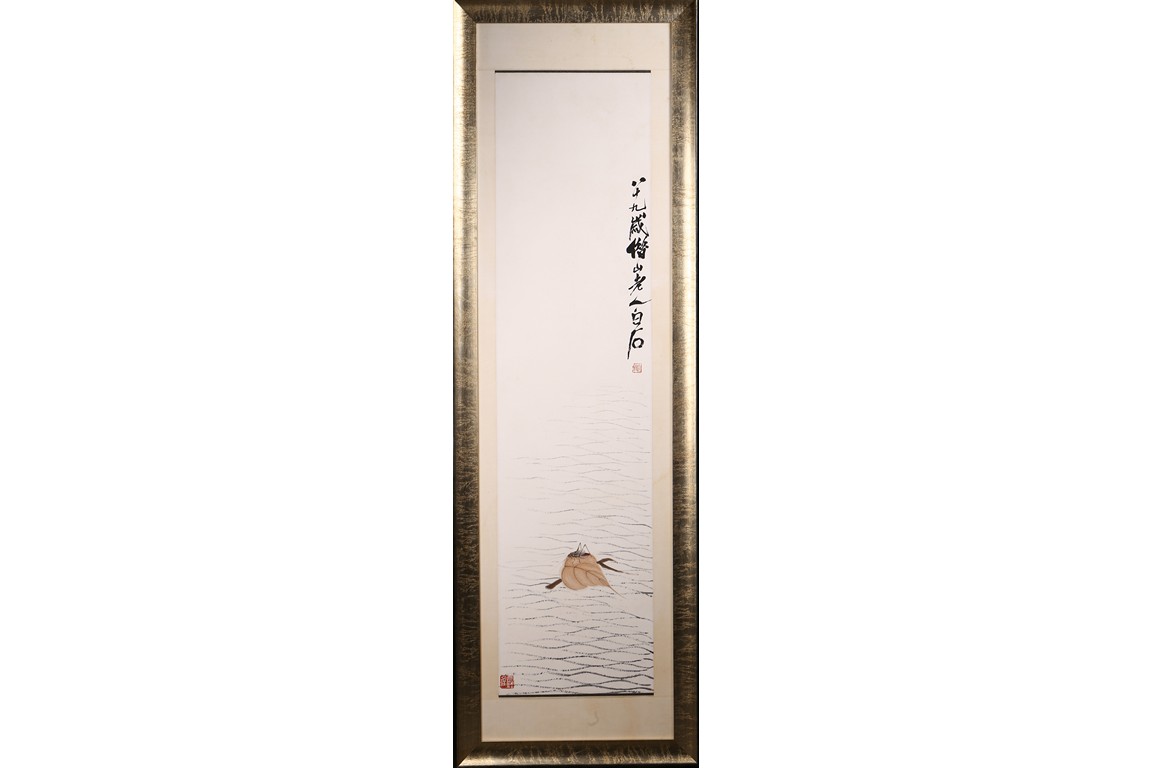 "Color and ink on paper. Framed. Inscribed and Signed Baishi, with two seals of the artist. The painting "Cricket Floating On a Falling Leaf " was painted. in 1949, when Qi Baishi was still in good physical condition and mental health, he remained vigorous in creativity and produced many more excellent Chinese paintings. In this painting you will observe a cricket was trapped and floating on a falling linden leaf surrounding with endless of water. The cricket’s body is done in green with red tail which contrasts superbly to the brown linden leaf. Qi Baishi ’s insects world excels when done in fine-line details where painting "Cricket Floating On a Falling Leaf" is on full display. Qi Baishi (1864-1957)was born in Xiangtan, Hunan, he is the most innovative and influential painter in the Chinese Modern art history and is the only Chinese artist of the 20th century to have placed among the giants of the world culture."