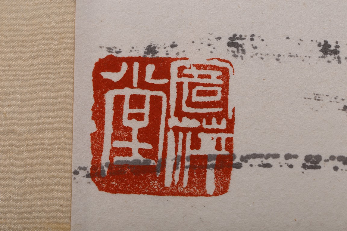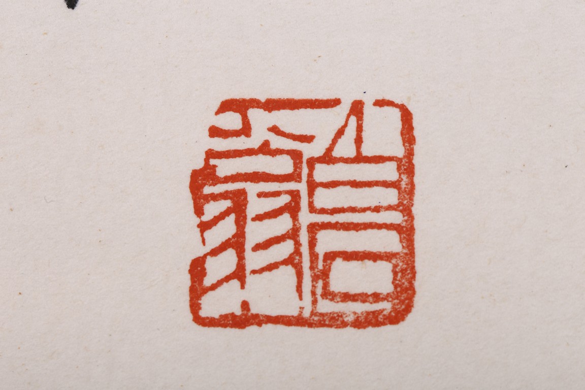 齊白石(1864-1957)出生於湖南農家,是二十世紀最富創新和最有影響力,且唯一被選為世界文化名人的近現代中國書畫藝術大師。是中國古今畫家中涉獵繪畫題材最廣者。他兼擅肖像、人物、山水、花鳥、走獸,及蟲草,能作工筆,更長於寫意,還能將極工與極寫合而為一,構成特殊的繪畫風格與情趣。本公司此次拍賣齊白石《貝葉蟈蟈浮水圖》作於1949年齊白石虛歳89歲,是他精力旺盛的最後一段時間,畫面近景描繪一支蟈蟈立於漂浮在水面上的一片貝葉,貝葉脈絡繁複,蟈蟈逼真傳神,畫面下方三分之一處,蟈蟈貝葉被水波填補包裹著,流水生動流暢的缐條,呈現一種真山實水的韻致。遠景留下一望空白無涯的水源,給欣賞者留下無限的想像空間,整幅構圖清新而簡潔俐落,令人拍案叫絕,齊白石的這類作品是很珍貴稀有的。 來源:夏威夷日裔藏家收藏