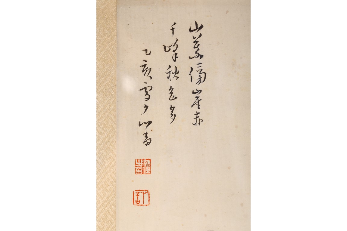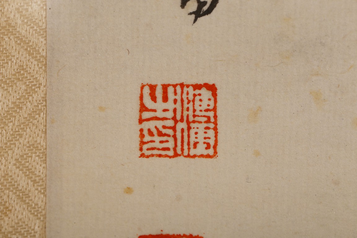 Ink and color on paper. Landscape. Framed. Signed and inscribed Xinyu, with two seals of the artist.