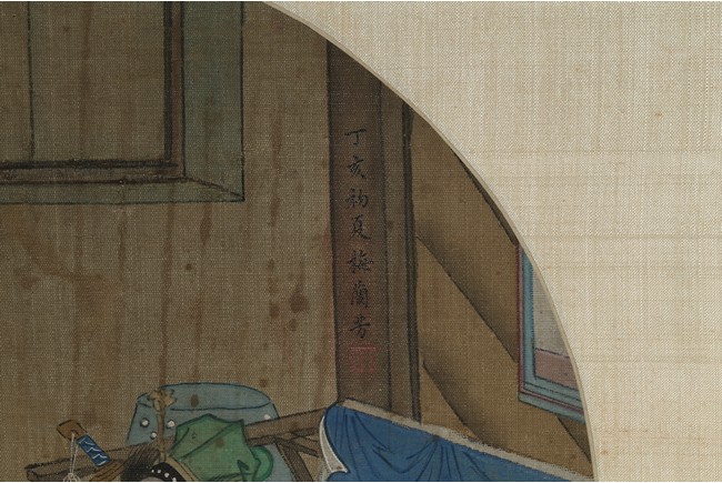 Color and ink on silk. Figure. Circular fan painting, mounted on paper.