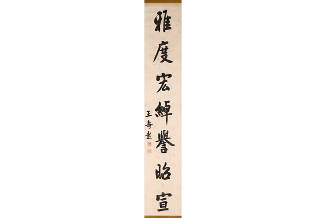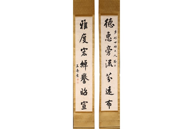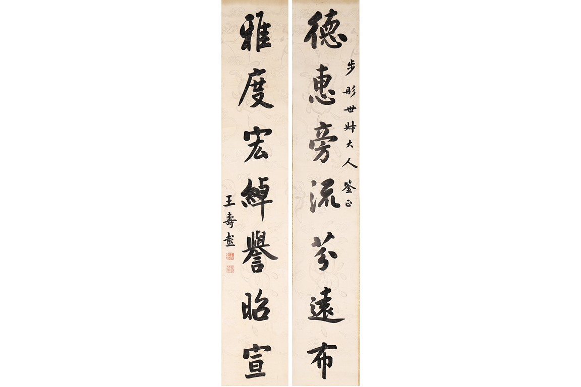 Ink on paper. Calligraphy couplet. Hanging scrolls. Inscribed and signed, with two seal marks. Wang Shoupeng (1875-1929)