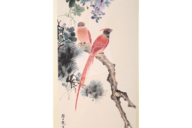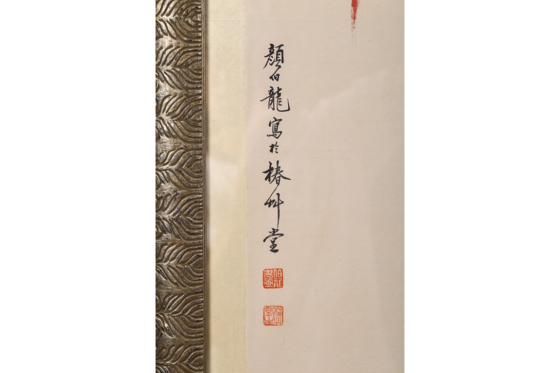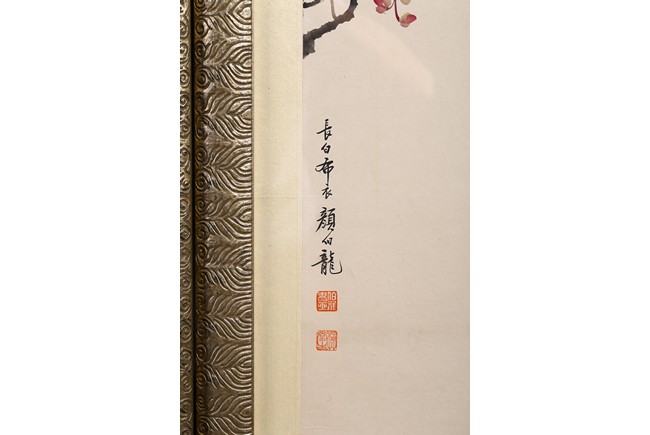 "顏伯龍(1898~1955)近現化畫家,北京人。名云霖,字伯龍,號長白布衣,所居椿草堂。民國時期京津畫派著名的花鳥畫家,工山水、人物、翎毛、走獸。因顏先生不喜仕途,只想做一介布衣,潛心作畫,又因顏先生祖籍長白,故稱"長白布衣"。顏伯龍先生是集宋、元、明、清歷代花鳥畫法大師之一,同時顏先生一生在創作的同時也不斷融入自己的丹青意趣。此次拍賣顏伯龍先生畫作共計四幅,圖解如下: 1、玉蘭鸚鵡圖 設色紙本 1944 甲申仲春擬新羅山人意 長白布衣 顏伯龍寫於椿草堂。鈐印:「伯龍書畫」白文方印、「椿草堂主」朱文方印、「奇花初始幽鳥相逐」白文方印2、紅桃翠鳥圖設色紙本款識:擬元人筆法寫景顏伯龍。鈐印:「伯龍書畫」白文方印丶「椿草堂主」朱文方印、「奇花初始幽鳥相逐」白文方印 3、雙鴿添花圖 設色紙本 款識:長白布衣 顏伯龍。鈐印:「伯龍書畫」白文方印、「椿草堂主」朱文方印、「奇花初始幽鳥相逐」白文方印 4、松樹綬帶圖 設色紙本 款識:顏伯龍寫於椿草堂。鈐印:「伯龍書畫」白文方印、「椿草堂主」朱文方印、「奇花初始幽鳥相逐」白文方印 來源:洛杉磯韓裔家族收藏"