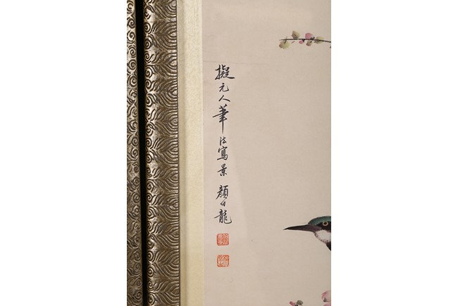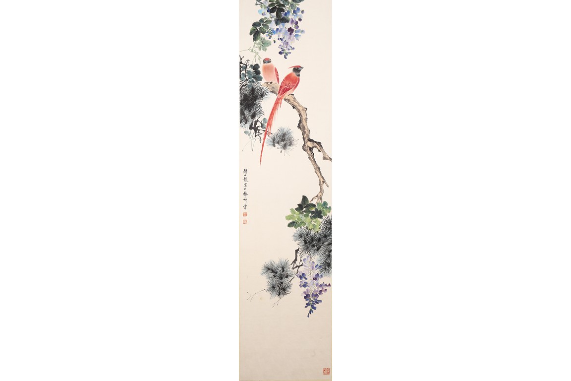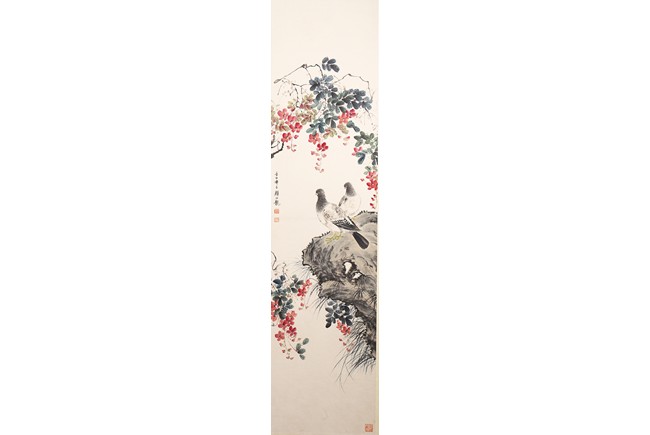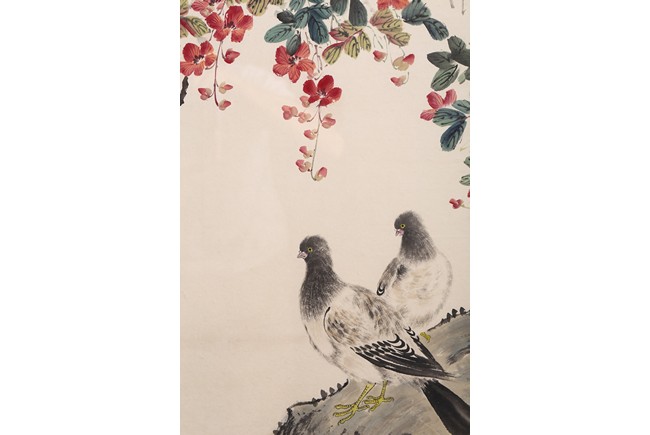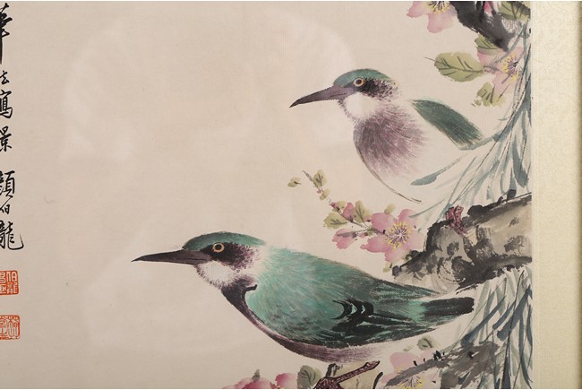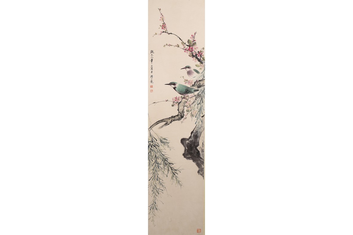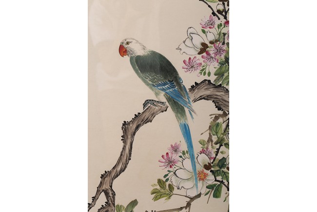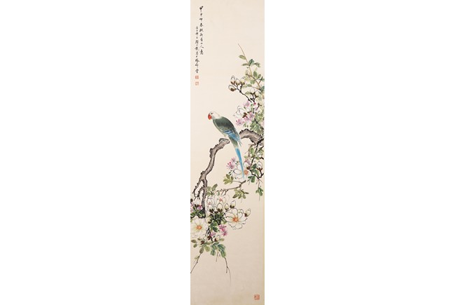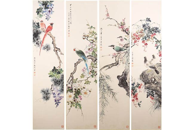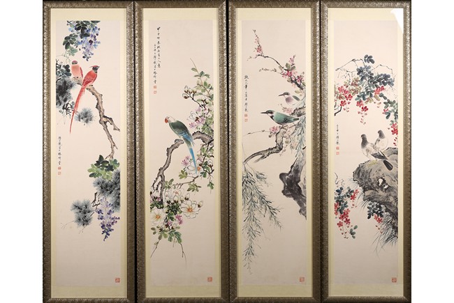 Ink and color on paper Yan Bolong(1898-1955) was born in Beijing, China. Given name Yunlin, chosen name Changbaibuyi. He is one of the famous Chinese painting master in the 20 century. He was great at painting all subjects including scenery, people, flowers, birds, and animals. 1. Parrot and Magnolia ink and color on paper 135.3*32.4cm Inscribed and signed: Yan Bolong Three seals: Two seals of Yan Bolong, and one seal of a verse. 2. Kingfisher and peach blossom ink and color on paper 135.3*32.4cm Inscribed and signed: Yan Bolong Three seals: Two seals of Yan Bolong, and one seal of a verse. 3. Pigeons standing on rock under a tree with flowers ink and color on paper 135.3*32.4cm Inscribed and signed: Yan Bolong Three seals: Two seals of Yan Bolong, and one seal of a verse. 4. Birds Standing on a branch of a pine tree ink and color on paper 135.3*32.4cm Inscribed and signed: Yan Bolong Three seals: Two seals of Yan Bolong, and one seal of a verse.