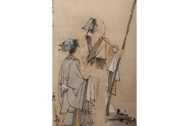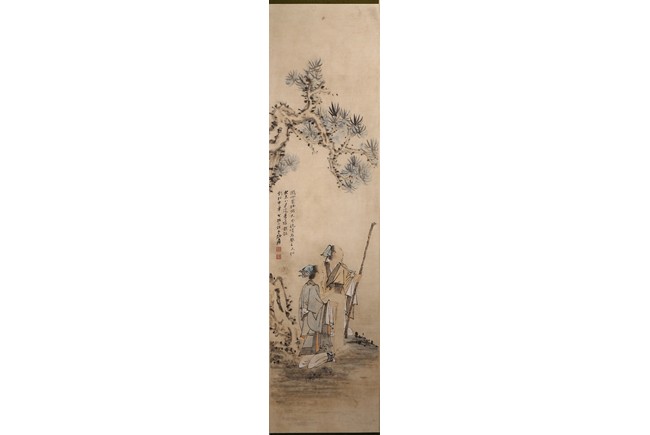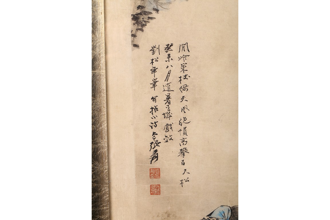 張大千松蔭二高圖 設色紙本 立軸 1943 130.5 * 33 cm款識:閑吟策杖倚天風,絕頂高攀百尺松。癸未八月遷暑成都,戲效劉松年筆並拈小詩。大千 張爰。鈐印: 「張爰私印」白文方印張大千長幸大吉又日利」白文方印「松蔭二高圖」作於1943年8月,此時張大千結束了敦煌禮佛之旅,與家屬及學生等人一行已在蘭州並正籌備畫展。 「松蔭二高圖」畫中描繪一高士手持拐杖,另一高士手握畫卷,彼此互相往後凝視遠方,作沉思狀。二高士衣紋線條似鐵線般的流暢而有力度。古松蒼勁奇崛,堅勁挺拔。作者以蒼松襯托高士的胸襟,實為抒發二位高士的處世態度。此幅畫構圖簡潔,空曠幽雅,意境清逸。人物、蒼松以寫意為主,用筆簡練,揮灑自如,工寫兼備,別具一格。 來源:洛杉磯韓裔家族收藏