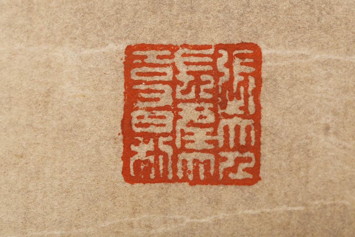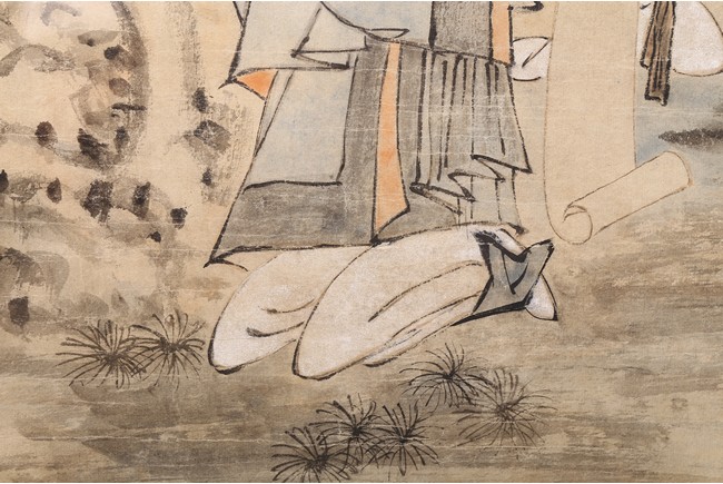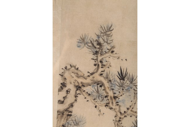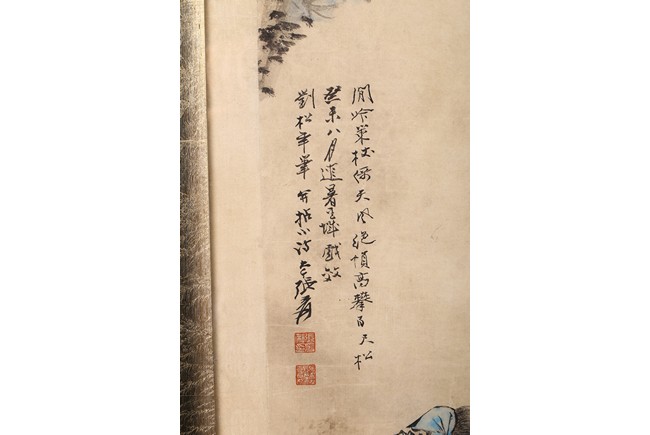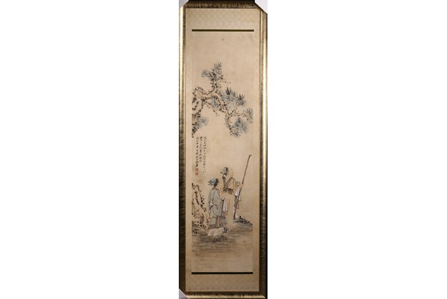 "Color and ink on paper. Scholars. Inscribed and signed Zhang Yuan, with two seals of the artist. Framed. In August of 1945, Zhang Daqian (1899-1983) has completed Dunhuang trip and traveling to Lanzhou to prepare his first Dunhuang Frescoes art exhibition. Figure painting "Two Scholars Under the Pine Tree" was created at the time with Zhang’s unique iron-line drawing style which depicted the scholars lofty and noble spirit. This is a fine work of art because she represents the perfect balance between aesthetics and philosophy, visual arts and study of art, as well as inward feelings and outward objects."