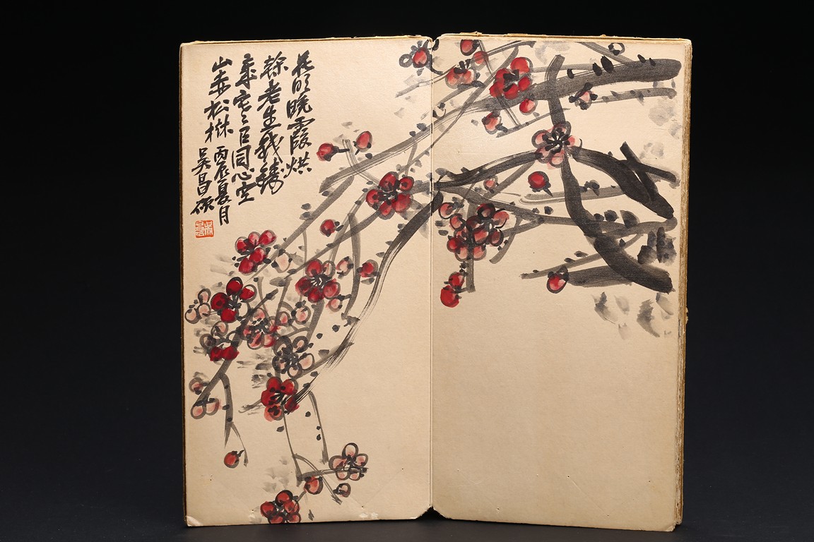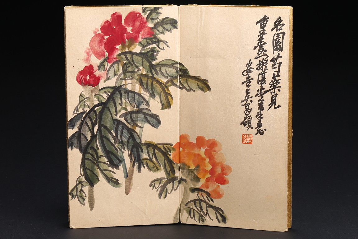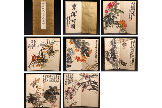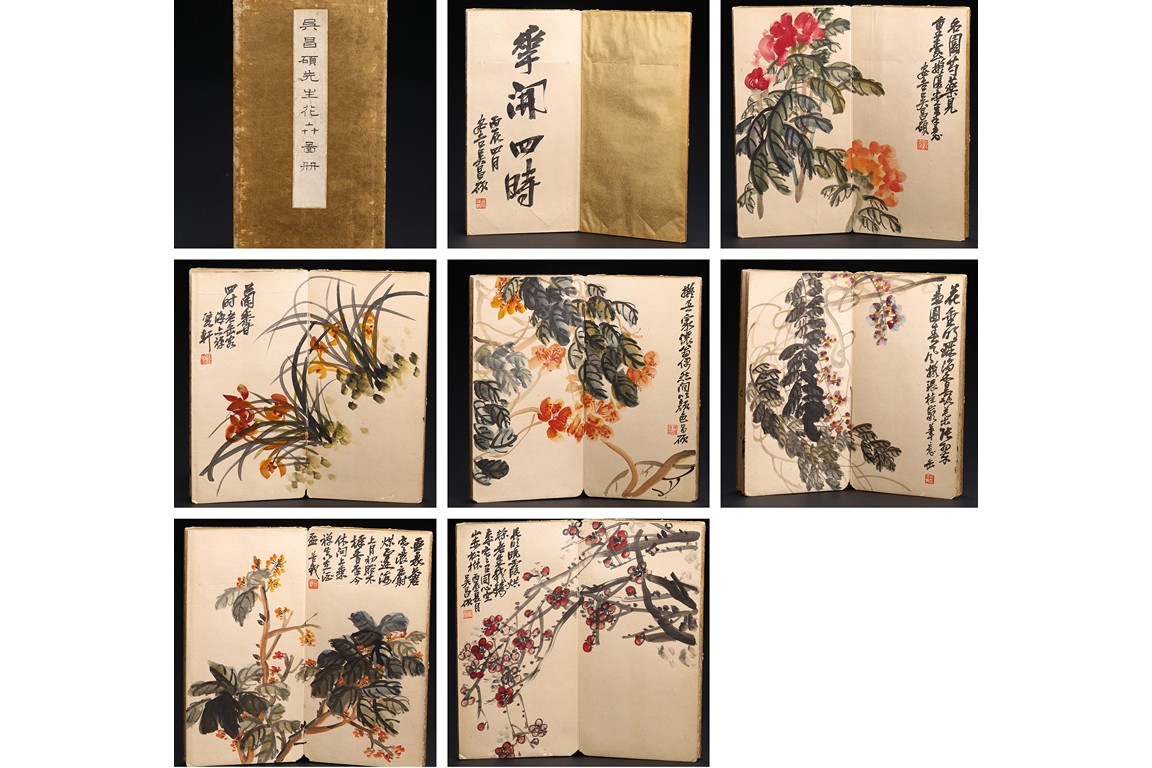 Color and ink on paper. Flowers. 6-leaf album. Inscribed and signed, with seven seal marks. Wu Changshuo (1844-1927)