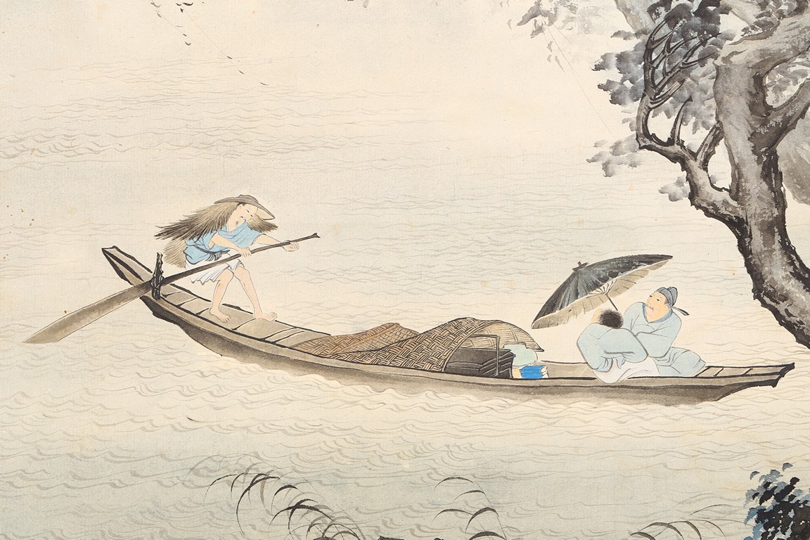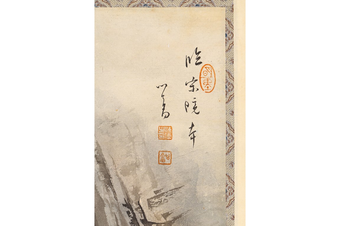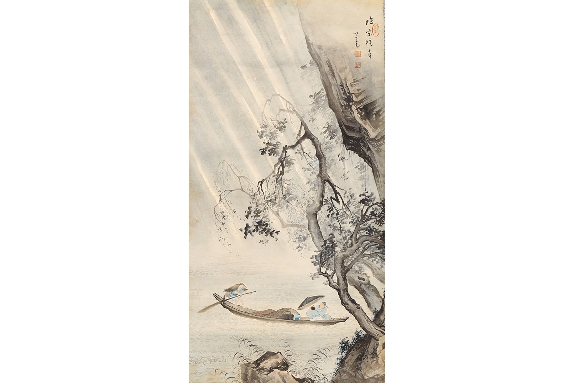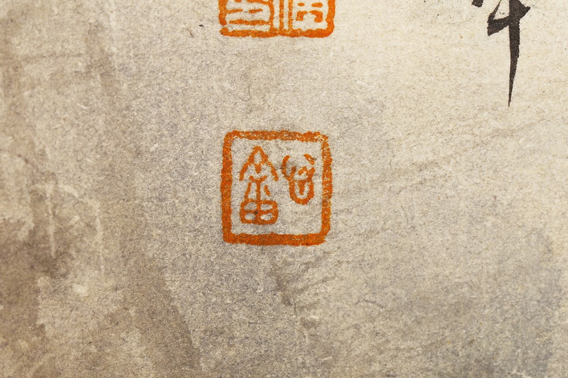 Color and ink on paper. Landscape and figure. Unmounted. Inscribed and signed, with three seal marks. Pu Ru (1896-1963)