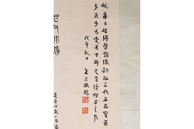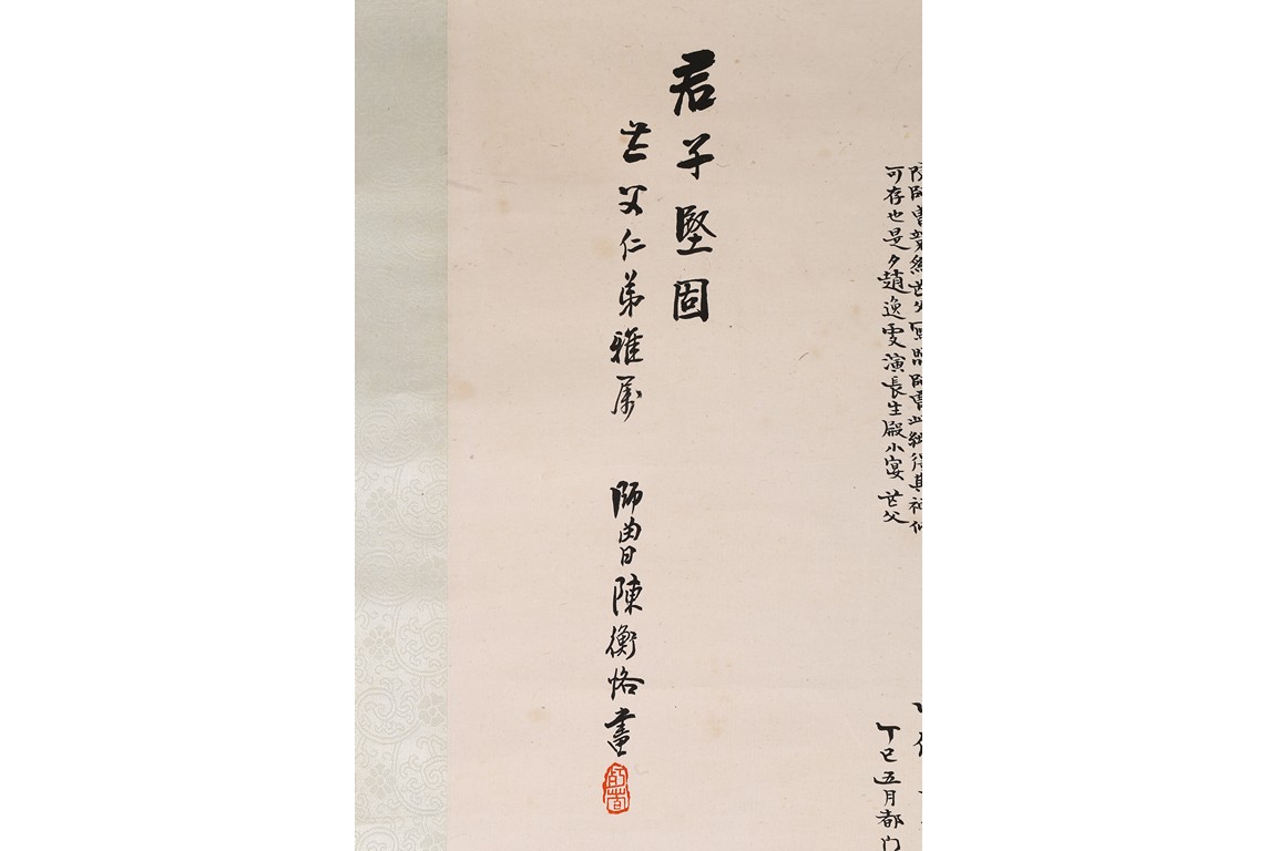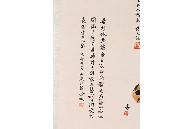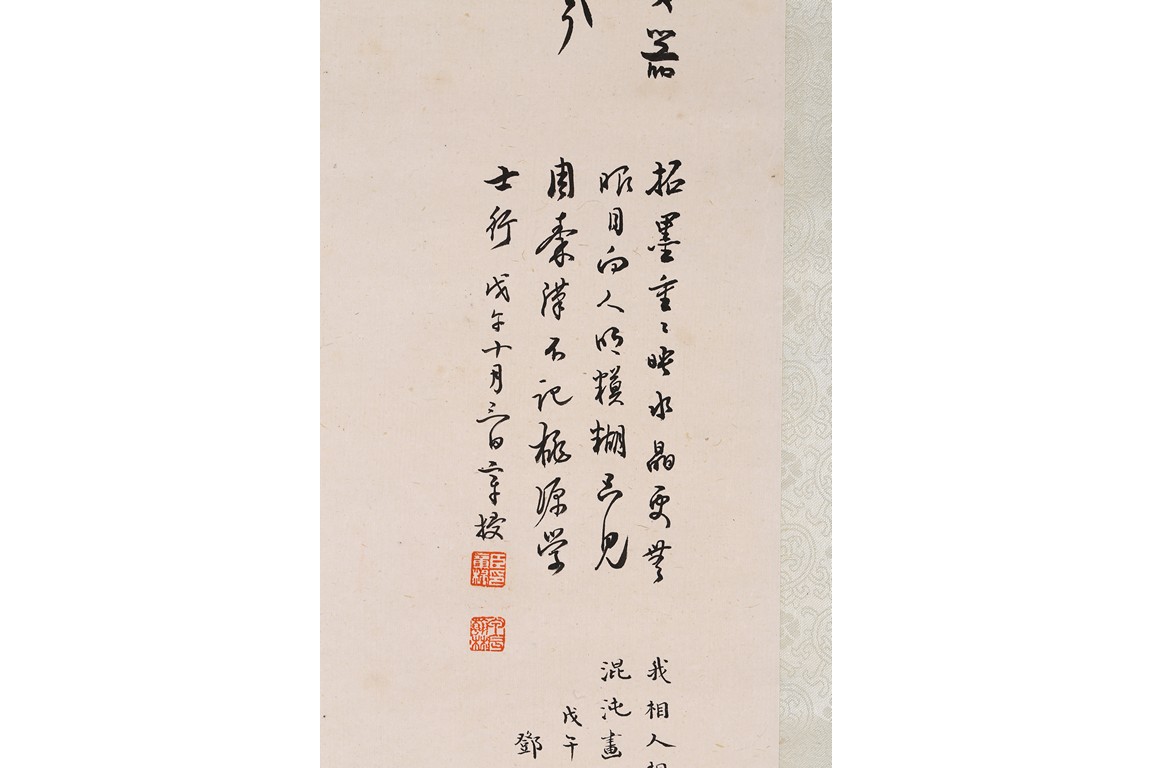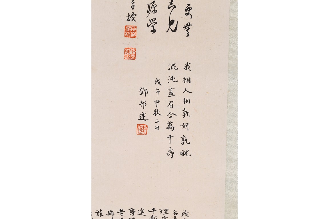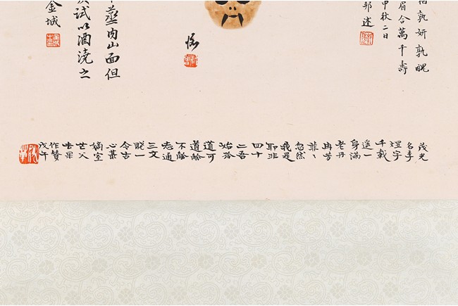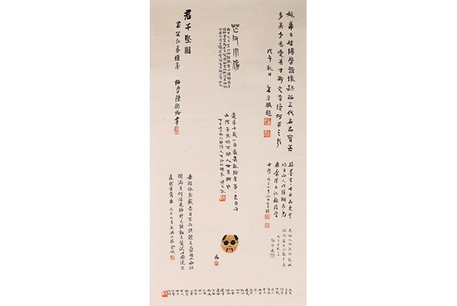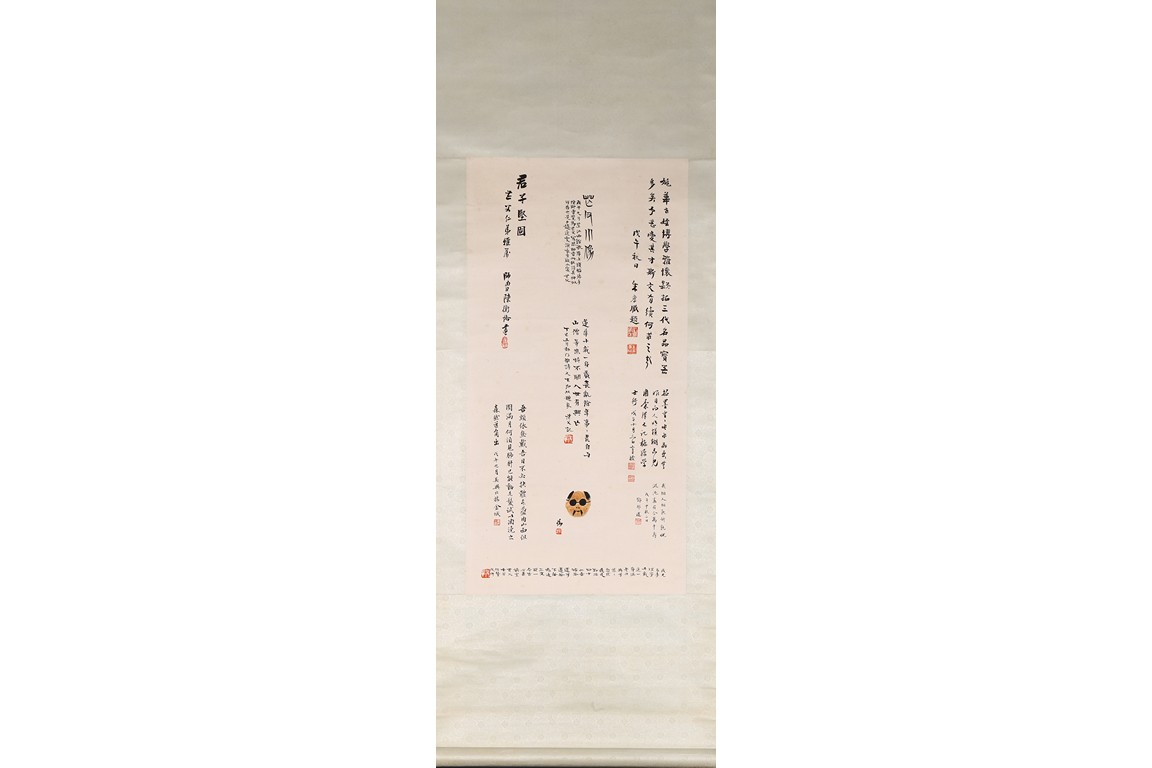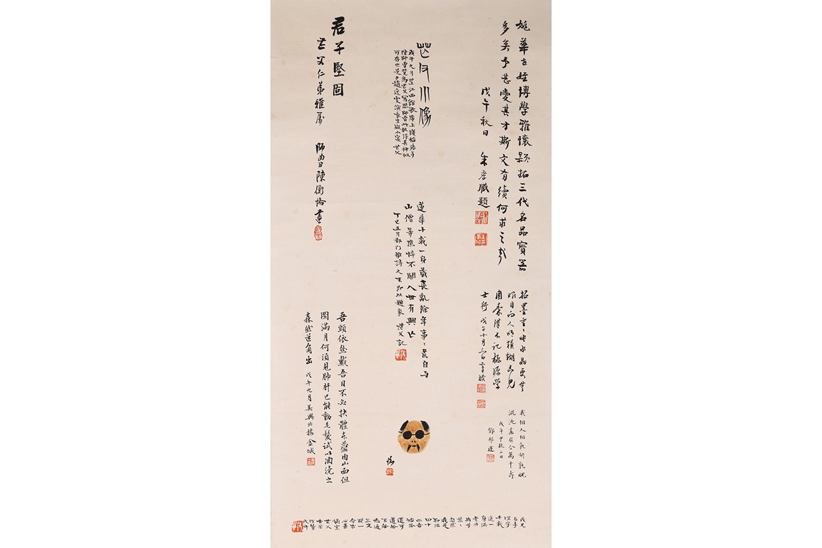 Ink and color on paper. Calligraphy and figure. Hanging scroll. Inscribed and signed, with nine seal marks. Chen Shizeng (1876-1923) and other 8 artists