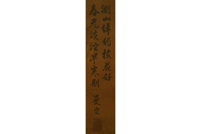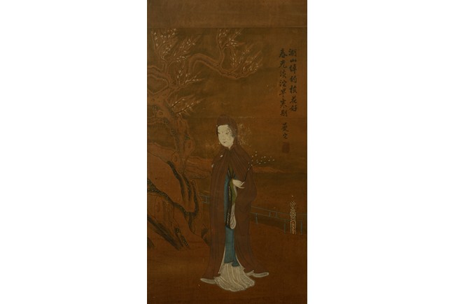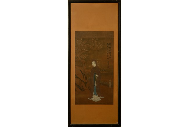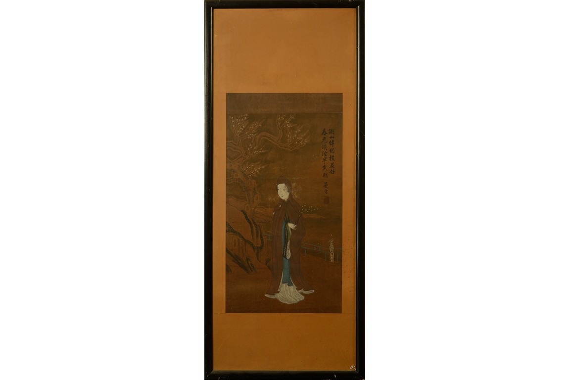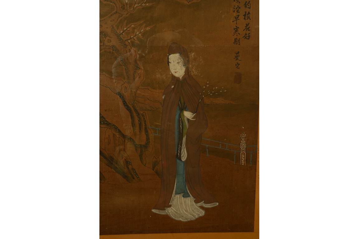 Color and ink on silk. Beauty. A framed silk painting depicting a beauty, under a blooming plum tree in a garden setting. Chinese colophon, artist signature, and artist mark on top right.