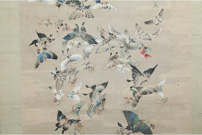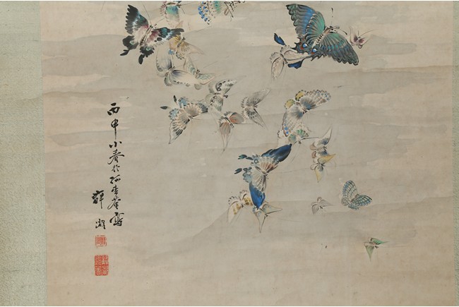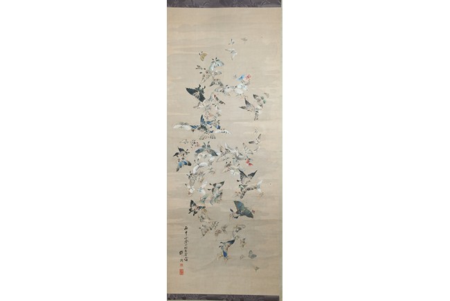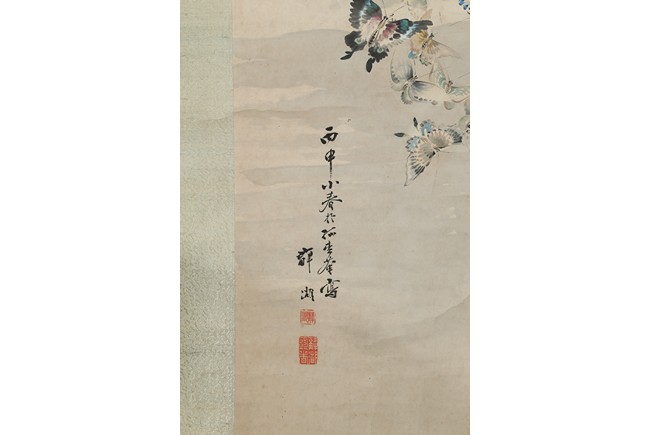 Color and ink on paper. Butterfly. Hanging scroll. Inscribed and signed, with two seal marks.
