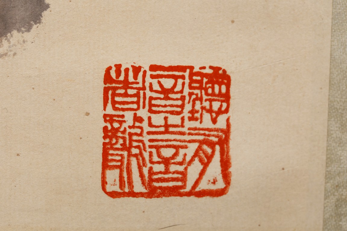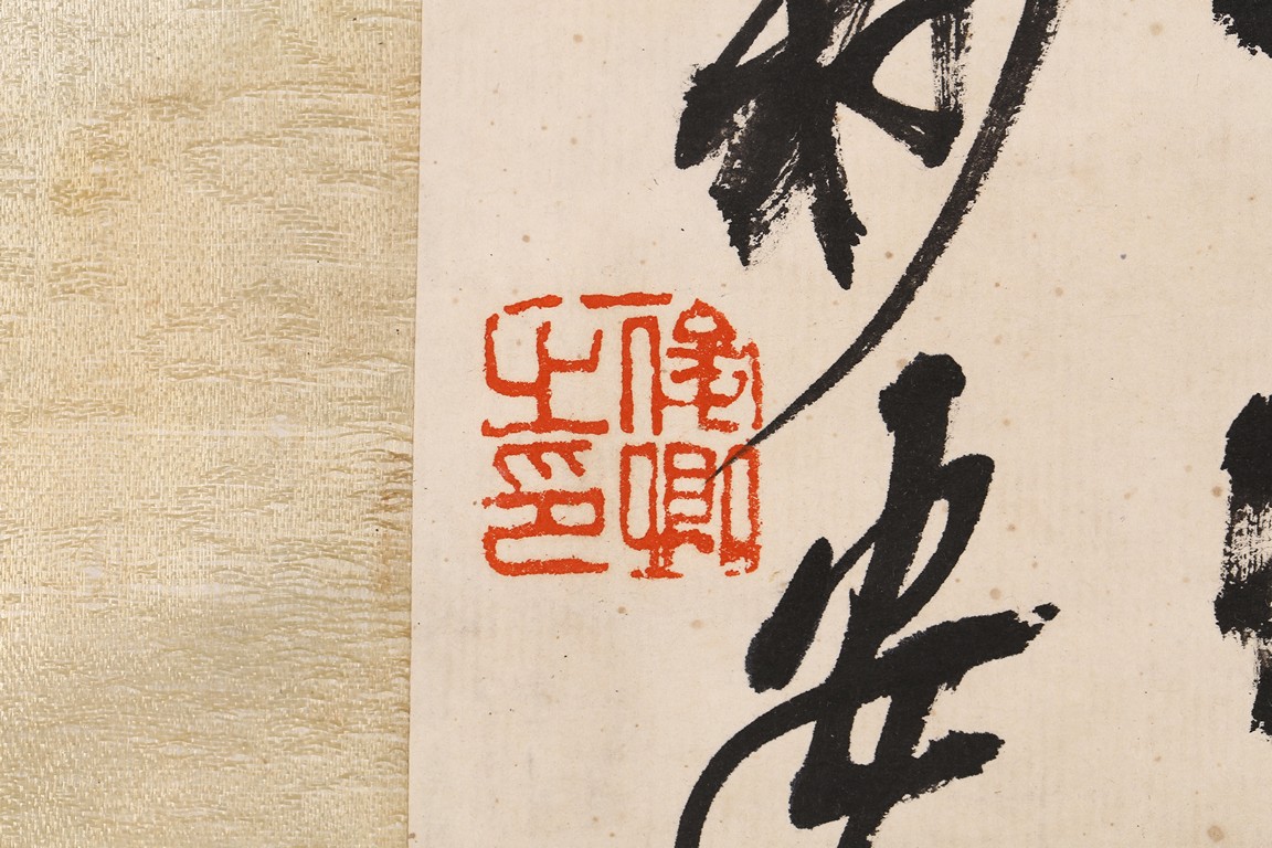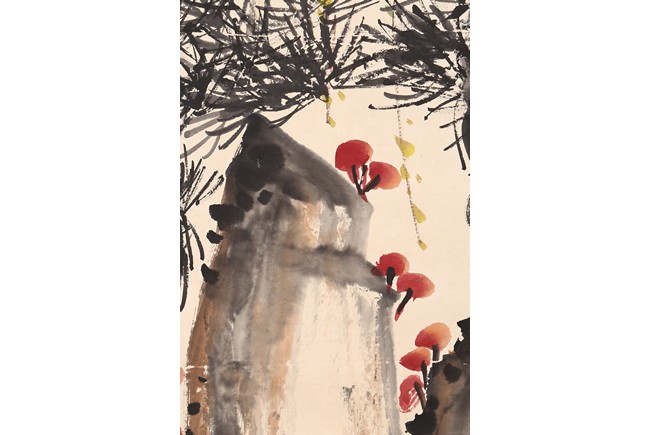 吳昌碩松樹靈芝長壽圖,高:148.6cm,寬81.3cm。此畫用筆圓滑,佈局合理,精細,所畫松竹、靈芝自然,寓意深長,所寫書法流暢,充分體現了吳昌碩先生對於晚年生活的健康、充實、快樂的心境。