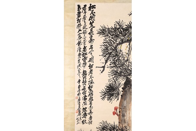 Color and ink on paper. Pine tree and reishi. Hanging scroll. Inscribed and signed, with three seal marks. Wu Changshuo (1844-1927)