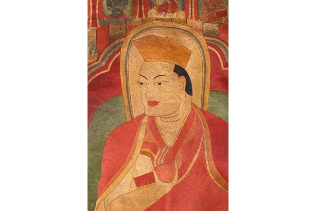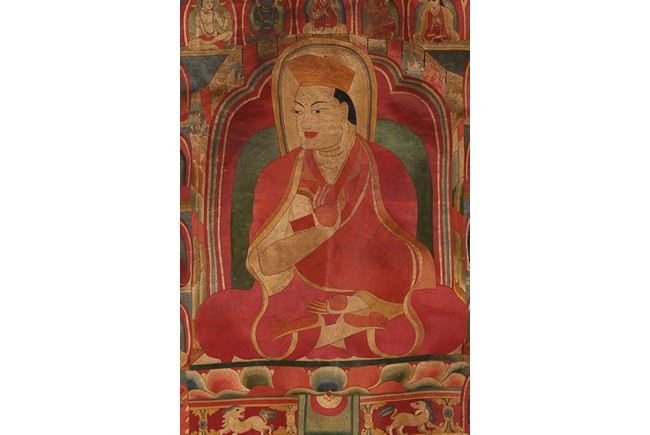Depicting the lama at center sitting on a lotus base with the right hand in gesture of vitarka mudra and the left hand in gesture of varada mudra, surrounded with many smaller buddha and immortal figures. Qing Dynasty period.