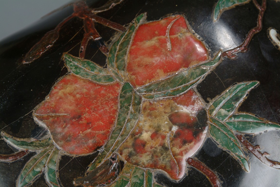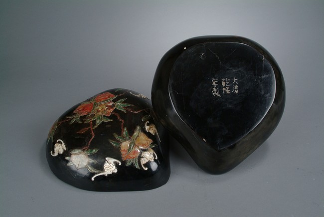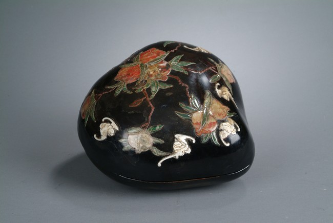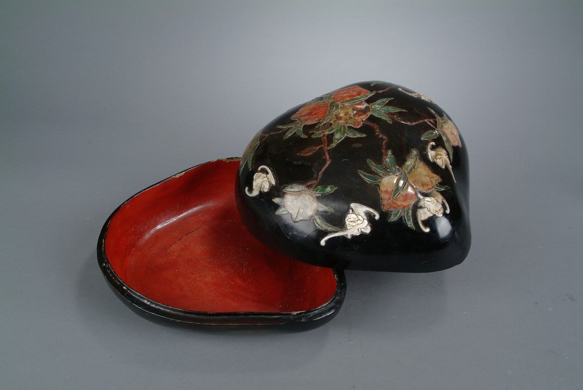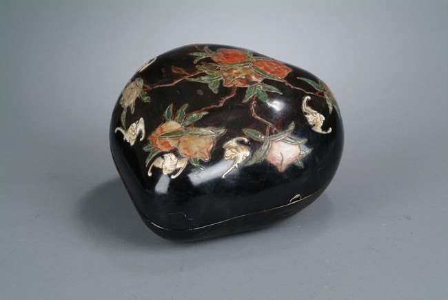 Of peach form, the lacquer box is decorated with mother of pearl, Shoushan soapstone, chicken blood stone, and jasper, to form bats flying next to peaches. Bottom bears six character 'QIANLONG' mark. Qing Dynasty period.
