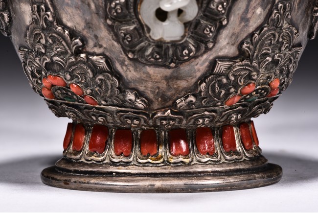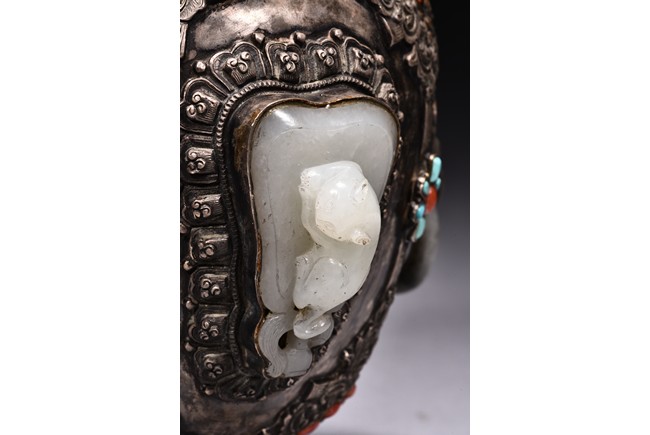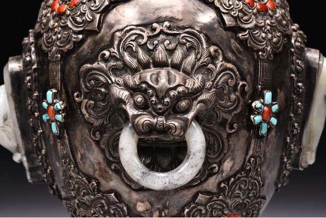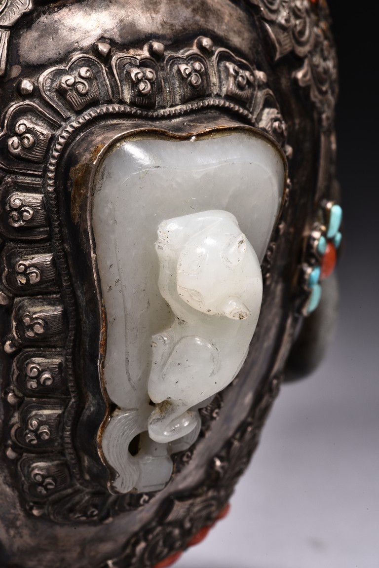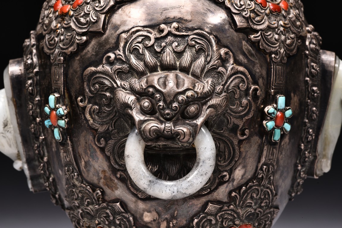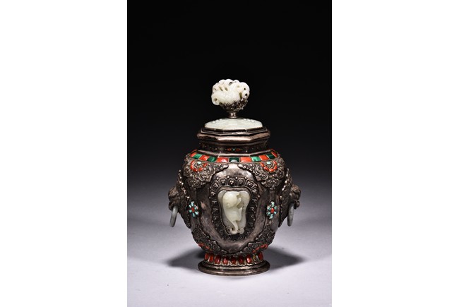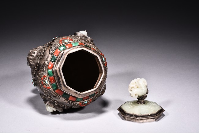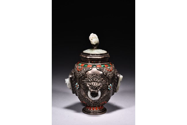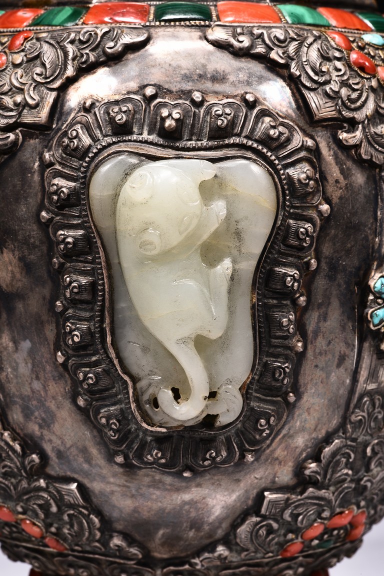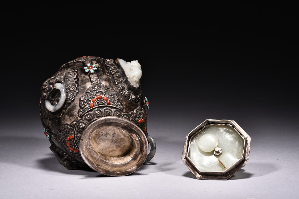 Of ovoid form and raised from coral-petal inset foot ring, the jar is finely decorated with white jade plaques of recumbent mythical beast enclosed by raised lotus pattern on both sides, the sides flanked by raised Buddhist lion head mask with jade ring, the cover further fitted with white jade plaque with bagua decoration, surmounted with a reticulated white jade finial. Qing Dynasty Period.