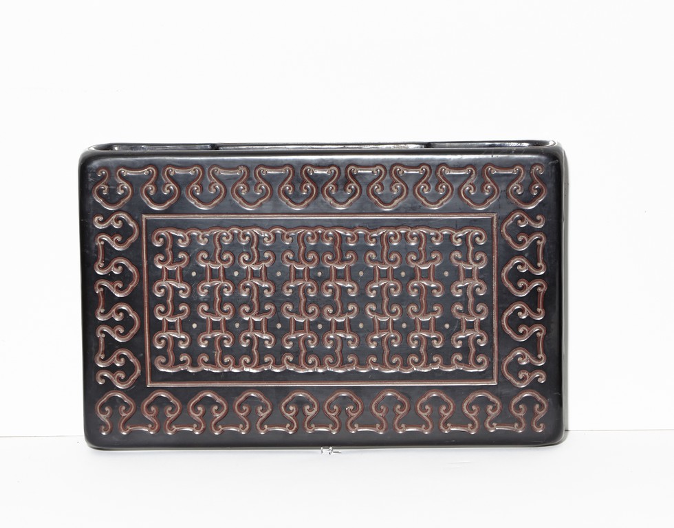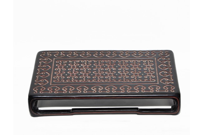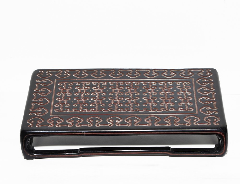 The top panel is carved through lacquer with three rows of repeated ruyi-shaped heads connected together outlined with a rectangular panel, the exterior encircled further with a band of ruyi motifs, all supported on four foot linked by humped stretchers. Qing Dynasty period.