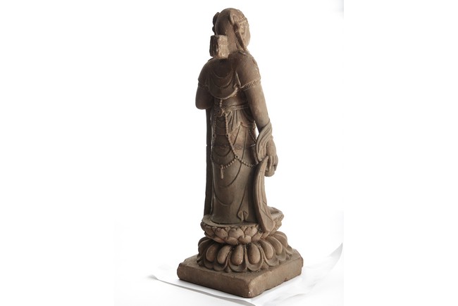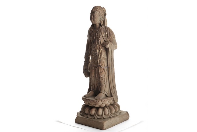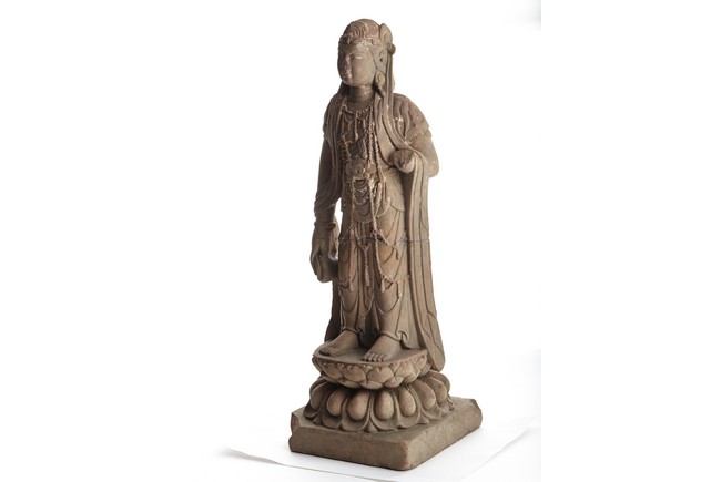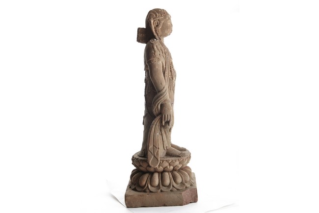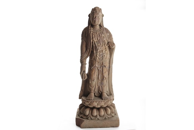 The elegant figure very finely carved from stone, depicting standing on a double lotus throne, dressed in shawl and overskirt pleated in front and falling in graceful folds, adorned with various beaded jewelry, the head slightly tilted. Yuan /Early Ming Dynasty