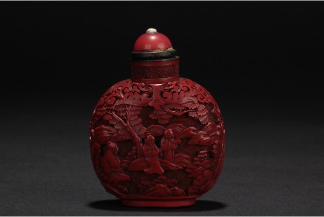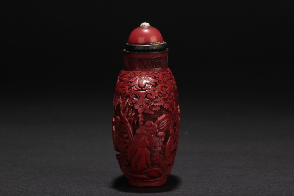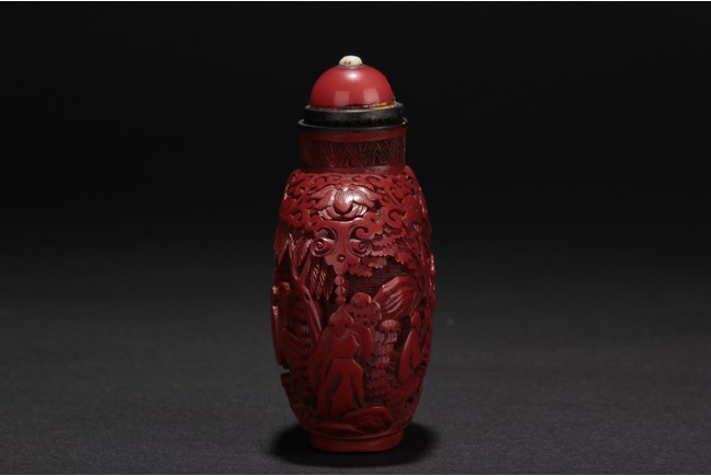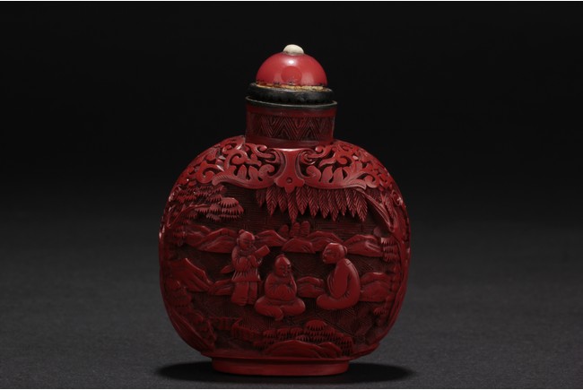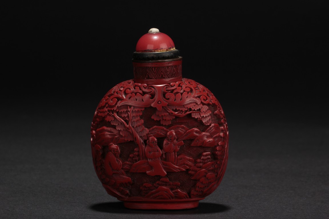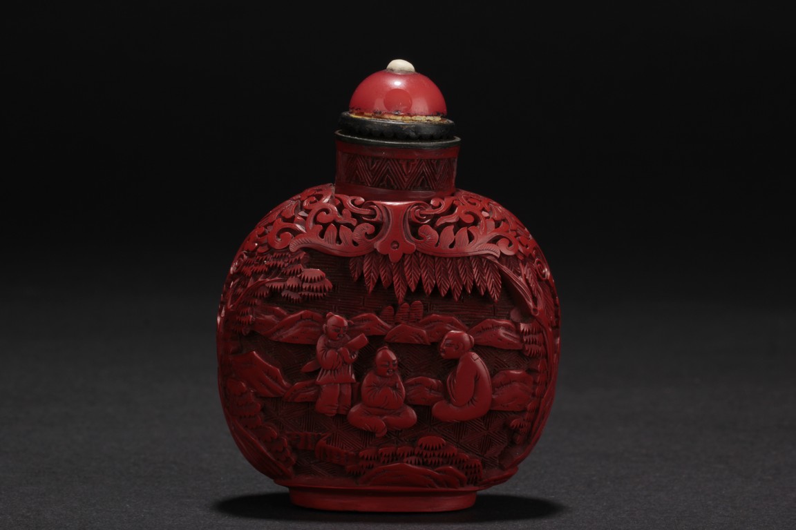Of flattened ovoid form, the snuff bottle low relief carved with two scenes, one with three young boys gathering in a river and forest setting, other with an elder and two boys in mountain and forest setting, the top and sides carved with floral patterns. Qing Dynasty period.