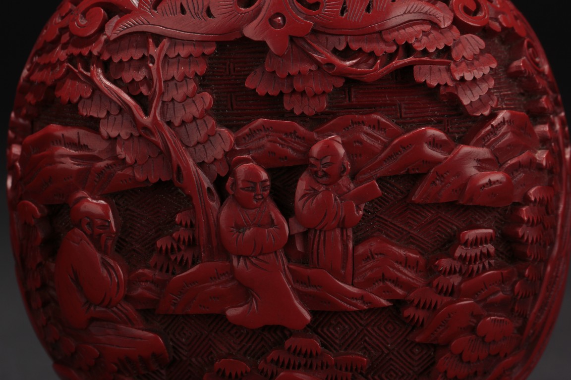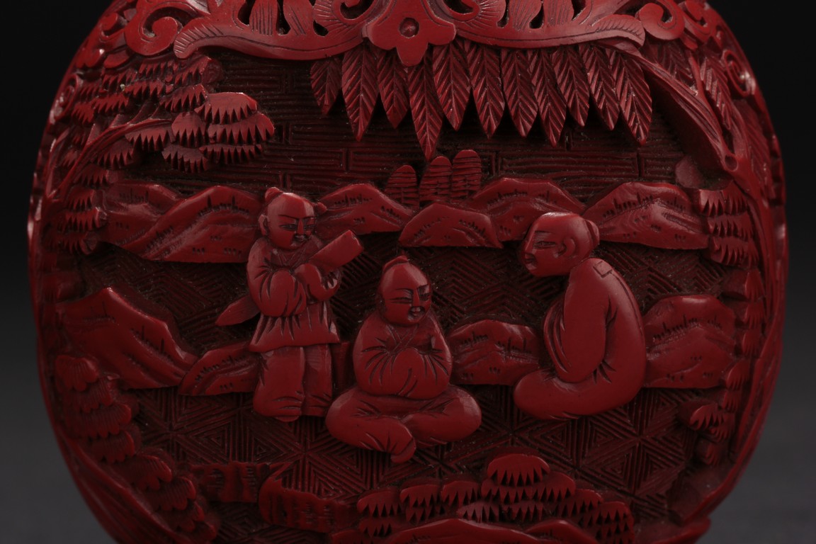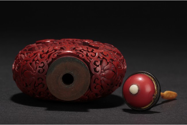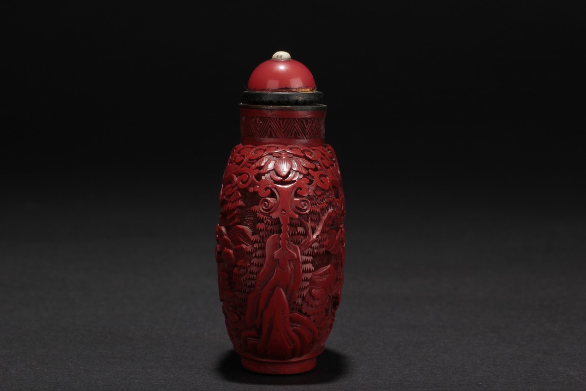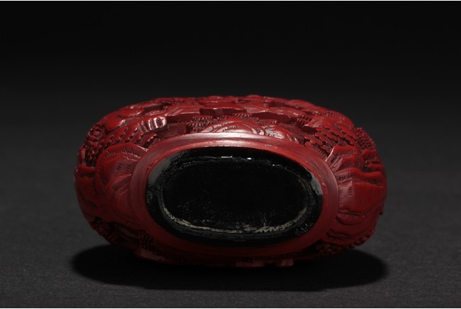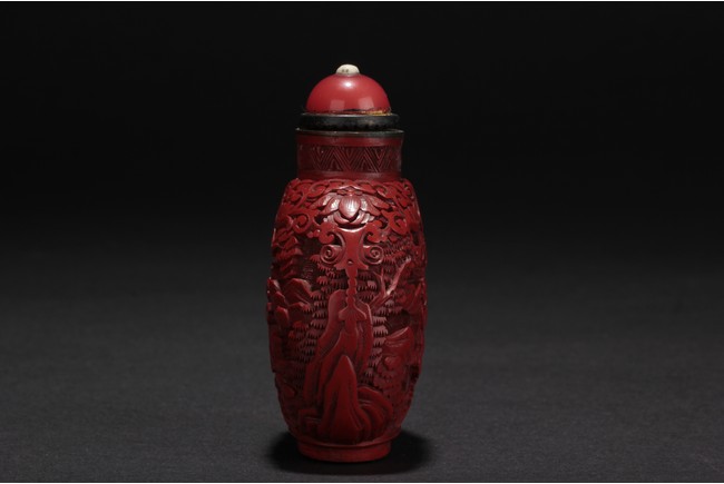 Of flattened ovoid form, the snuff bottle low relief carved with two scenes, one with three young boys gathering in a river and forest setting, other with an elder and two boys in mountain and forest setting, the top and sides carved with floral patterns. Qing Dynasty period.