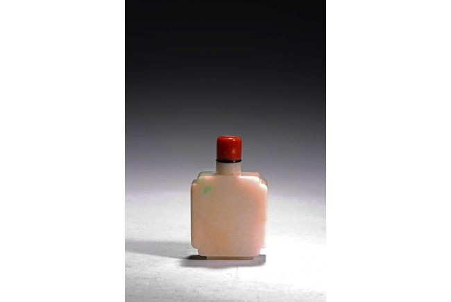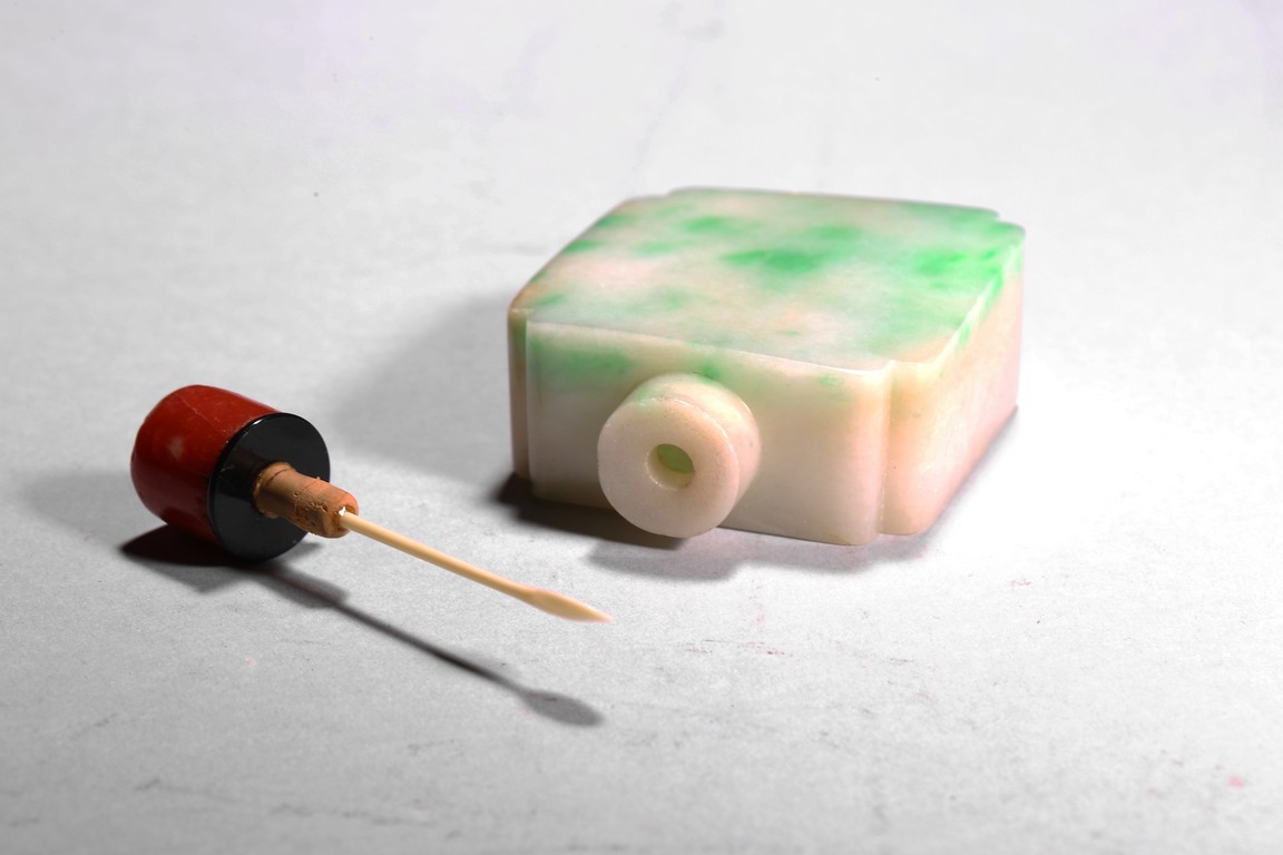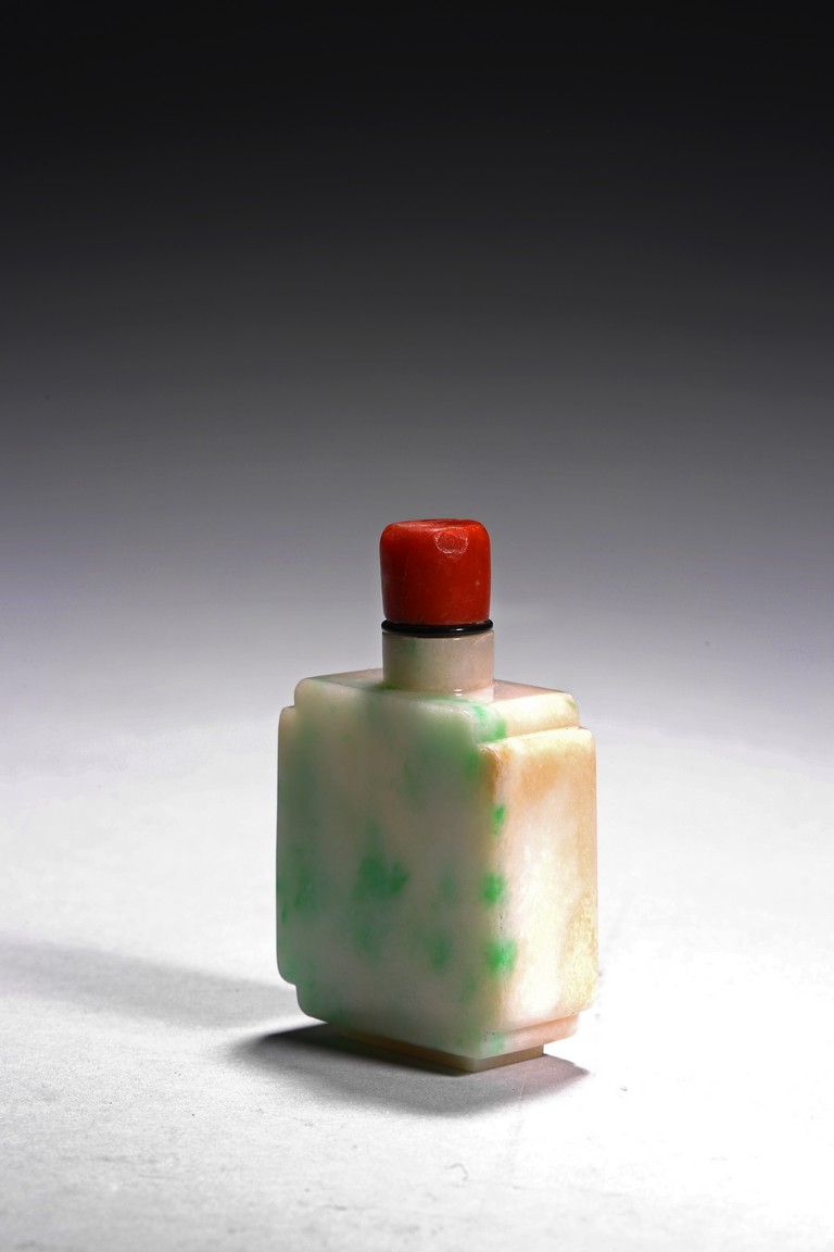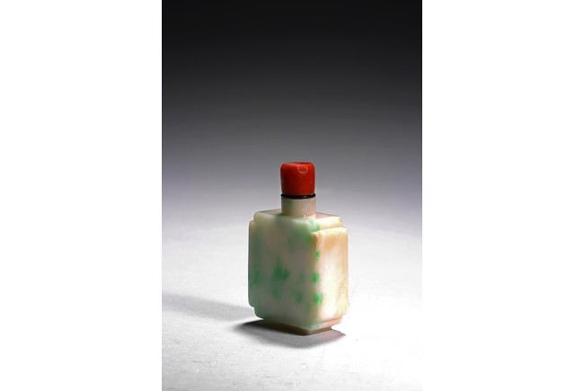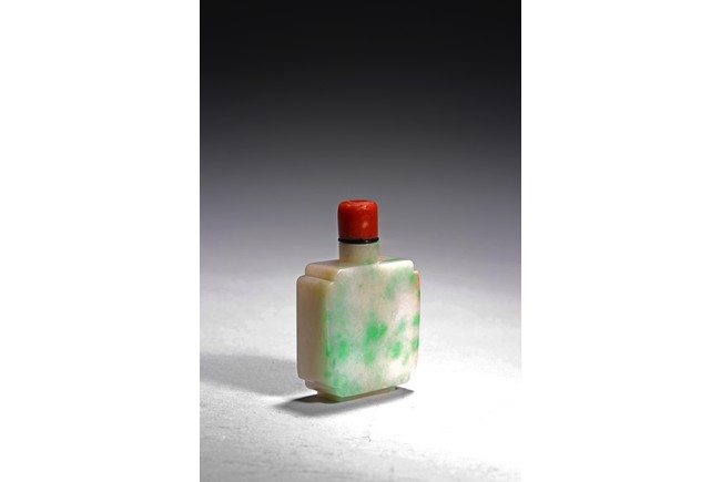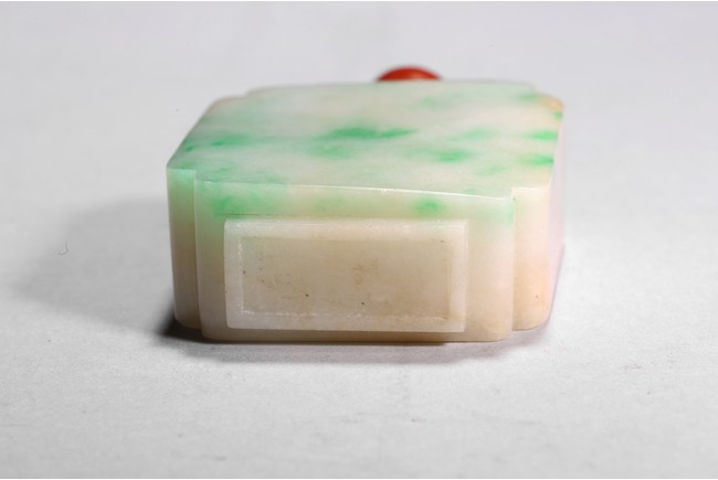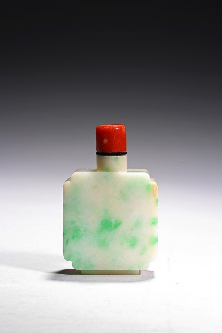 The flattened snuff bottle is of well polished plain design, with one side of green jadeite tone, the other side of white tone. Qing Dynasty period.