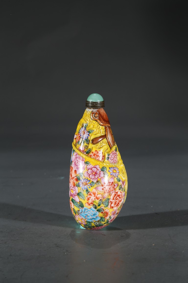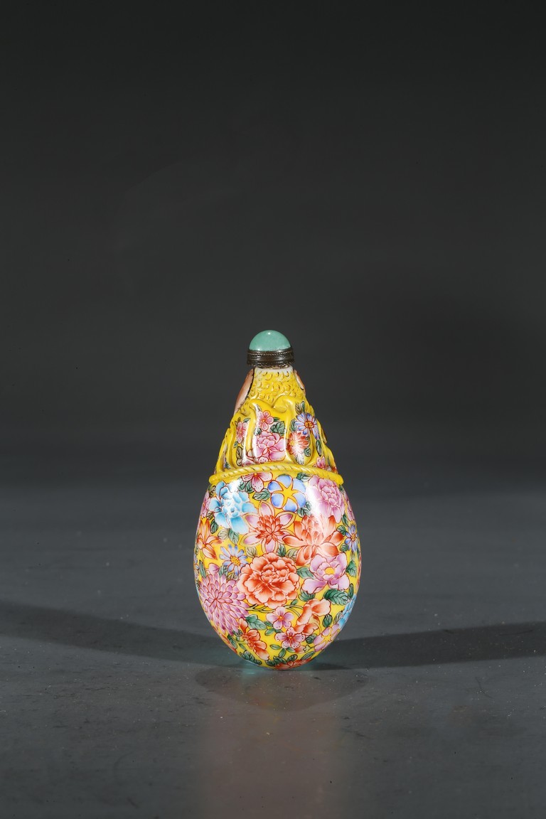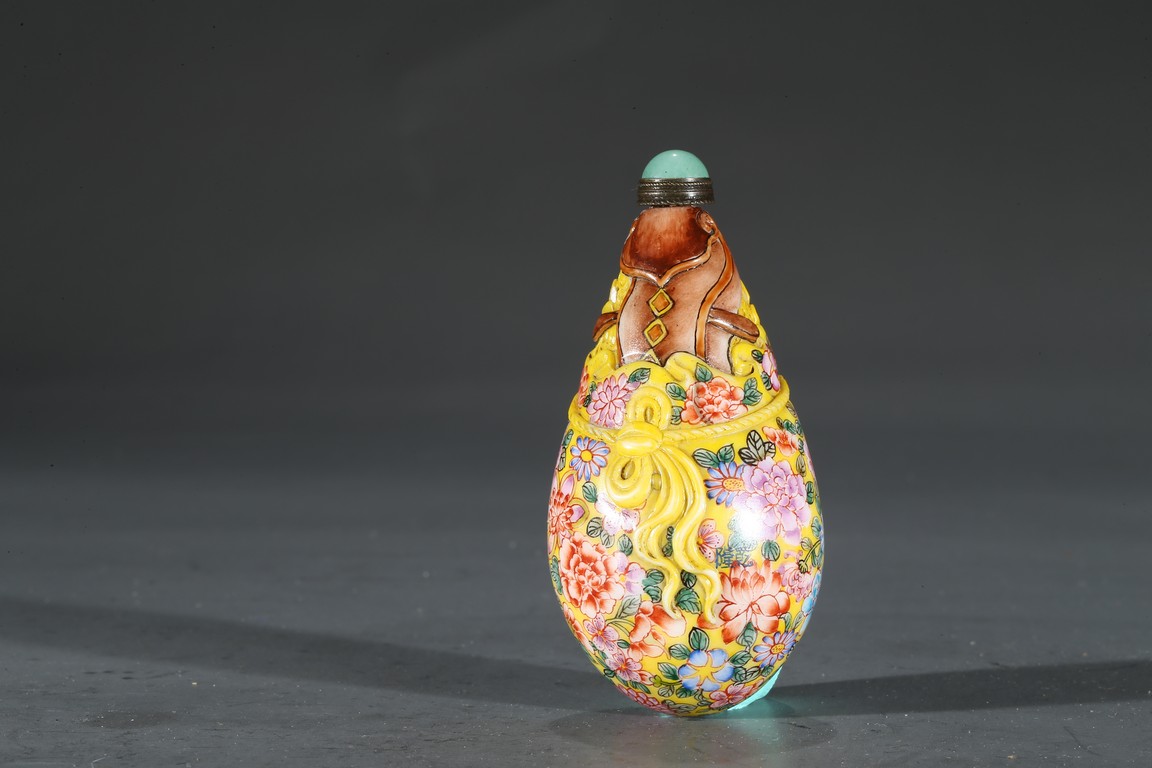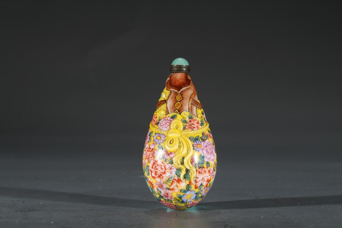 The snuff bottle brilliantly enamelled in vivid tones with various flower blossoms reserved on yellow ground, with raised ribbon tied to the middle. Qing Dynasty period.