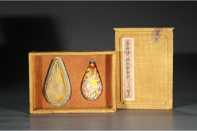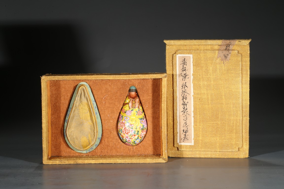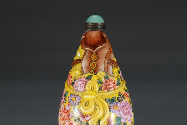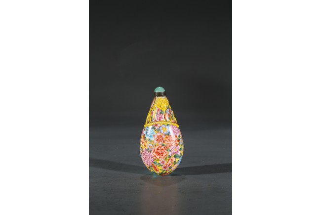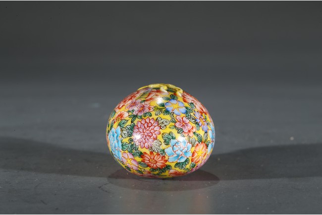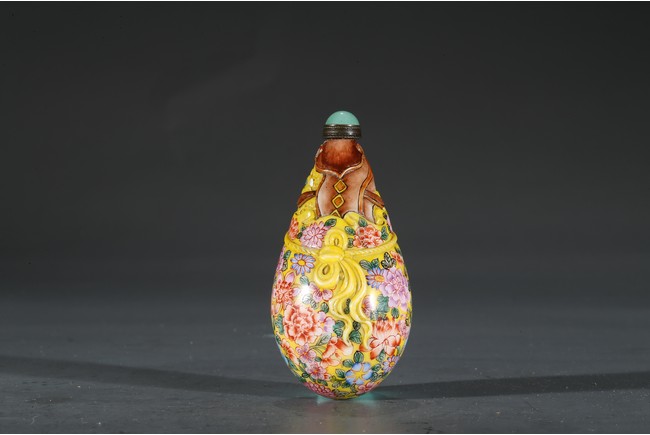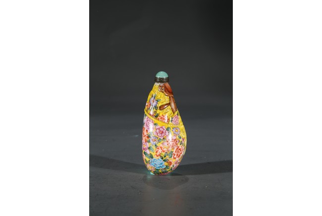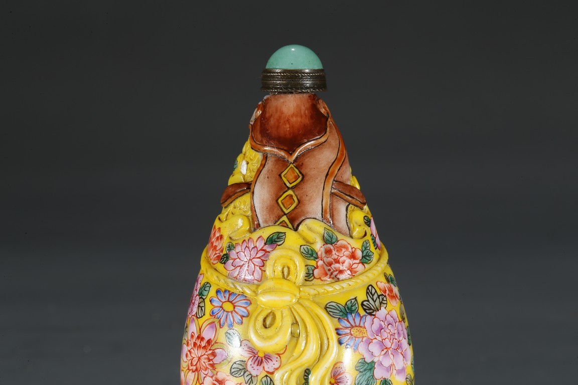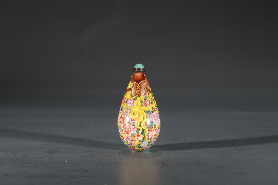 The snuff bottle brilliantly enamelled in vivid tones with various flower blossoms reserved on yellow ground, with raised ribbon tied to the middle. Qing Dynasty period.