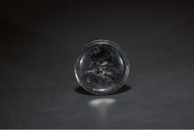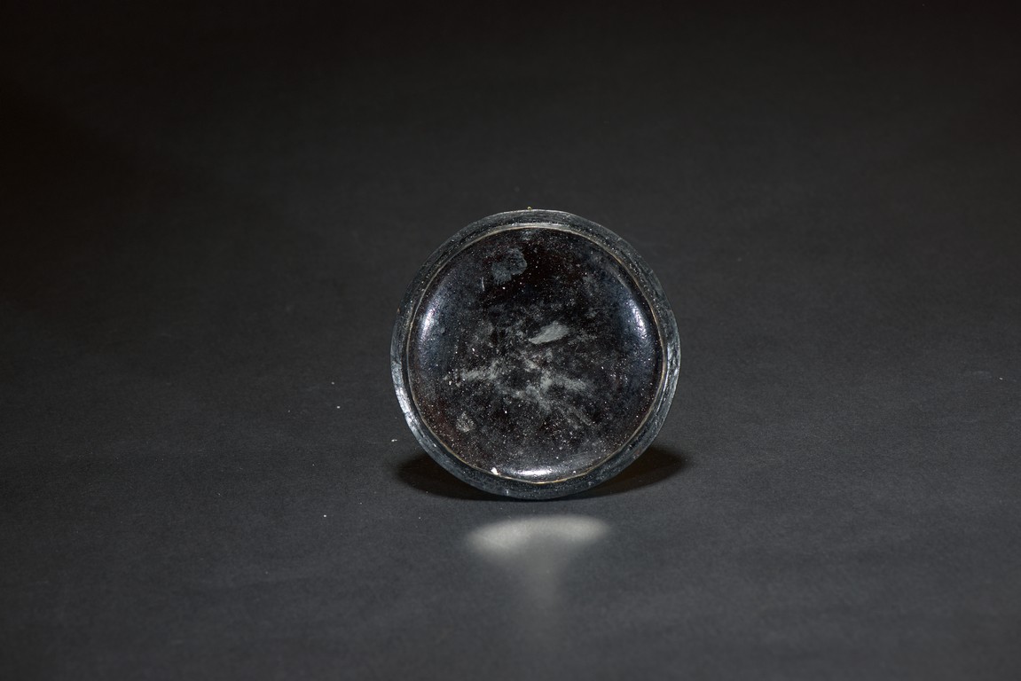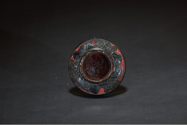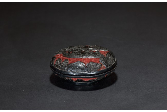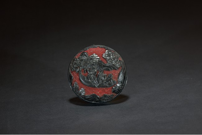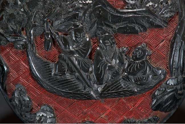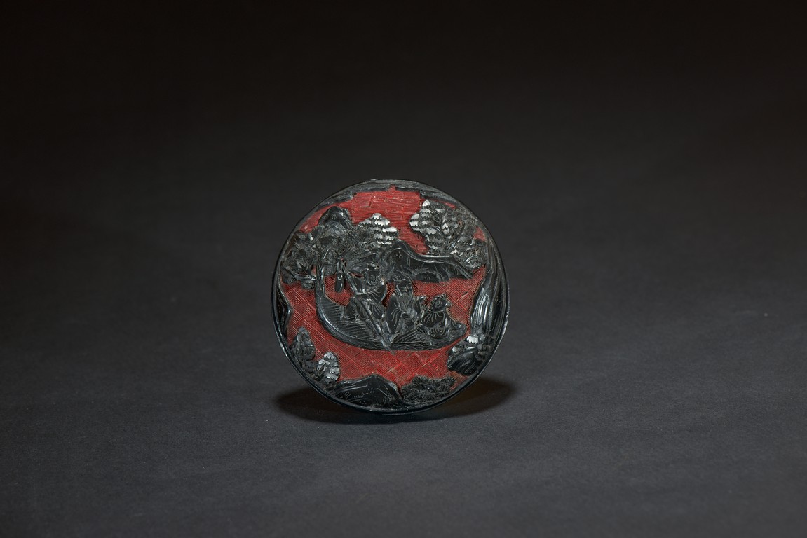 The paste box carved through to depict figures on a boat in a river, with rocks and pine in foreground and mountains to the distance. Qing Dynasty