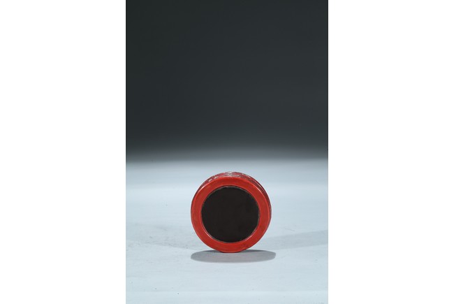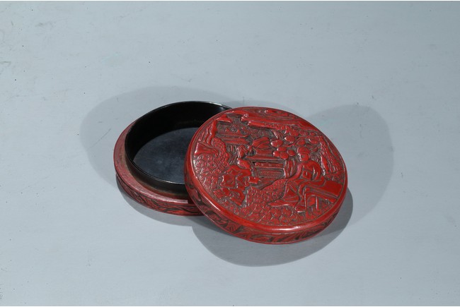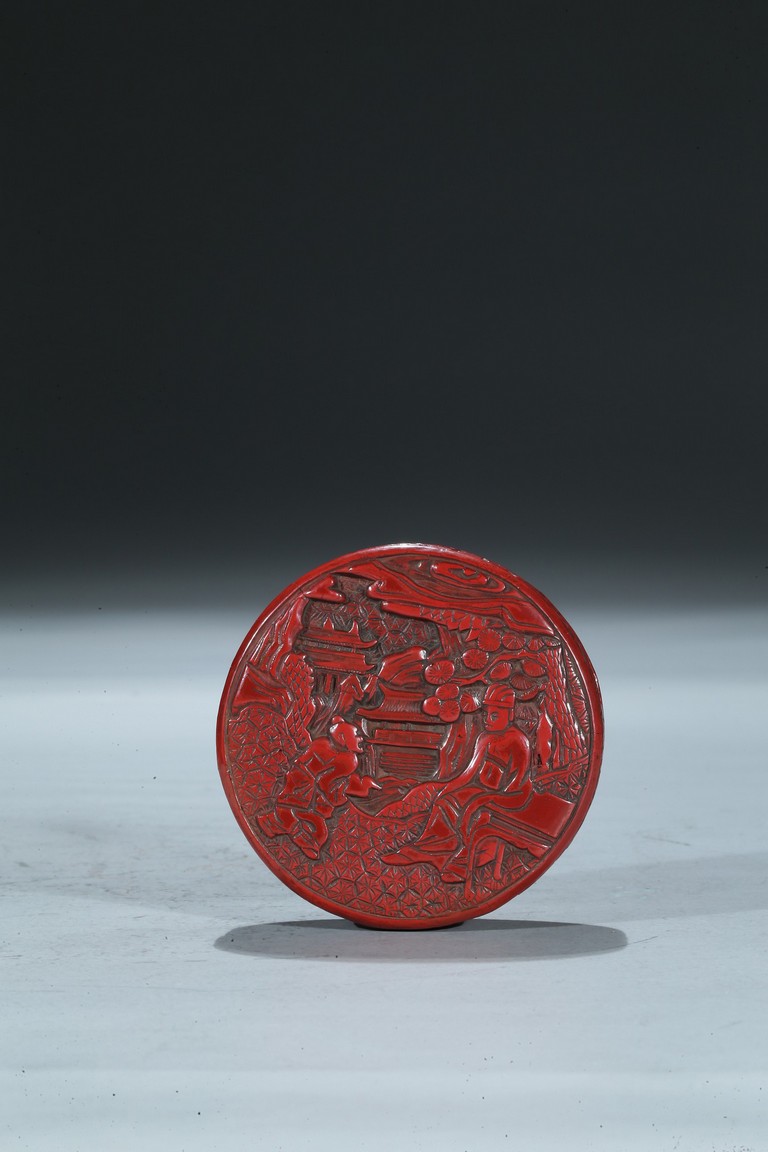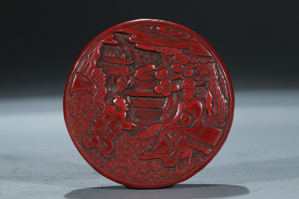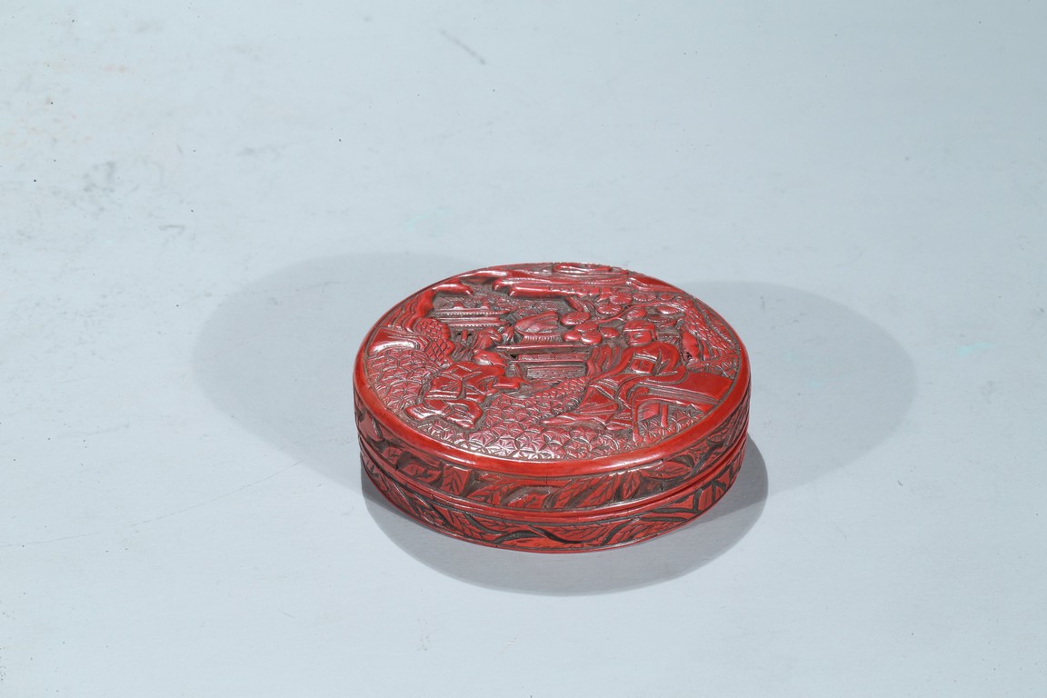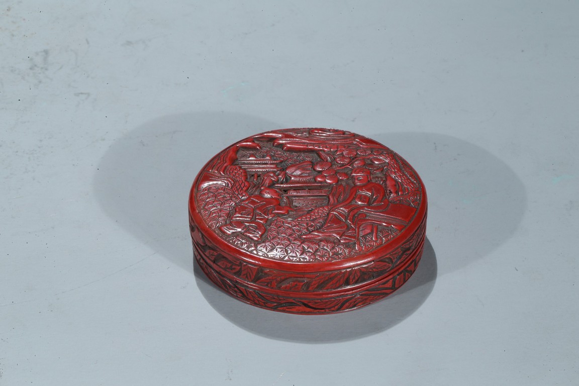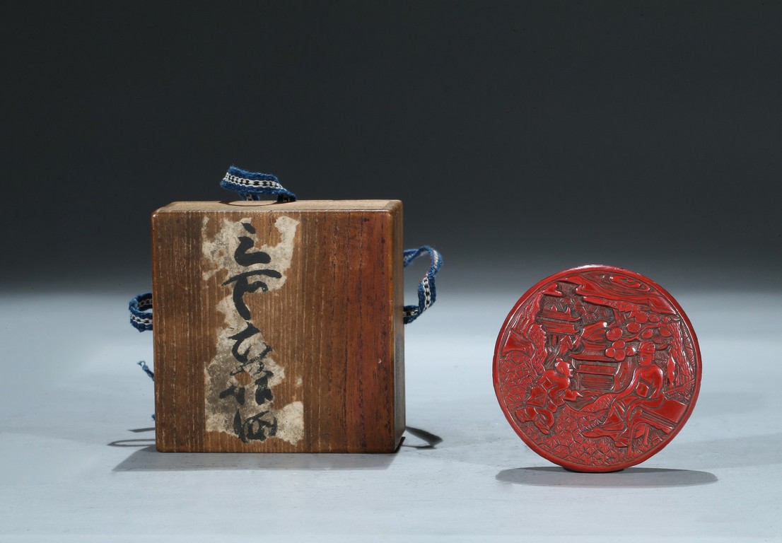 Of circular form, the box cover is finely carved well carved through the thick cinnabar lacquer to depict a literati figure sitting on a chair listening to his young attendant , with pine tree and pavilions in the background. the sides carved with stylized leaf scroll. Accompanied with a Japanese wood box. Ming Dynasty period.