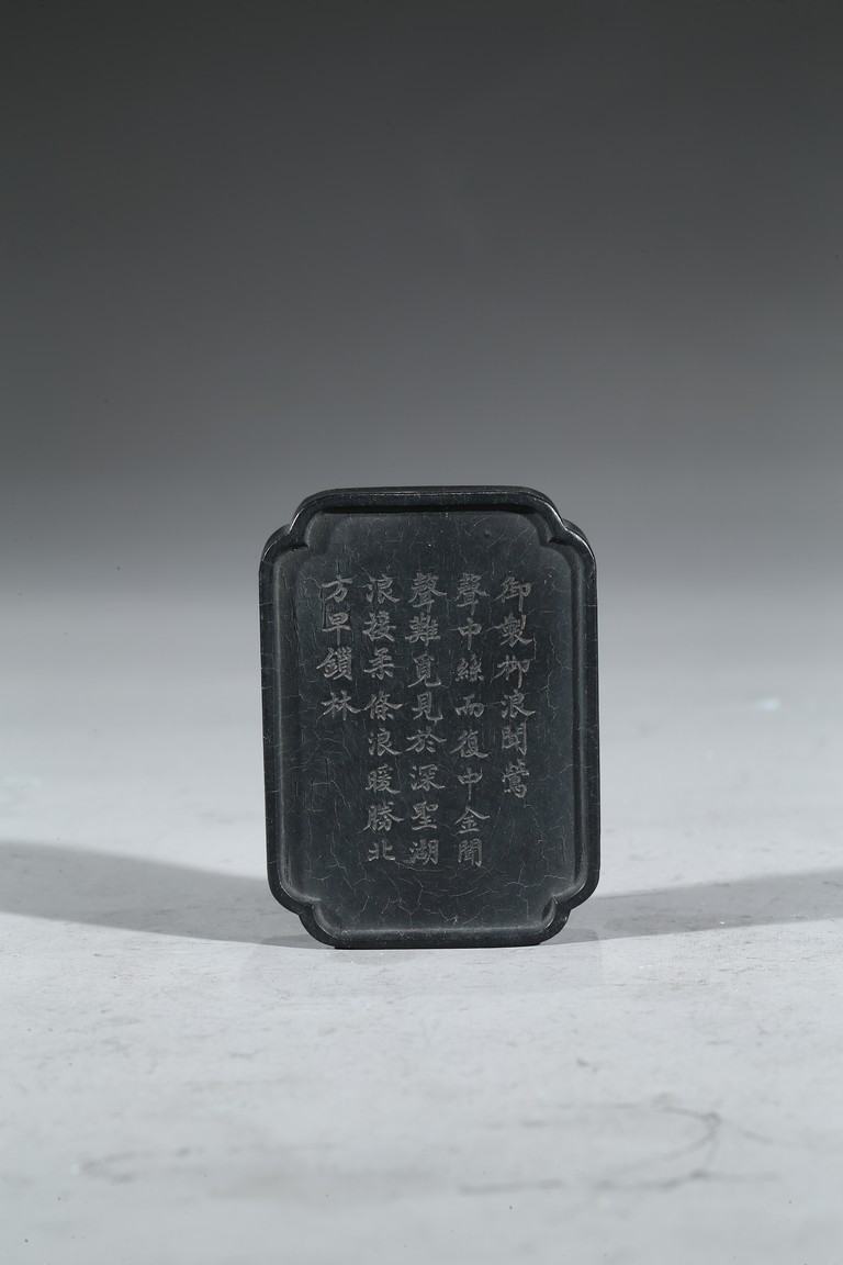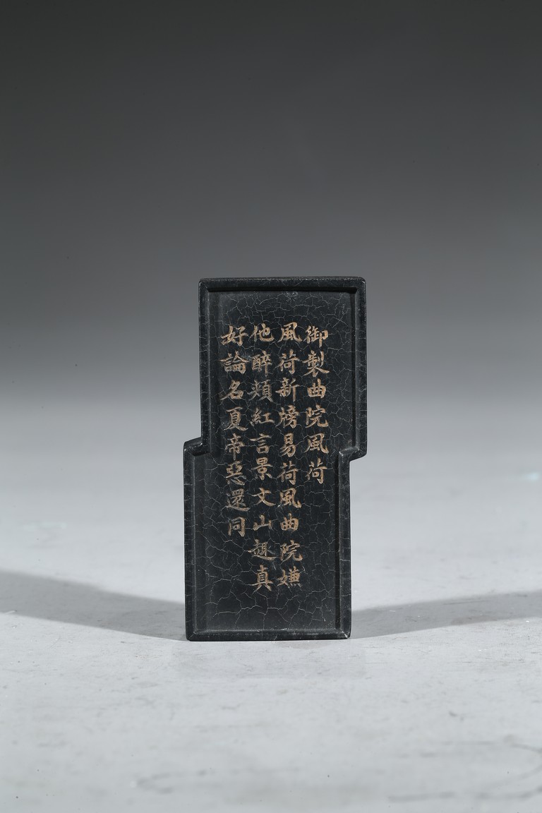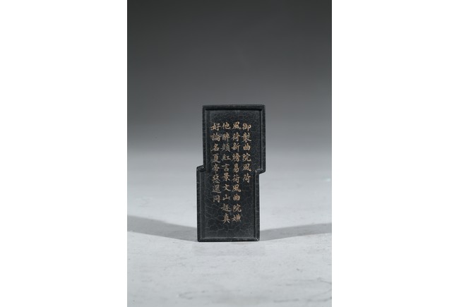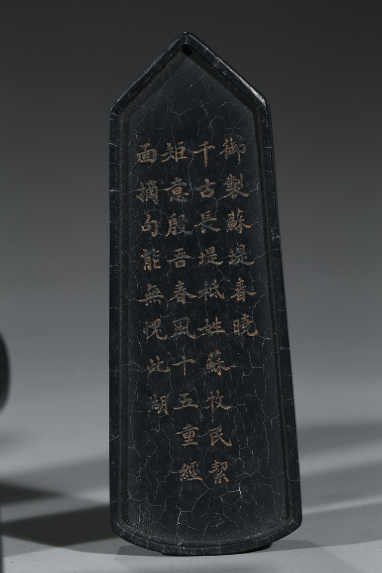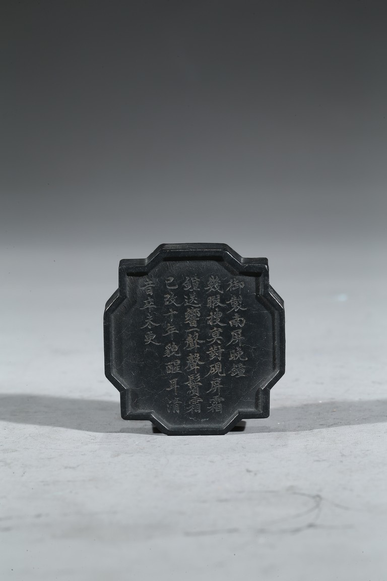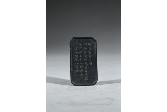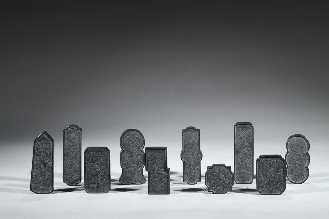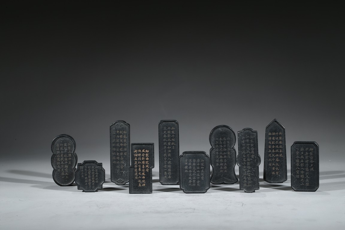 Comprising of ten inkcakes moulded in various shapes, all inscribed in Imperial poems and further inscribed on the sides of each inkcake. Qing Dynasty period.