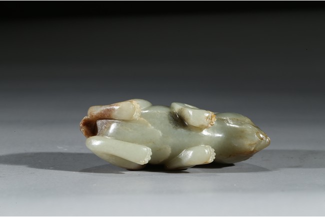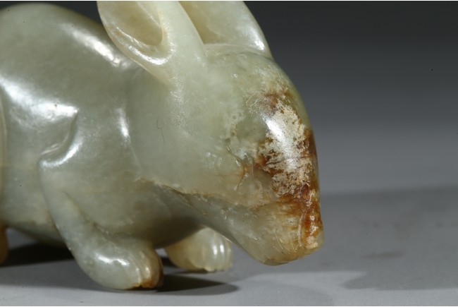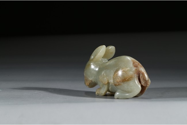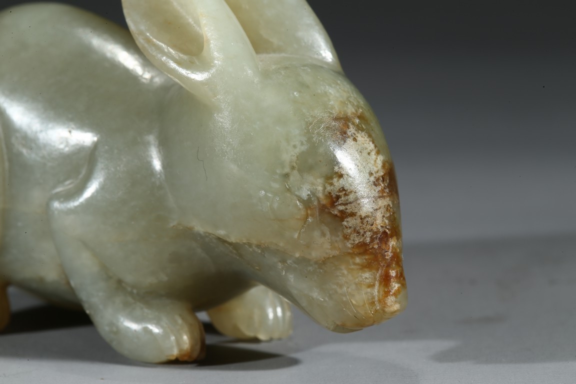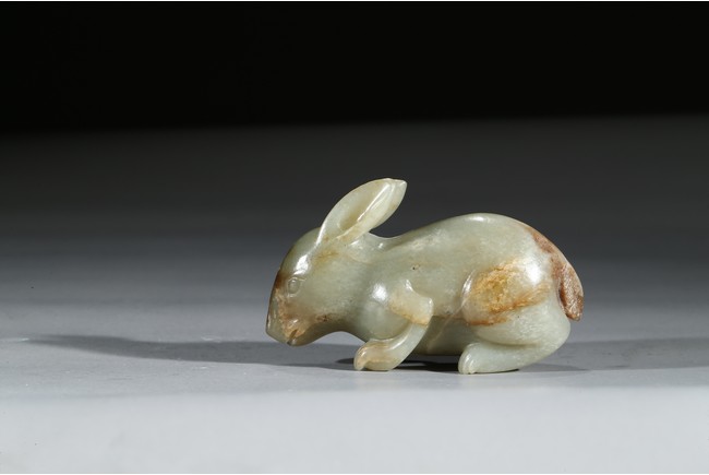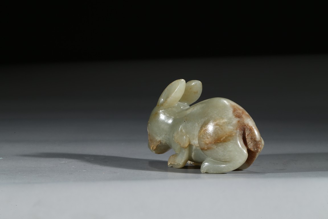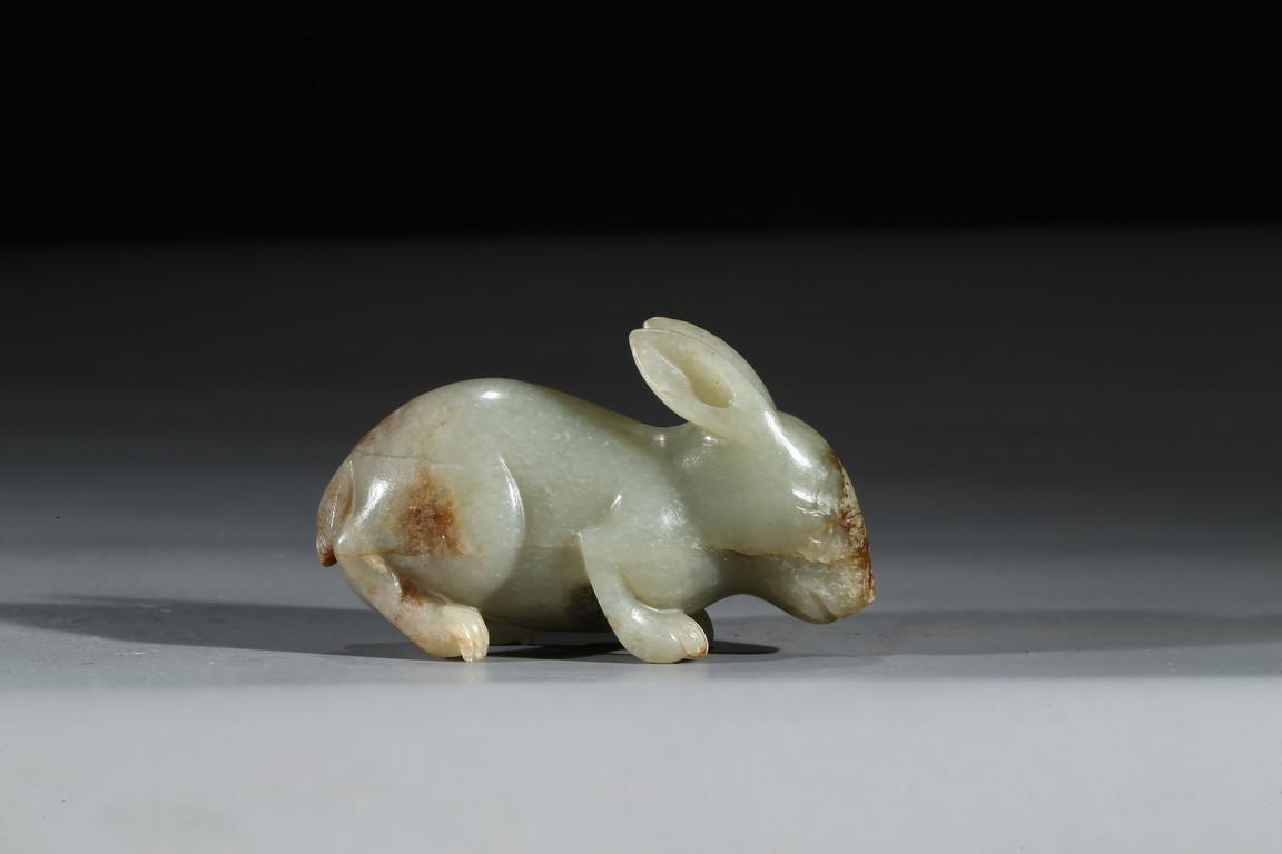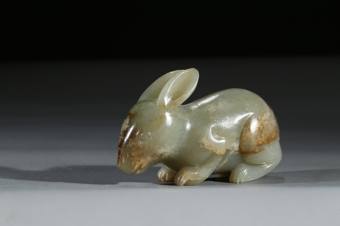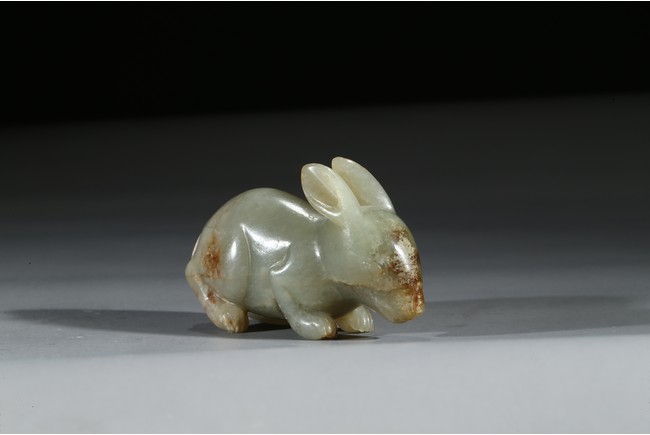 青玉質,局部沁色,立體圓雕。兔俯臥狀,前腿前伸,後腿臥於腹下,背部拱起,短尾,造型飽滿嬌俏,生動喜人,兔在中國傳統文化中是吉祥動物,福氣十足。