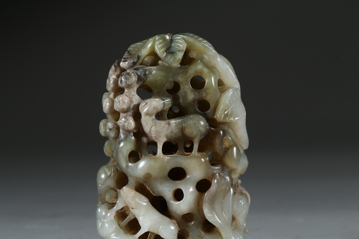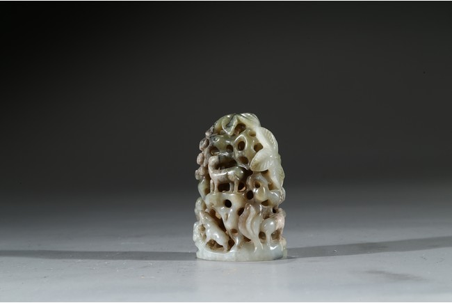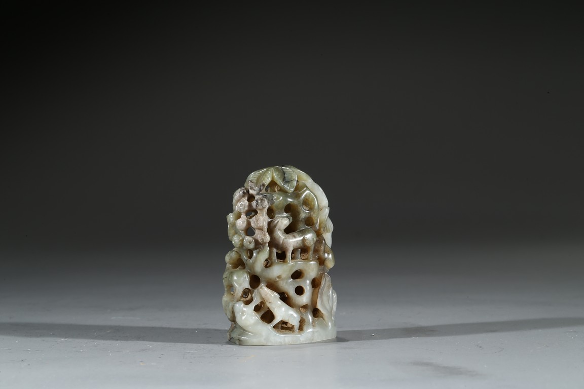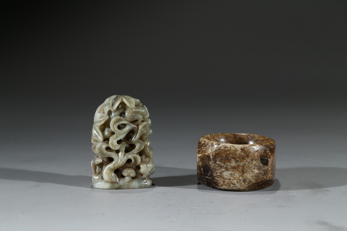 Comprising of a calcified mottled black and white cong; and a finely reticulated jade finial depicting animals on pierced rockworks within a garden setting. Shang Dynasty and Yuan Dynasty period.
