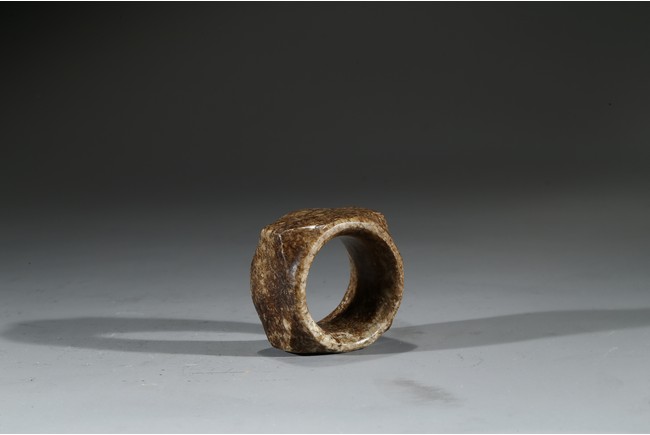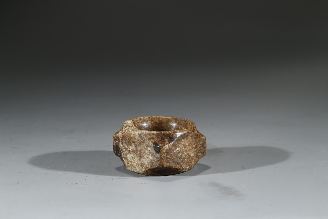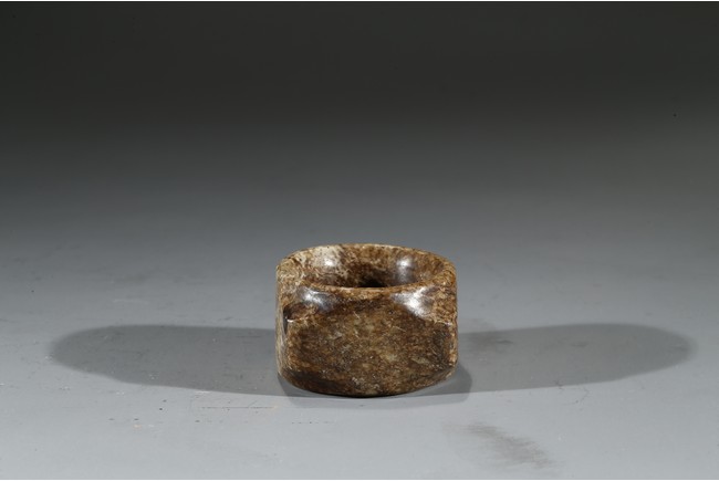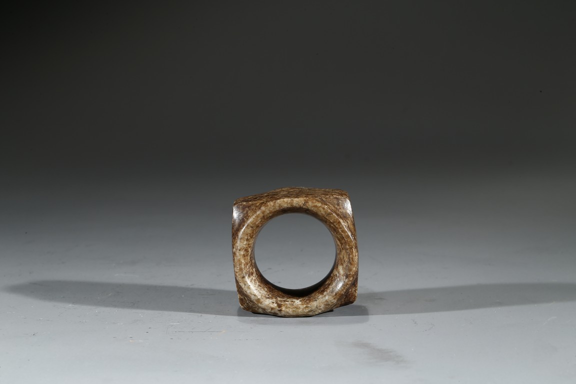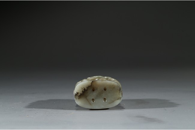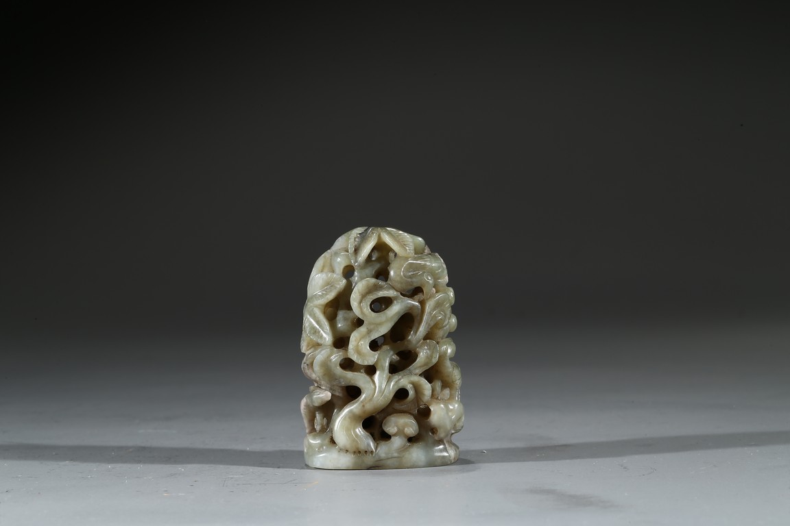 Comprising of a calcified mottled black and white cong; and a finely reticulated jade finial depicting animals on pierced rockworks within a garden setting. Shang Dynasty and Yuan Dynasty period.