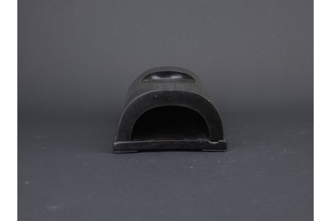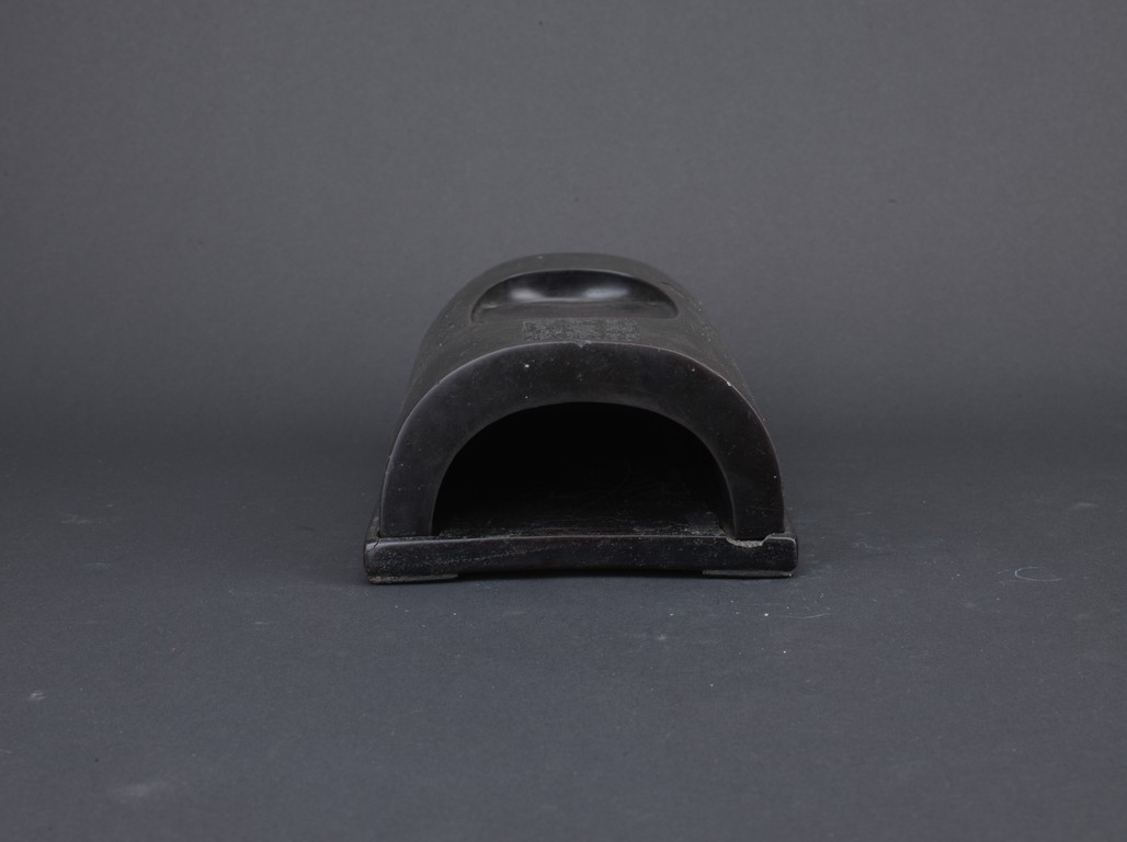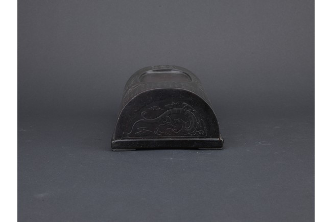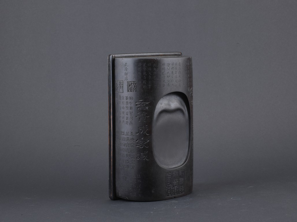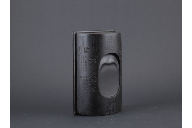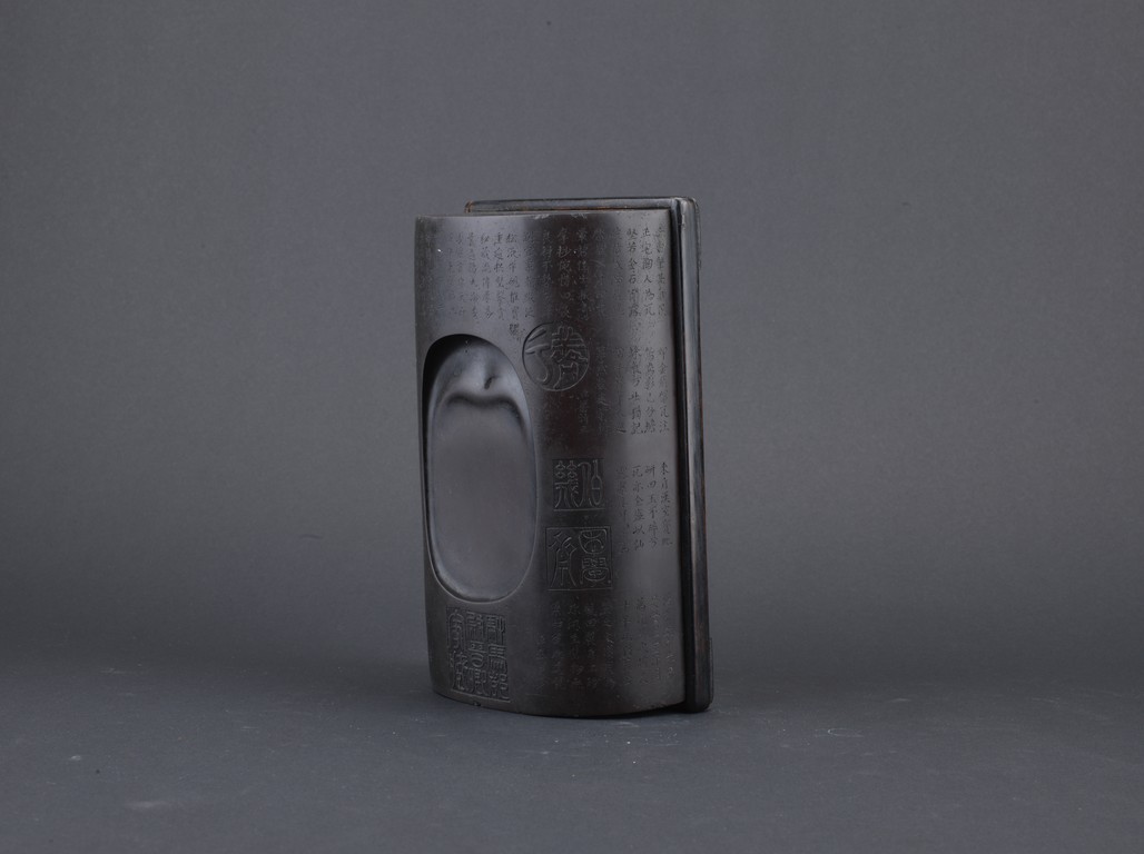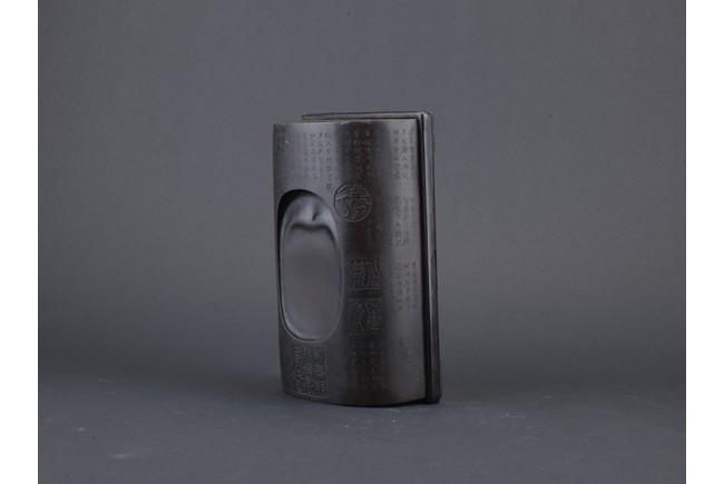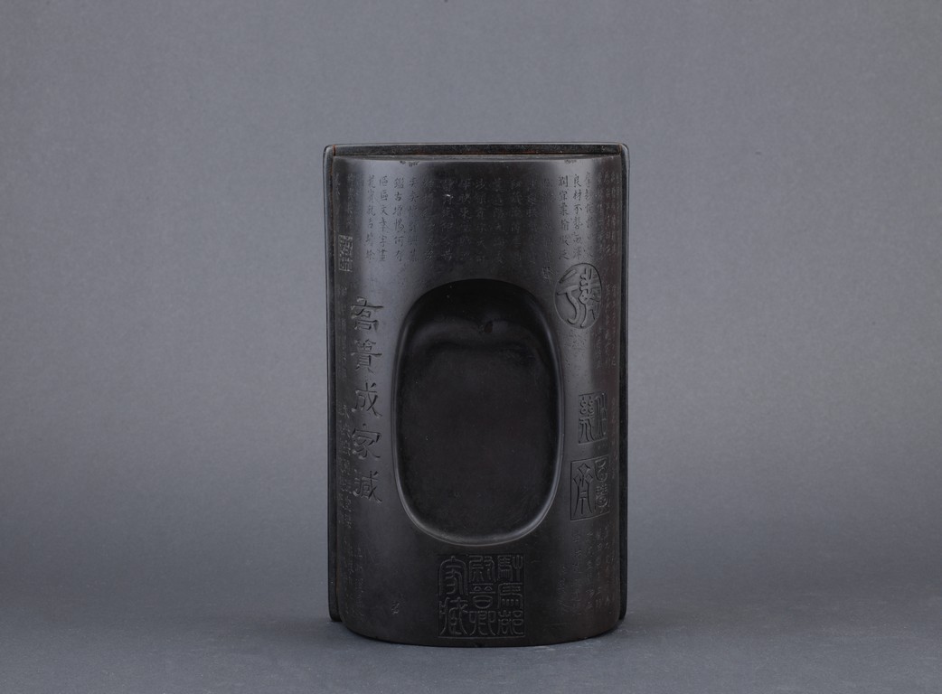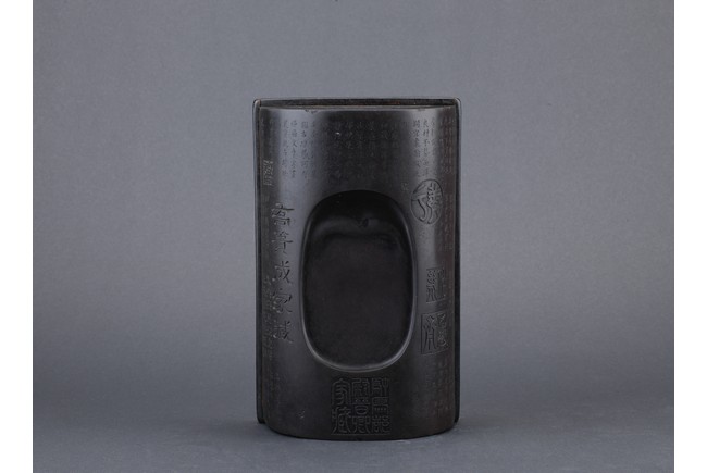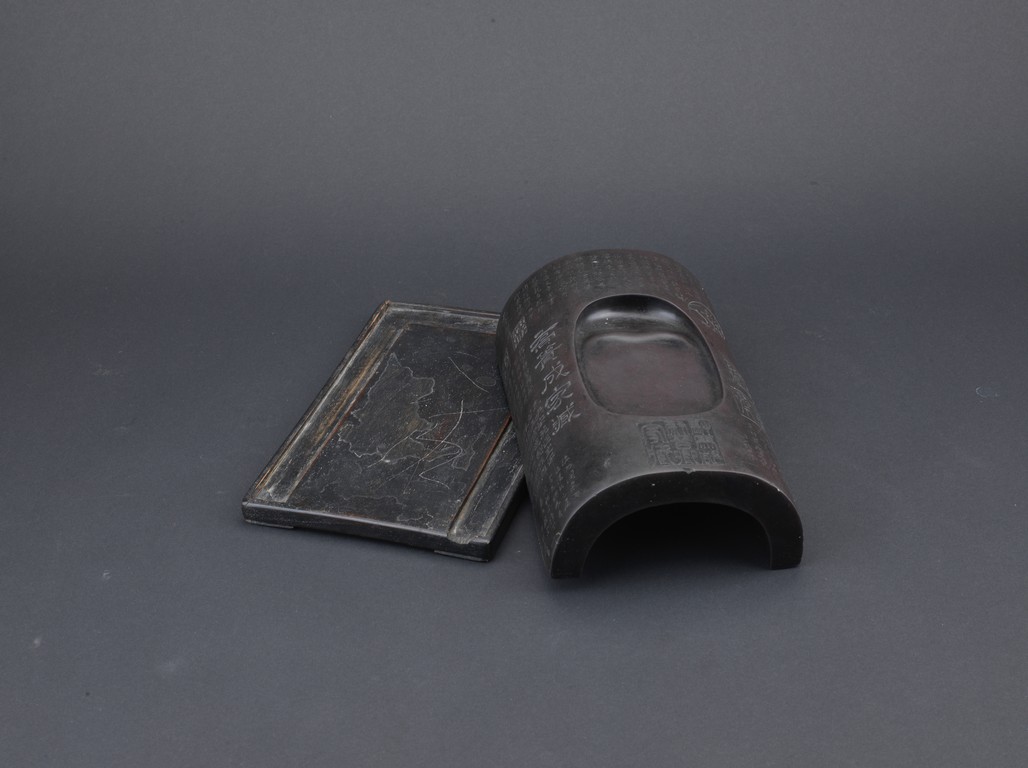 Modelled in the form of a roof tile, the rectangular tile arched in the middle and slanted to the long sides, the center carved with an oblong inkwell, framed by inscriptions in varying scripts and seal marks, the reverse underside carved in high relief inscription attributed to Xiao He dedicated to Northern Room of Wei Yang Palace, the stone surface of dark brown color. Qing Dynasty period.