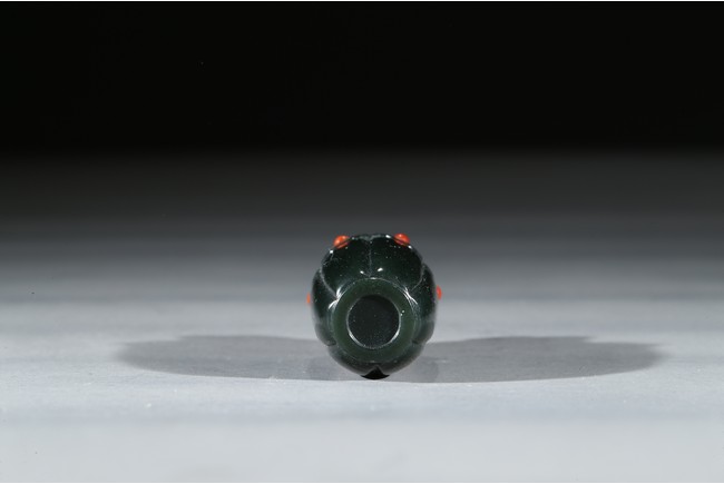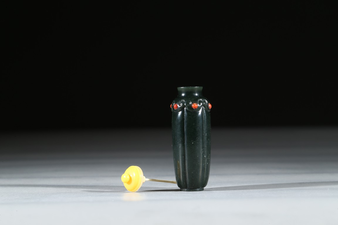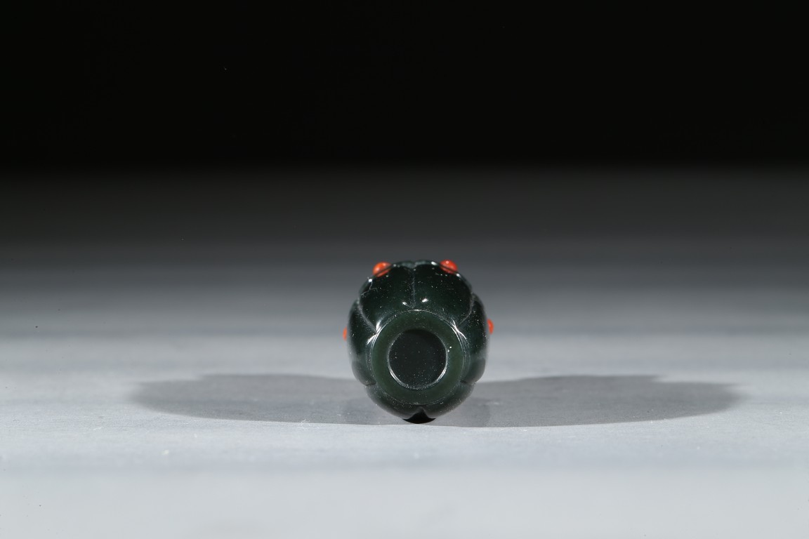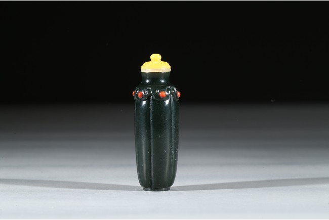Of tall melon form with eight lobes, embellished with a band of red agate beads, with glass stopper. Qing Dynasty period.