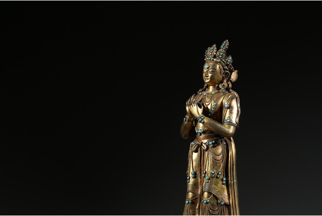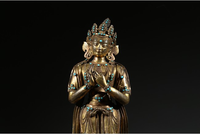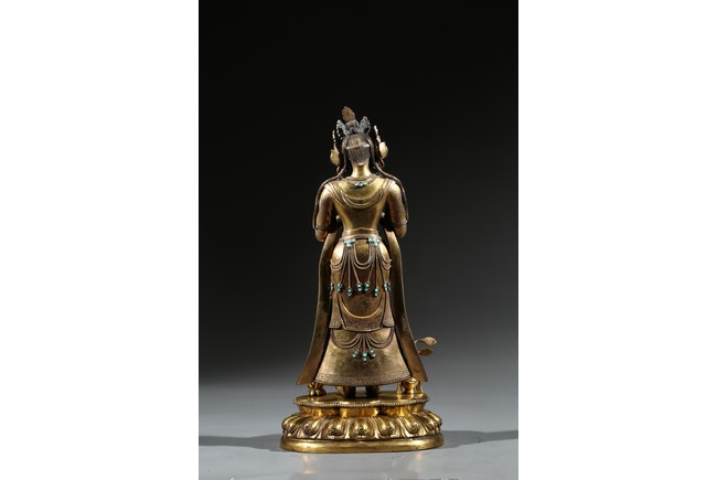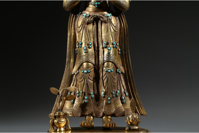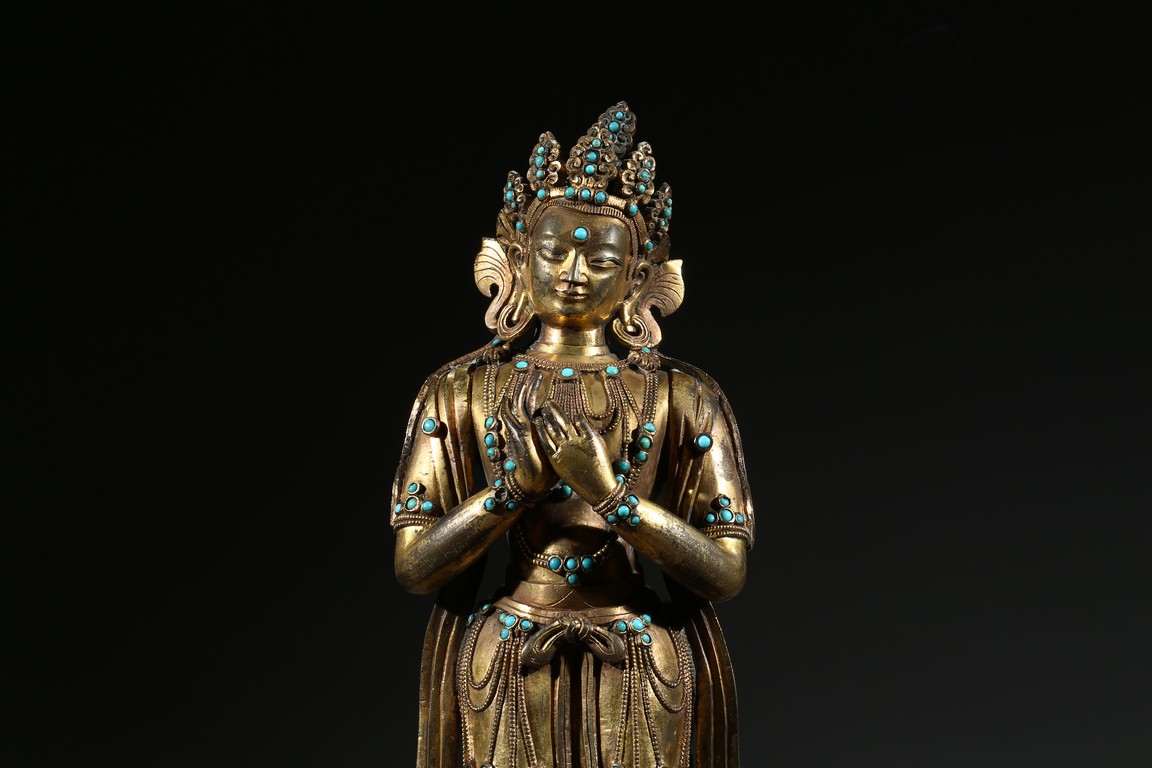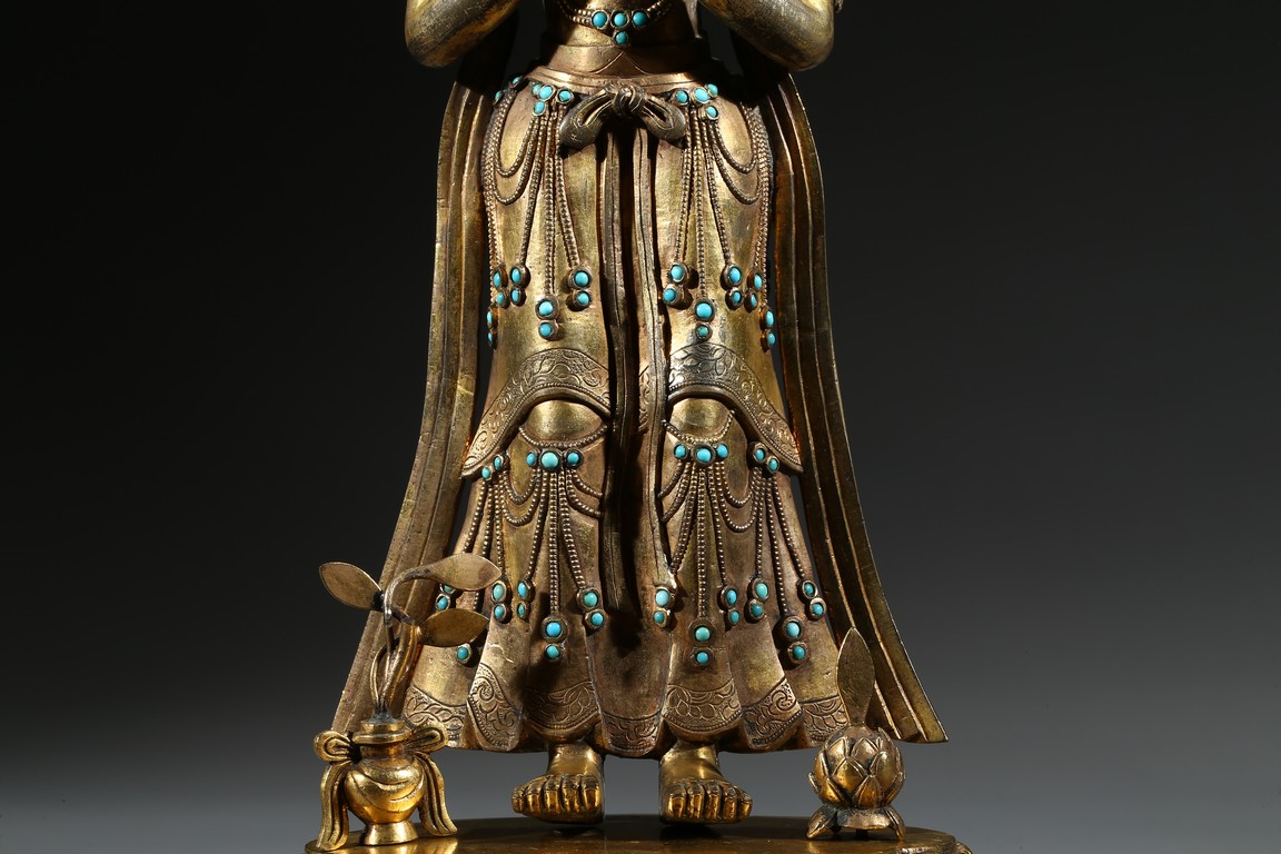 The bodhisattva is shown standing on a raised pedestal, both hands raised in mutra in front of chest, the body dressed in loose dhoti and adorned with elaborate jewelry embellished with beaded turquoise decorations, the face with calm expression and topped with a delicate headdress. Qing Dynasty Qianlong period.