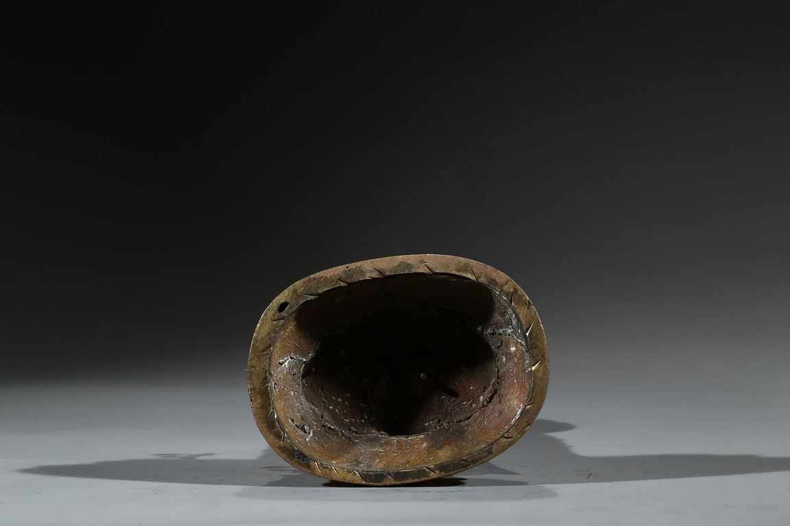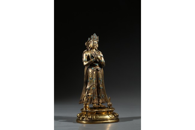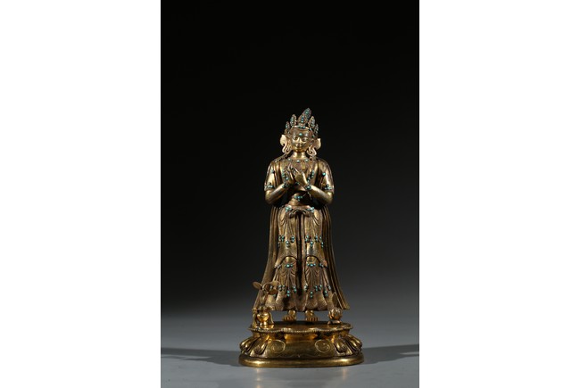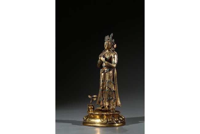 Provenance: Private Long Island, New York collection 此尊頭戴寶冠,面龐圓腴,白毫圓凸,彎眉與鼻脛相連,相容和煦。肩胸寬厚,肢體圓渾,袒上軀,披帛帶,胸前飾有華美的瓔珞。右手當胸結三寶印。整像鑄造工藝精良,金色燦然,白毫及寶冠、瓔珞釧鐲等部位鑲嵌綠松石。下承單層覆式蓮座。造像整體鎏金色澤光亮,全身嵌綠松石,鑄胎厚重,精美華麗,工藝純熟,線條流暢,深具清中期宮廷造像風格,彌足珍貴,殊宜寶之。彌勒菩薩是釋迦牟尼佛的繼任者,將在未來娑婆世界降生成佛,成為娑婆世界的下一尊佛,在賢劫千佛中將是第五尊佛,在佛教世界中,兼有菩薩和佛陀的雙重身份。據佛經記載,彌勒出生於古印度波羅奈國的一個婆羅門家庭,與釋迦牟尼佛生活於同一時代,後師從釋迦牟尼佛出家,並成為其著名的弟子。其後先於釋迦牟尼佛入滅後,上生兜率天宮,為諸天演說佛法,兜率天宮因而又有彌勒淨土之稱。在釋迦佛滅度後五十六億六千萬年時,將從兜率天宮下降人間,投生到一位大臣家中。而後與釋迦牟尼佛一樣,歷經降生、出家、成道、說法等歷程,最後在華林園龍華樹下成佛,繼釋迦牟尼佛化度無量無邊眾生。在時間上,與過去佛燃燈佛和現在佛釋迦牟尼佛相對,又被稱之為“未來佛”。