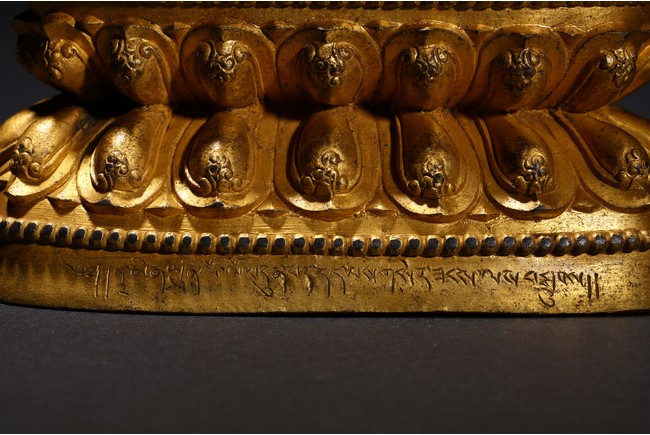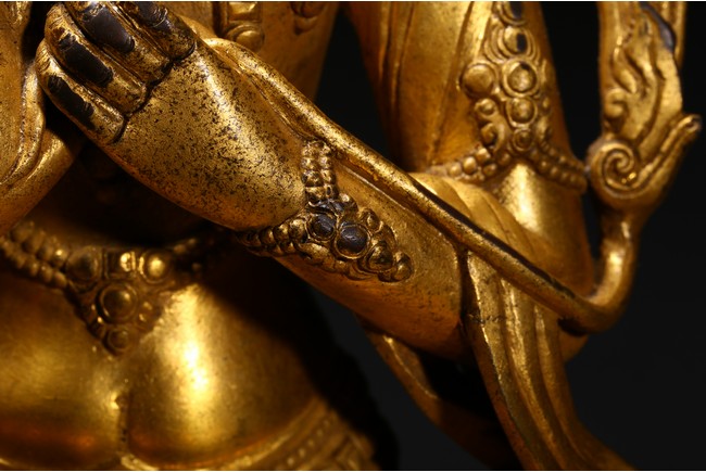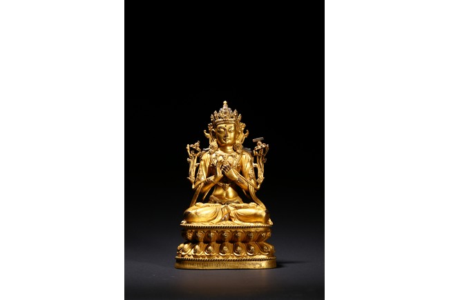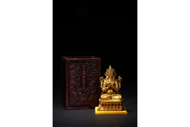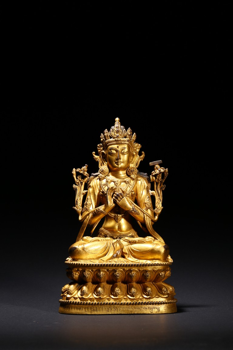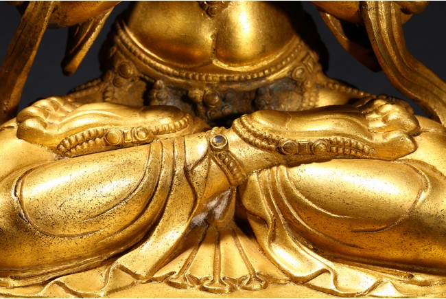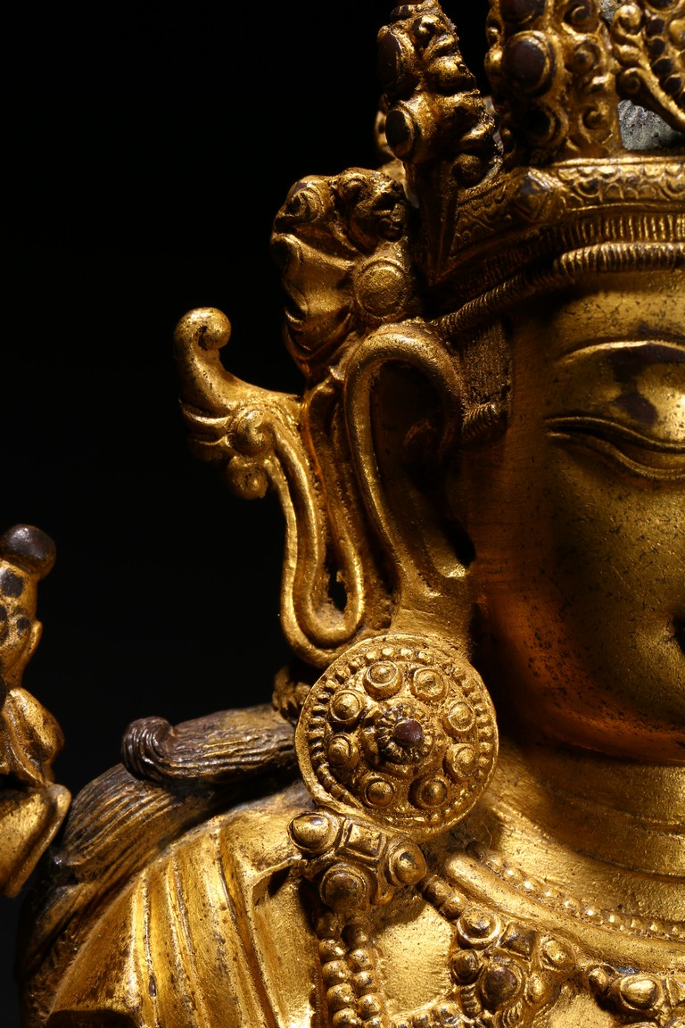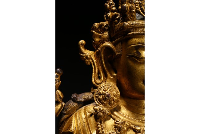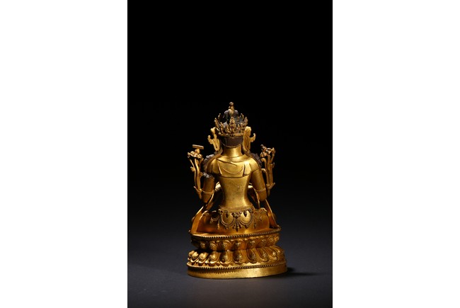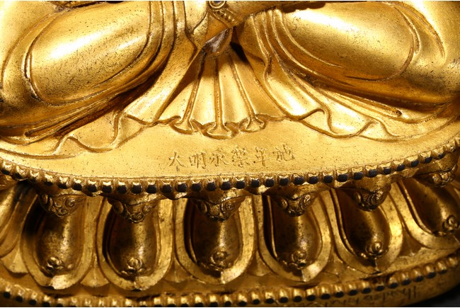 Cast seated in dhyanasana on a double-lotus pedestal, the arms raised in dharmachakra mudra to the chest, holding two stalks of uptala lotuses rising up the shoulders, the gracefully swaying figure wearing a dhoti falling into elegant pleats, draped with a celestial scarf around the shoulders and arms, the chest and the waist adorned by elaborate beaded necklaces, the face with a benevolent expression, surmounted by a five-leaf diadem around a high chignon, the lotus base incised with a reign mark reading Da Ming Yongle nian shi. Ming Dynasty Period.