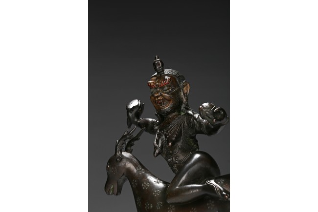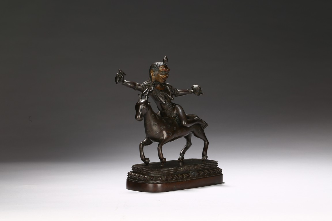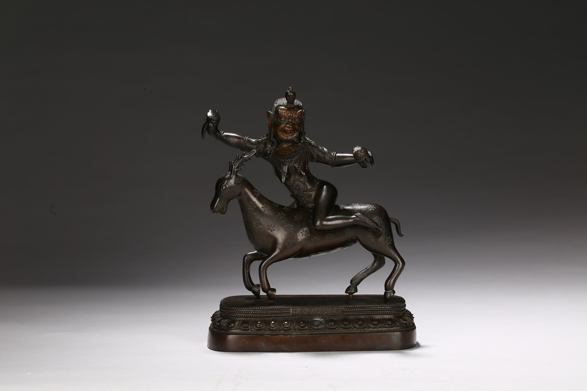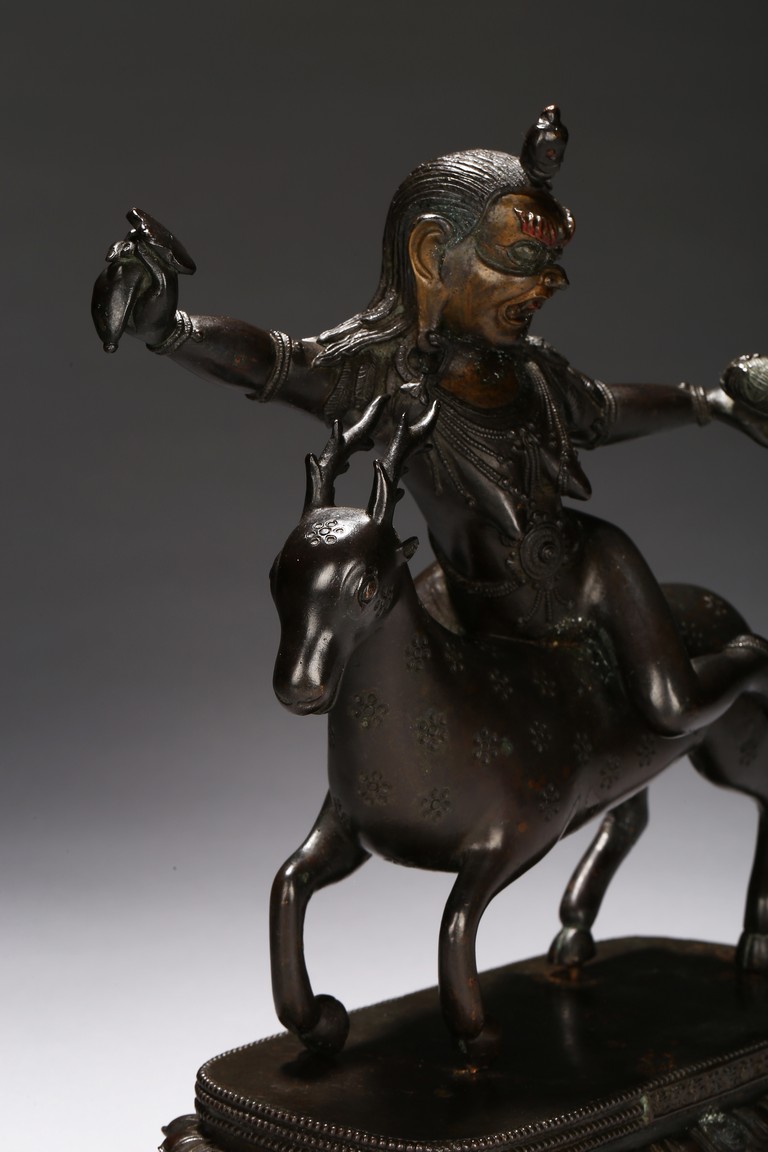 The deity is shown seated on a deer upon a lotus throne cast with six character reign mark , both hands outstretched holding a ritual object, face with ferocious expression, body adorned with beaded jewellry. Qing Dynasty period.