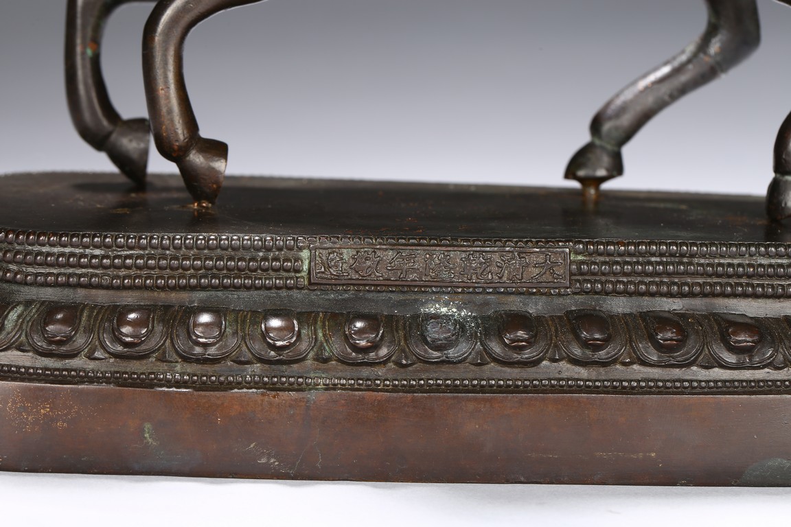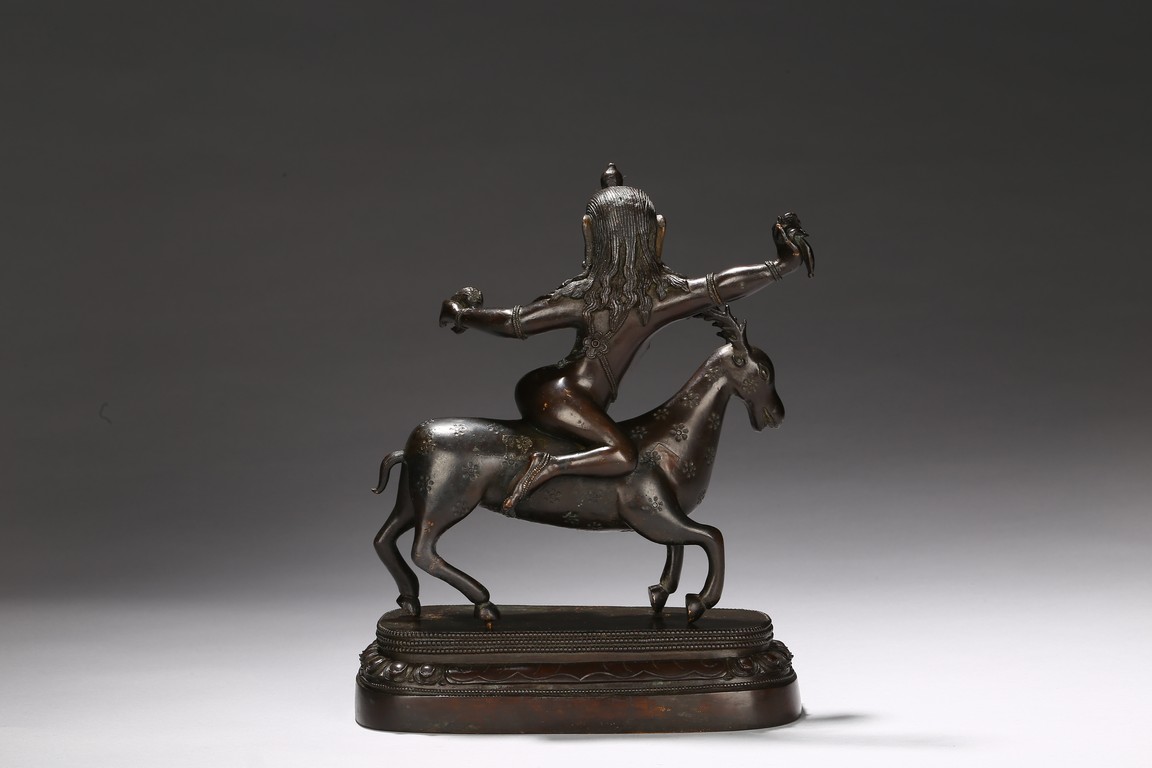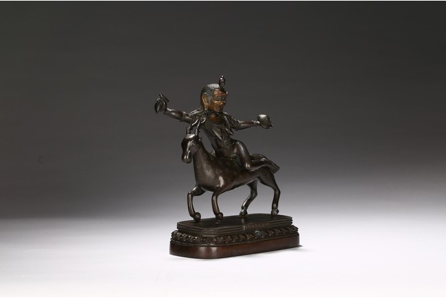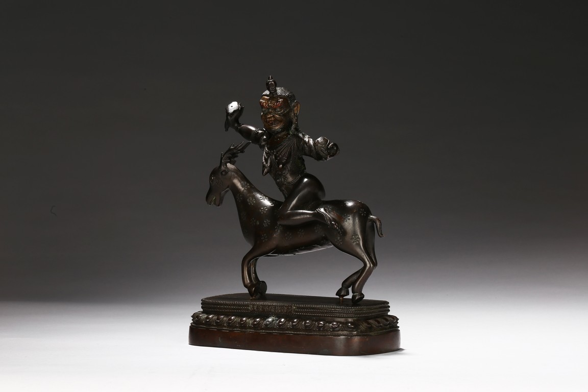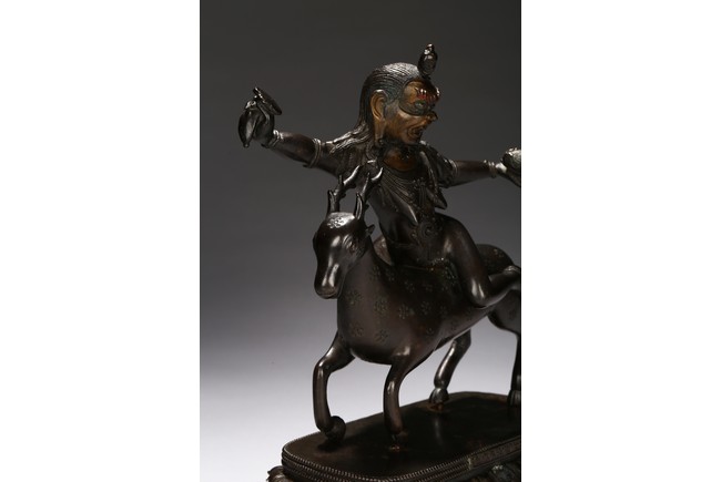 The deity is shown seated on a deer upon a lotus throne cast with six character reign mark , both hands outstretched holding a ritual object, face with ferocious expression, body adorned with beaded jewellry. Qing Dynasty period.