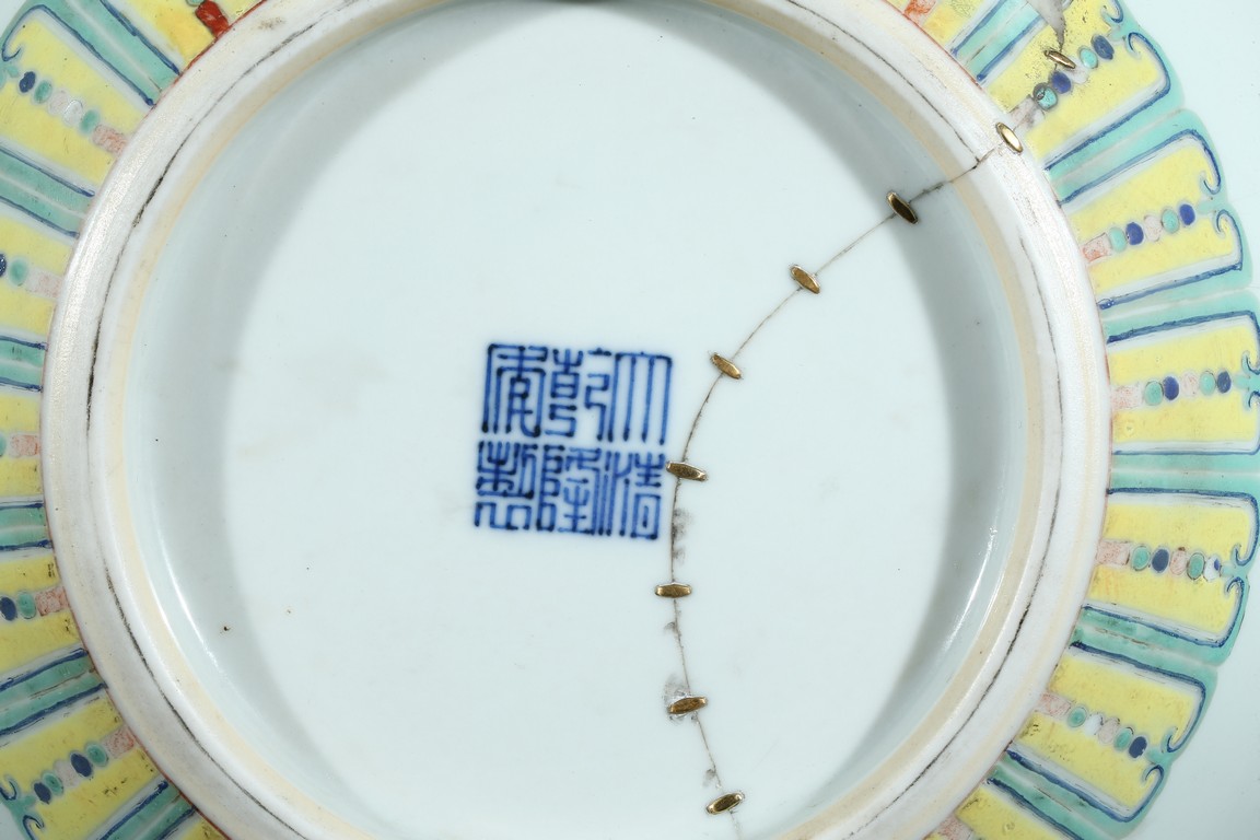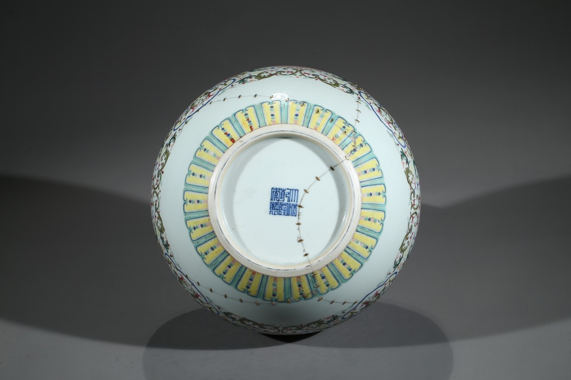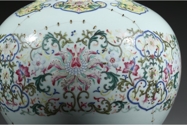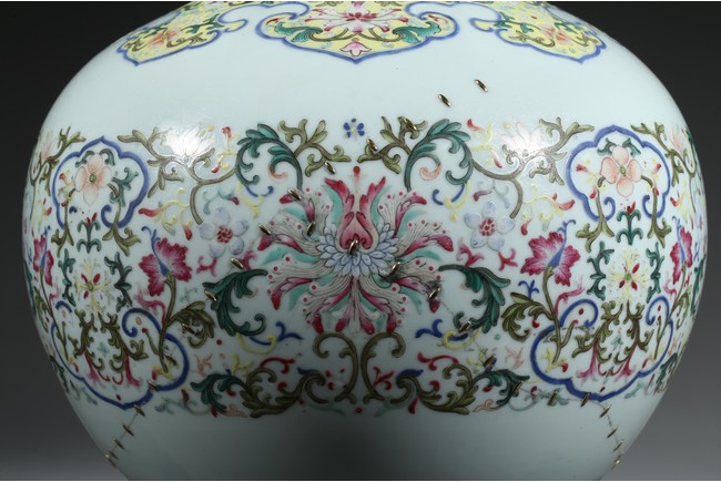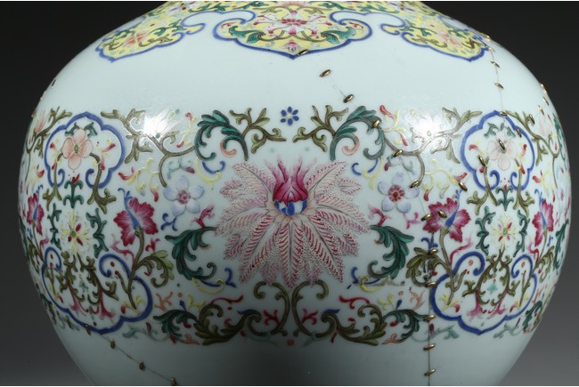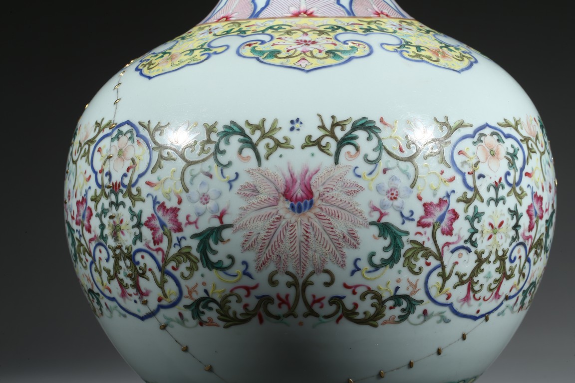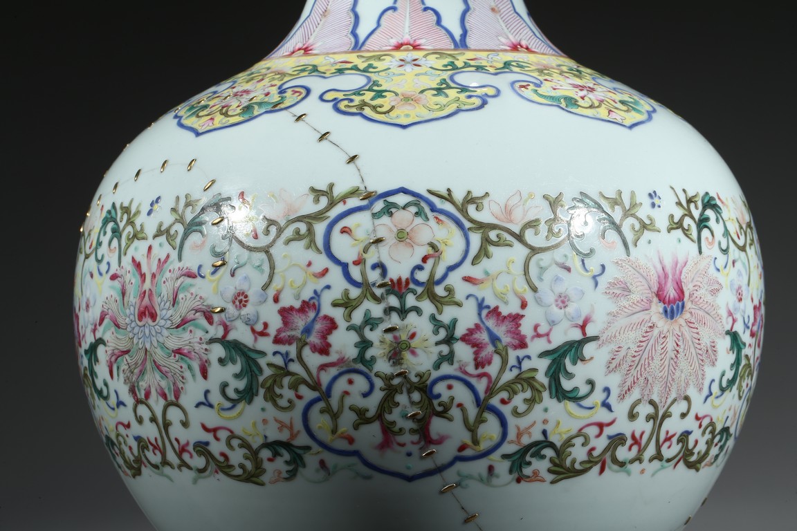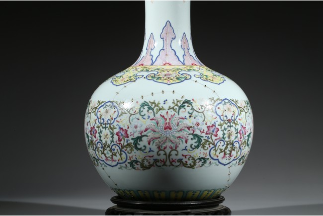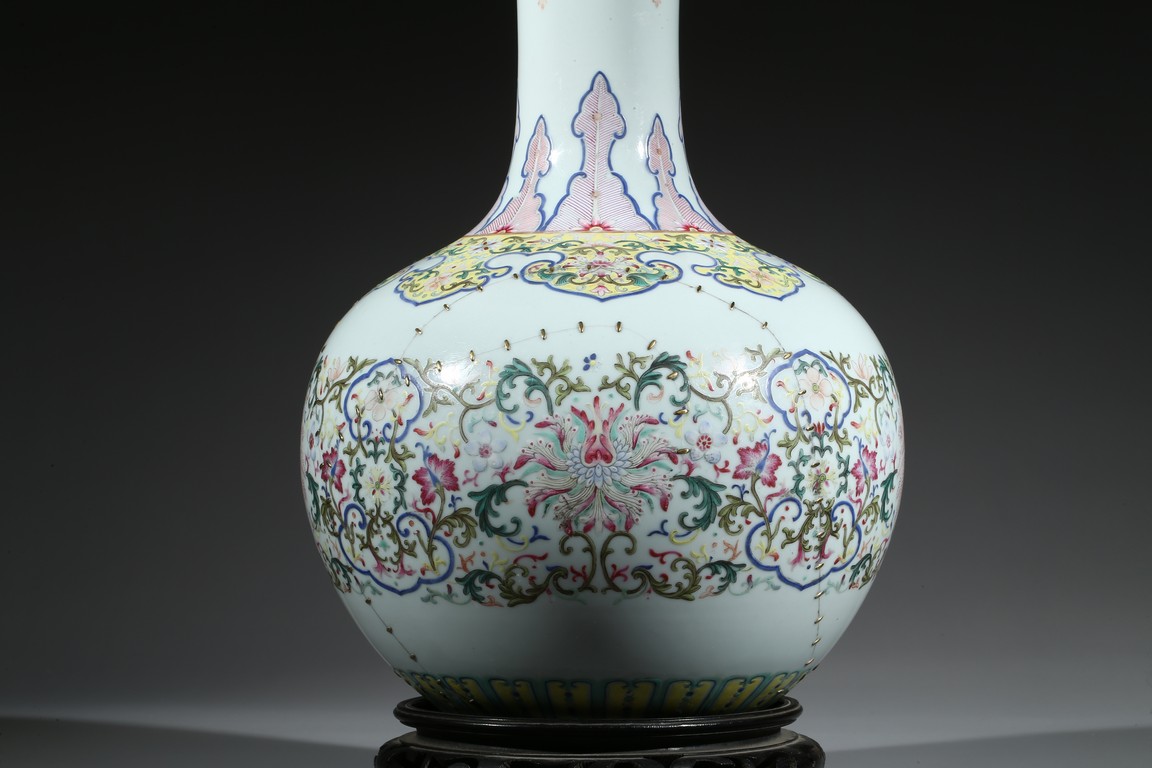 With a globular body rising to a tall cylindrical neck, the body finely enamelled with a band of stylized floral scrolls and four large flower blossoms, all below a band of ruyi shaped pattern, the neck further decorated with a band of lappet decorations, the base with six character Qianlong mark, with restoration. Qing Dynasty period.