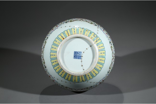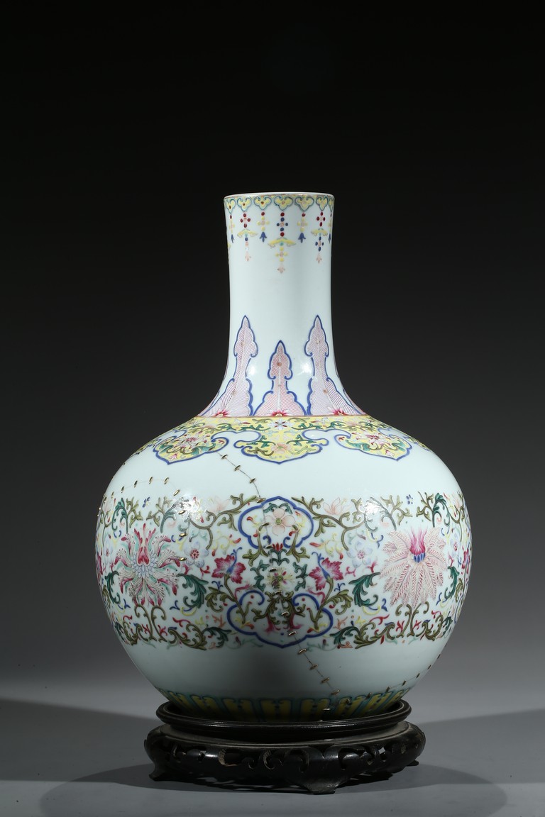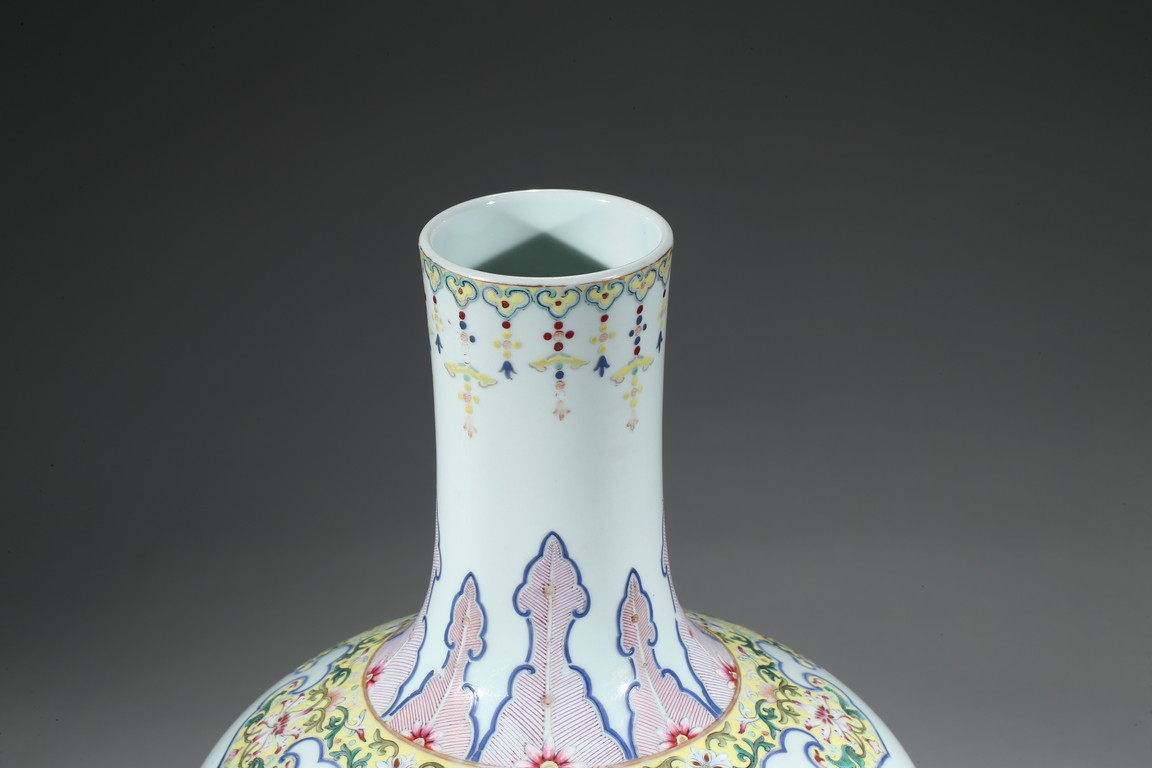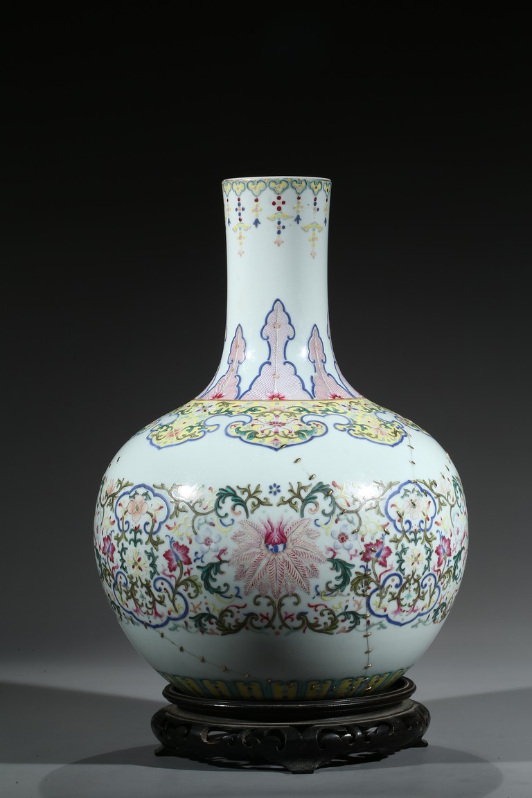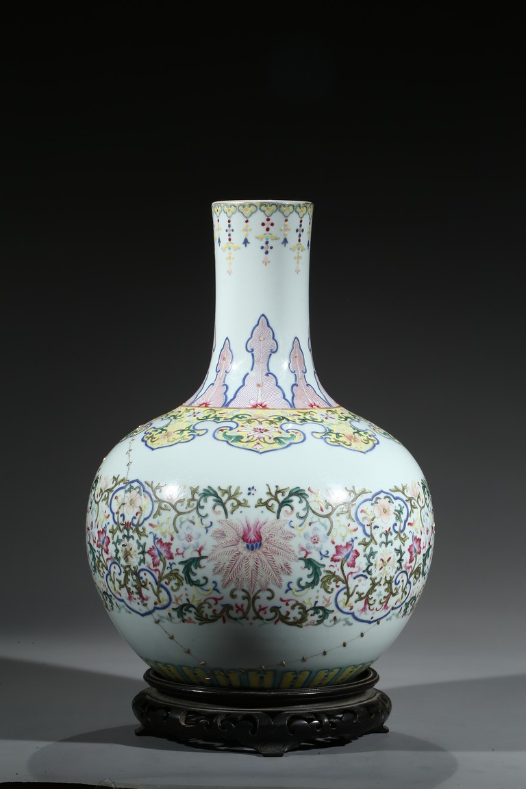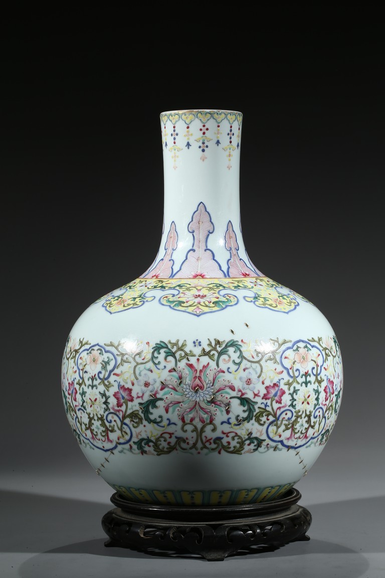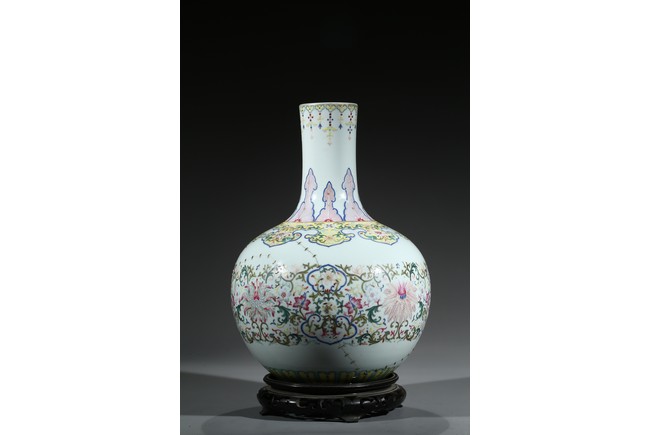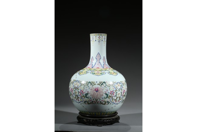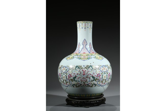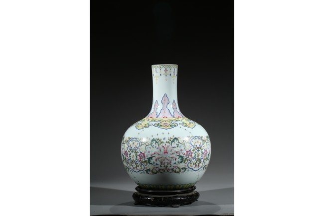 天球瓶創燒於明代永樂,宣德年間的景德鎮窯,多見青花。永樂朝開始成為觀賞式瓶,宣德年間較為流行。“天球瓶”為“千秋瓶”,象徵著“千秋太平”之意。因圓球腹碩大,似從天而降,故名天球瓶。清雍正、乾隆兩朝時值盛世,清朝皇室對永宣窯器的推崇致使摹古之風盛行,御窯廠承命竭力摹制,尤以雍正中期至乾隆早期最甚。其中天球瓶作為經典的永宣器類得到廣泛的摹制和創新,到達了“師古而不泥古,仿古而不忘新意”的境地。乾隆時期對天球瓶的摹制,延續燒製雍正時期的品種,有霽藍釉、青花、釉裡紅、青花釉裡紅、青花抹紅彩、粉彩、鬥彩等,存世實物較多,文獻上亦見多處檔案記載。