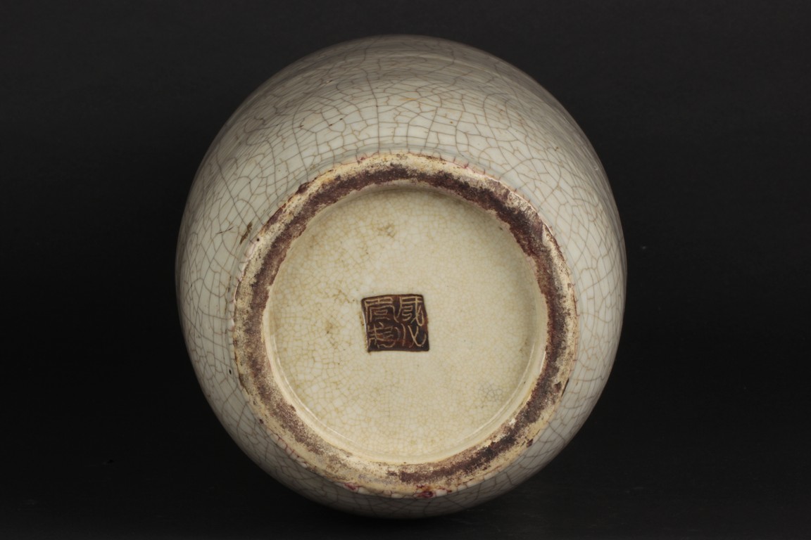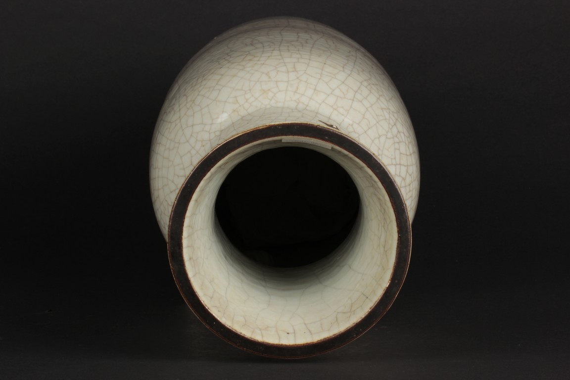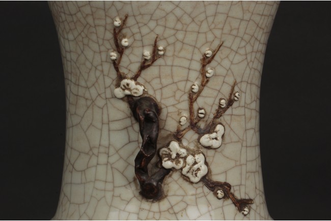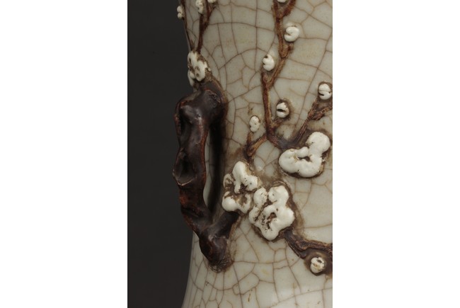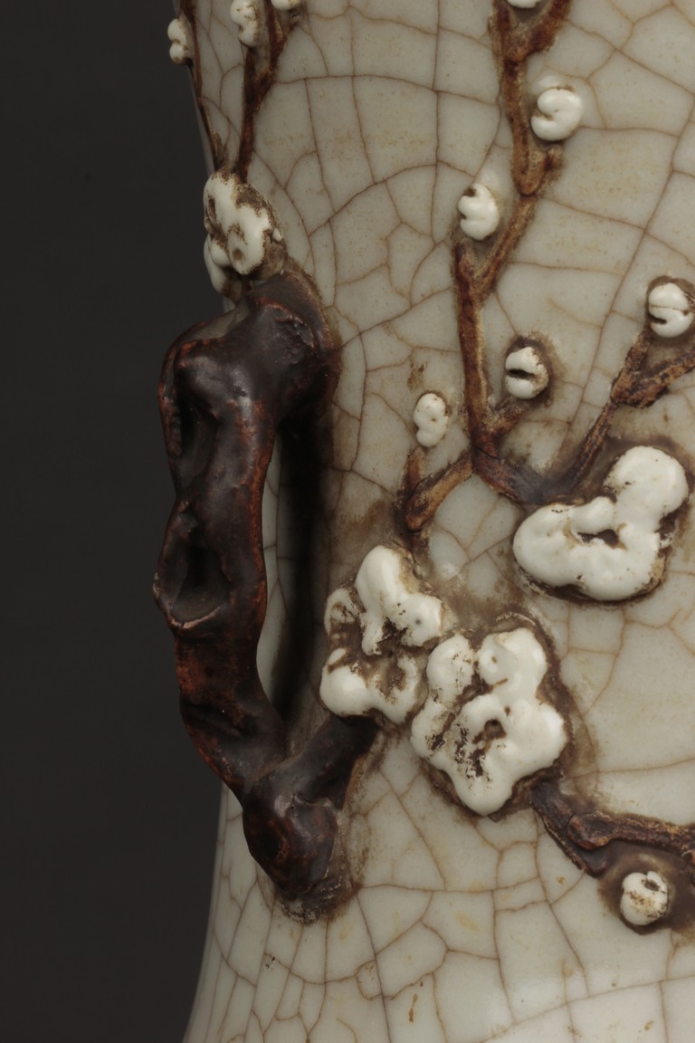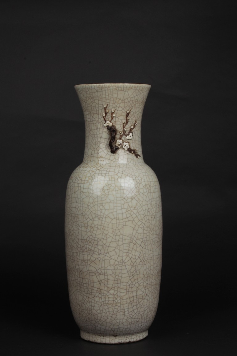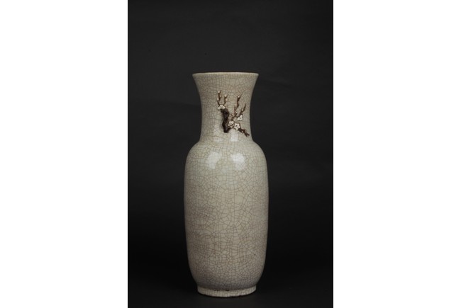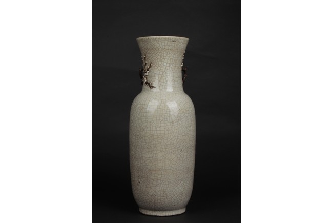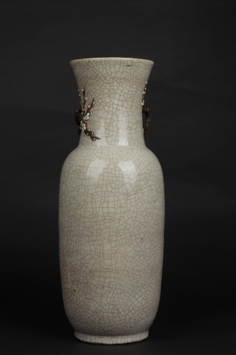 Of cylindrical form, the vase is raised on a straight foot and molded with a pair of prunus flower branch form handles applied to the tall neck, covered overall with an opaque pale grey glaze suffused with an irregular pattern of dark grey crackle, and bottom bears four character 'CHENGHUA' mark. Qing Dynasty period.